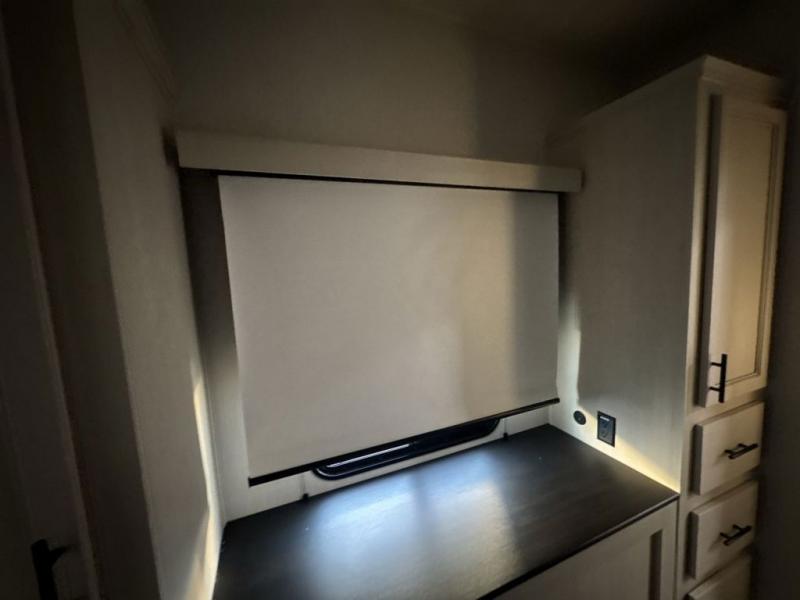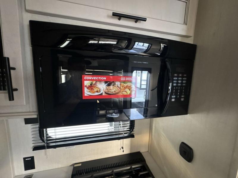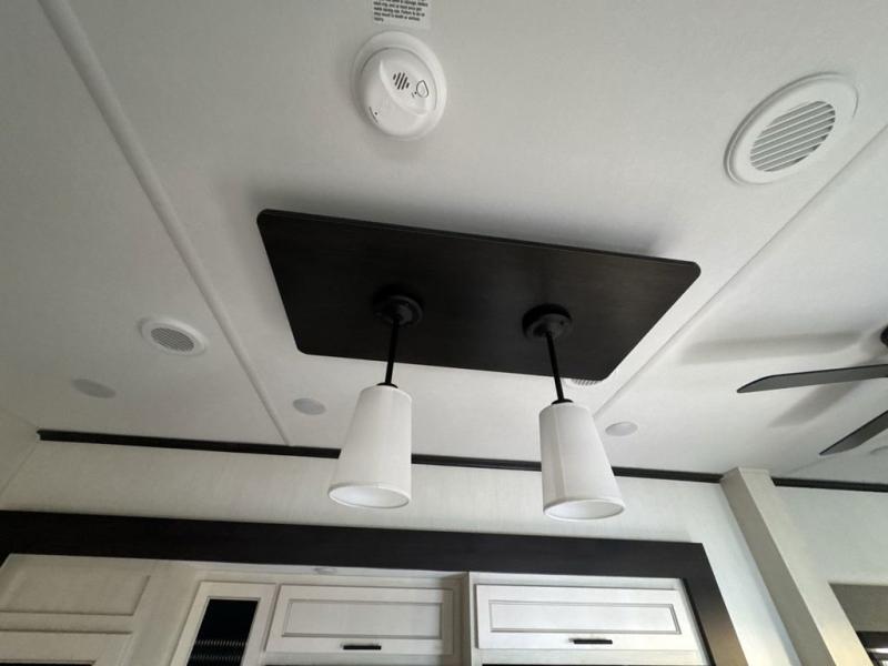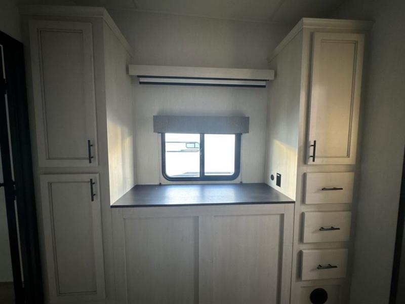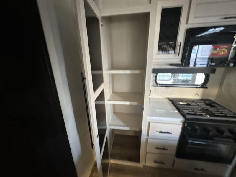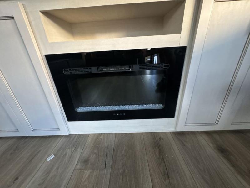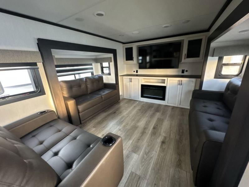 This Sabre fifth wheel with a full and half bath is sure to be a crowd pleaser! The front living area is the perfect place for everyone to visit each other comfortably on the two tri-fold sofas that can be transformed into extra sleeping spaces, or at the theater seating for complete relaxation. You will also find an entertainment center with a fireplace and a TV. This Sabre has a kitchen filled with convenient features, such as a residential size refrigerator, a kitchen island, and a kitchen pantry. The rear master suite has access to its very own full bathroom with a double-sink vanity for two to get ready at once, and a wardrobe with washer and dryer prep for convenience!