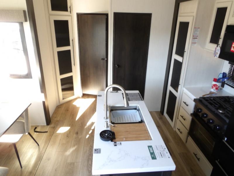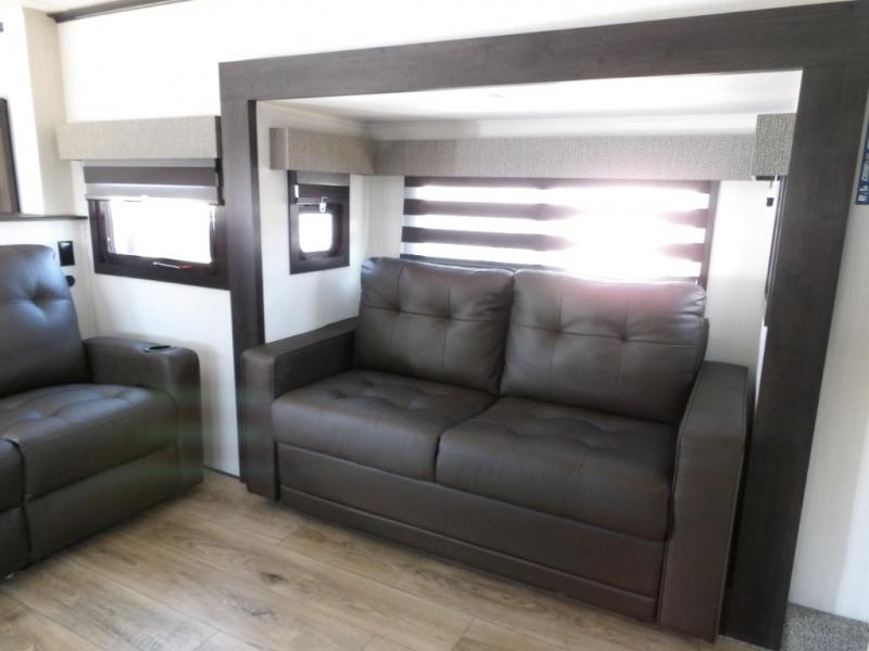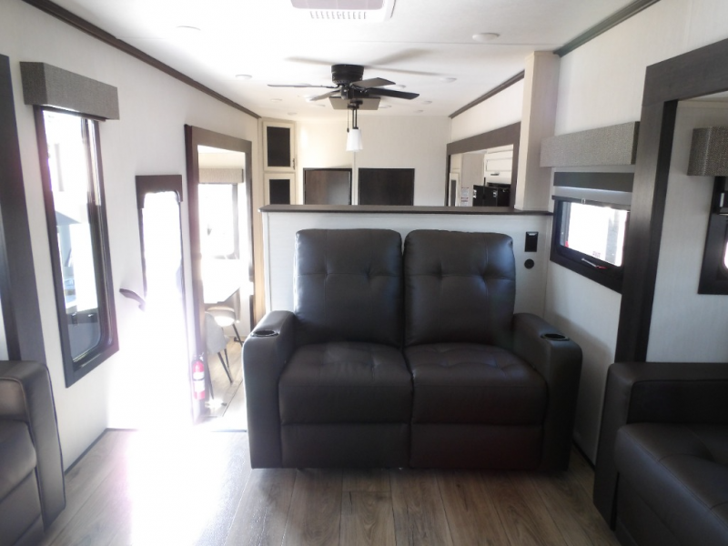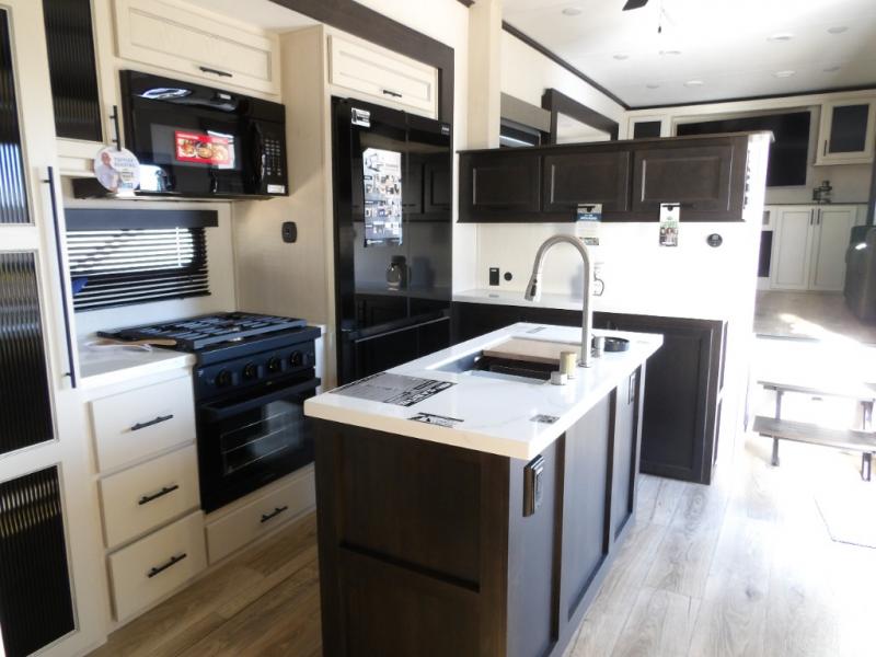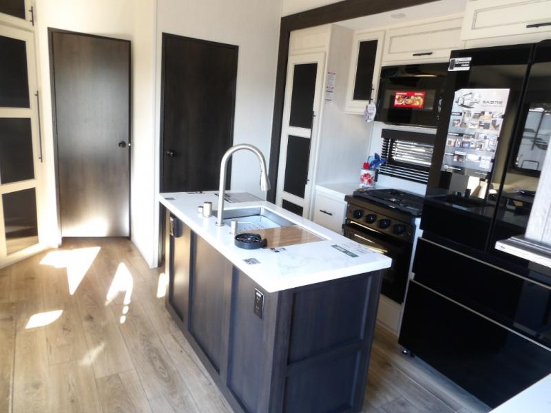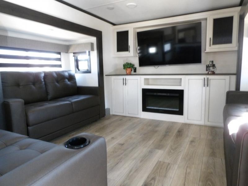 This Sabre fifth wheel with a full and half bath is sure to be a crowd pleaser! The front living area is the perfect place for everyone to visit each other comfortably on the two tri-fold sofas that can be transformed into extra sleeping spaces, or at the theater seating for complete relaxation. You will also find an entertainment center with a fireplace and a TV. This Sabre has a kitchen filled with convenient features, such as a residential size refrigerator, a kitchen island, and a kitchen pantry. The rear master suite has access to its very own full bathroom with a double-sink vanity for two to get ready at once, and a wardrobe with washer and dryer prep for convenience!