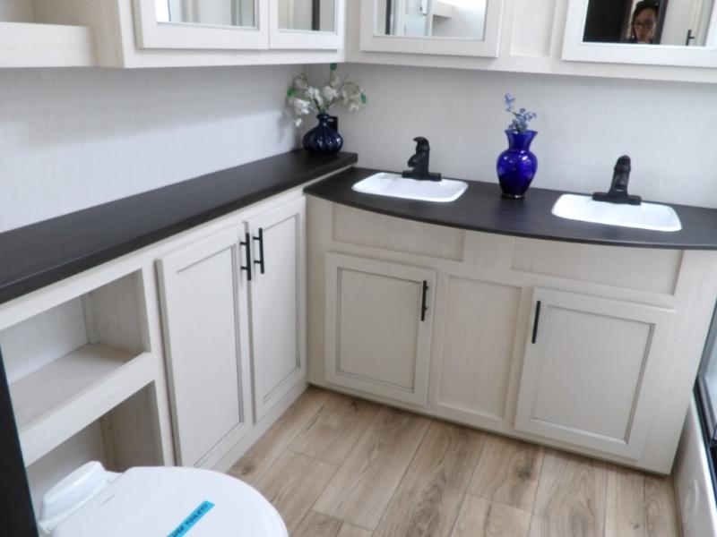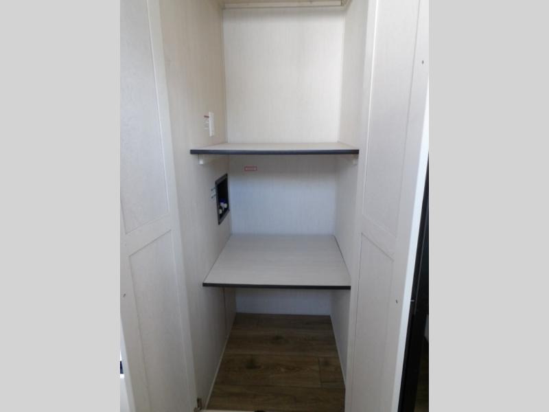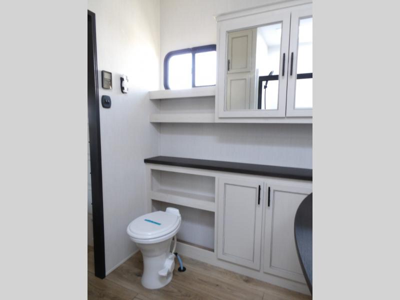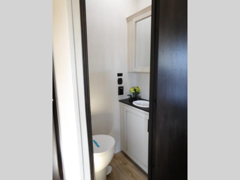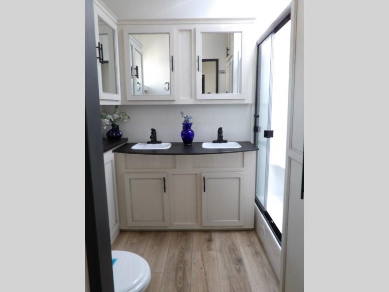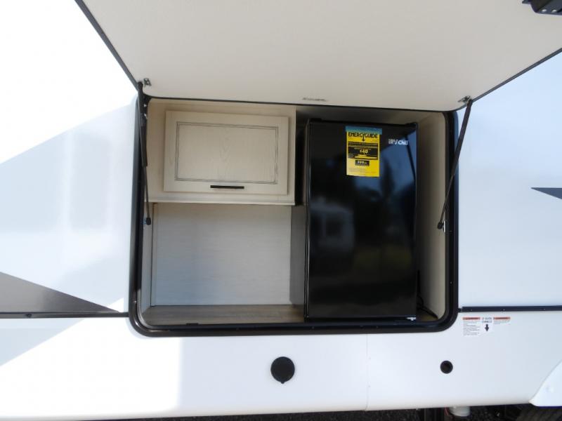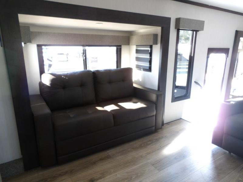 This Sabre fifth wheel with a full and half bath is sure to be a crowd pleaser! The front living area is the perfect place for everyone to visit each other comfortably on the two tri-fold sofas that can be transformed into extra sleeping spaces, or at the theater seating for complete relaxation. You will also find an entertainment center with a fireplace and a TV. This Sabre has a kitchen filled with convenient features, such as a residential size refrigerator, a kitchen island, and a kitchen pantry. The rear master suite has access to its very own full bathroom with a double-sink vanity for two to get ready at once, and a wardrobe with washer and dryer prep for convenience!