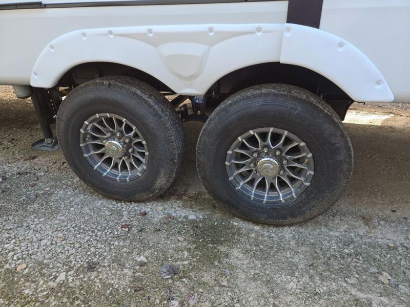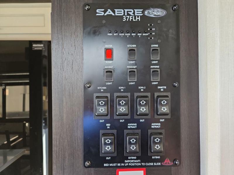 You will experience luxurious camping trips at an affordable price with any one of these Forest River Sabre fifth wheels! These models are durable and ready to travel anytime of the year thanks to features like the high-gloss gel-coat front cap with LED lighting, the PVC roof membrane, and the forced air underbelly with enclosed gate valves. The electric auto-leveling system makes setting up easy and safe, and the adjustable power awning with LED lighting will create an inviting outdoor living space. Each model includes a universal docking station which includes a black tank flush and an outside shower, and adjustable stable steps for you to enter and exit the unit safely. Inside, you will love the design of the ambient accent lighting in the living area, the real wood lumbercore cabinetry, and the linoleum flooring!