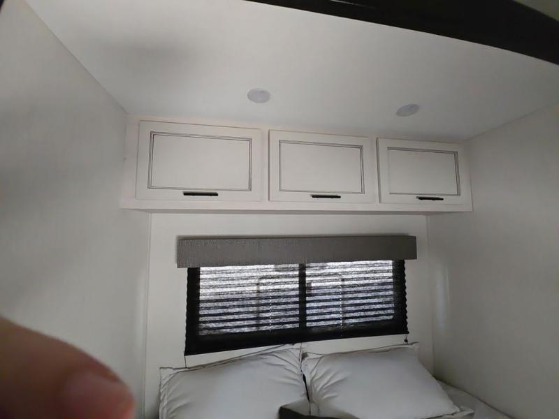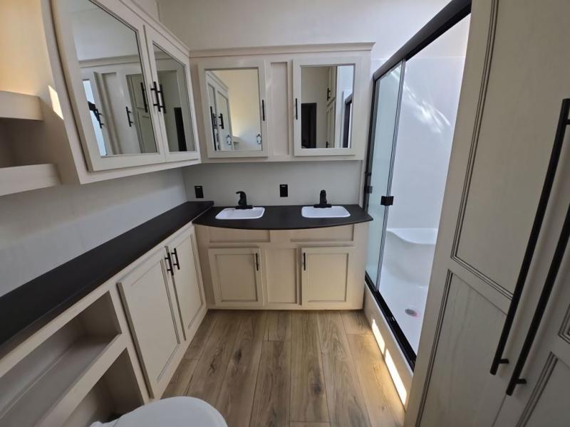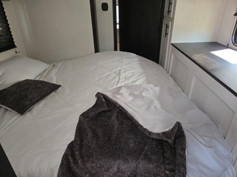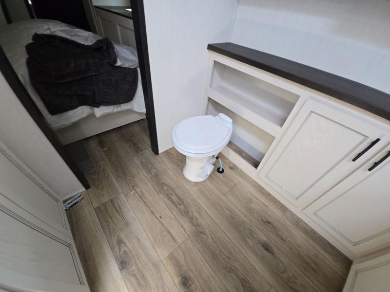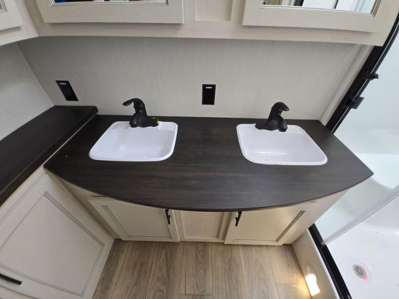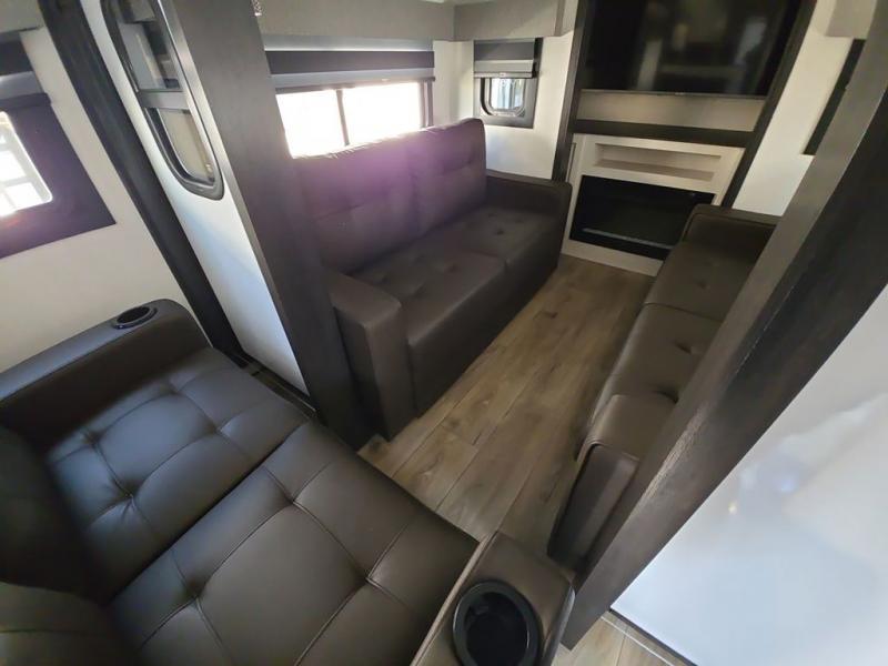 This Sabre fifth wheel with a full and half bath is sure to be a crowd pleaser! The front living area is the perfect place for everyone to visit each other comfortably on the two tri-fold sofas that can be transformed into extra sleeping spaces, or at the theater seating for complete relaxation. You will also find an entertainment center with a fireplace and a TV. This Sabre has a kitchen filled with convenient features, such as a residential size refrigerator, a kitchen island, and a kitchen pantry. The rear master suite has access to its very own full bathroom with a double-sink vanity for two to get ready at once, and a wardrobe with washer and dryer prep for convenience!
