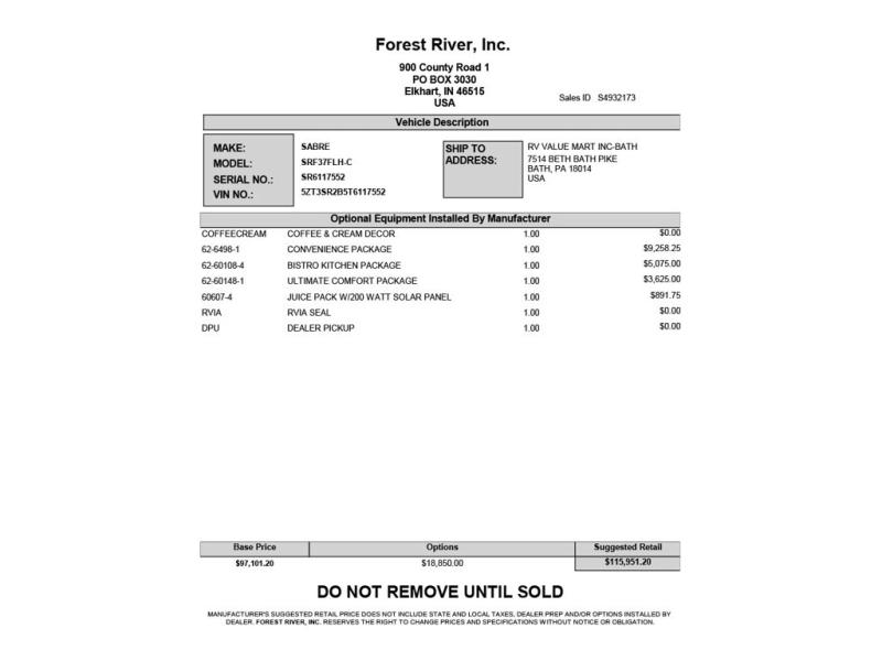 Forest River Sabre fifth wheel 37FLH highlights: