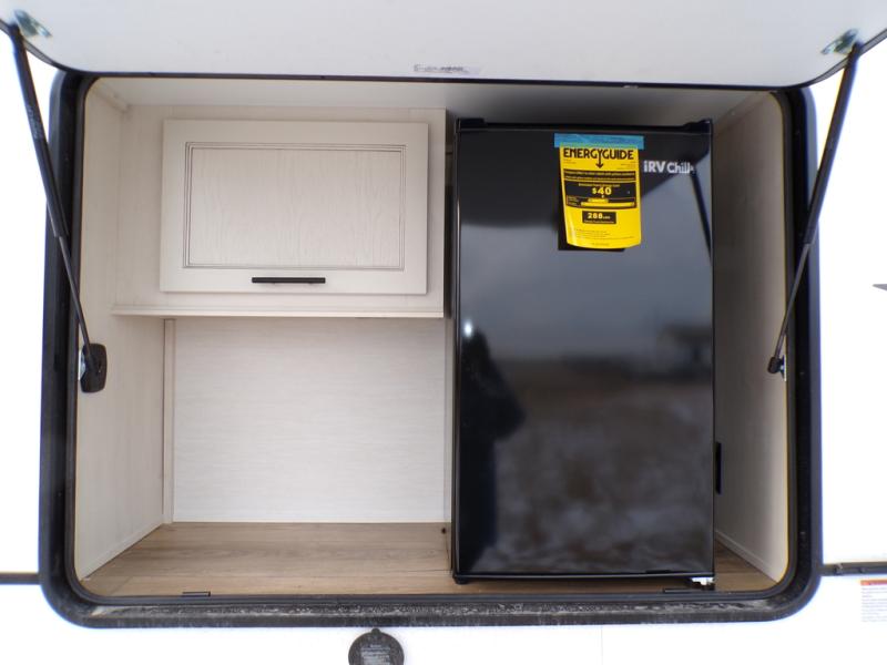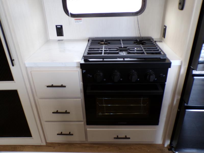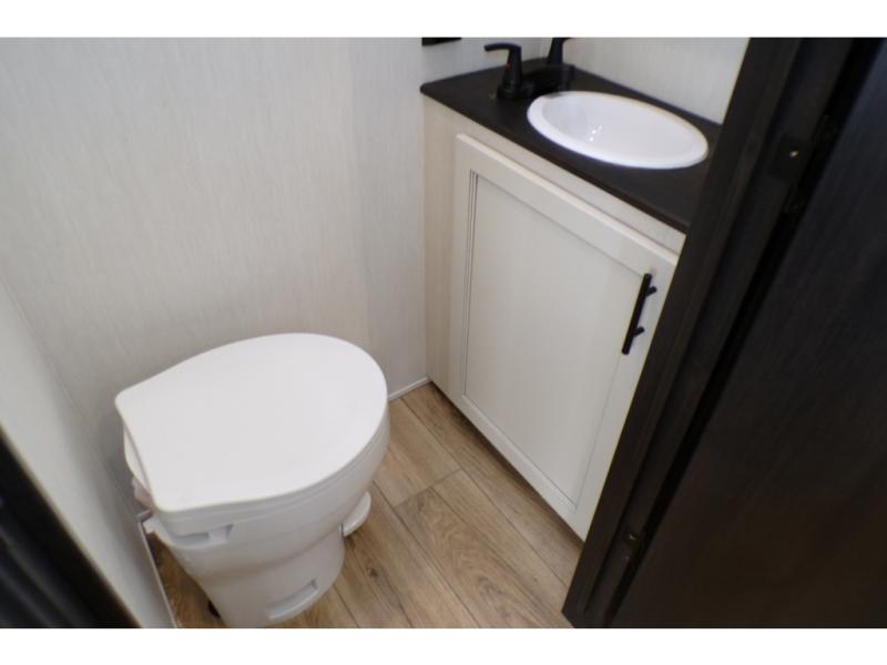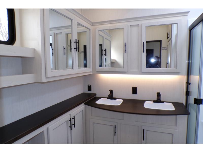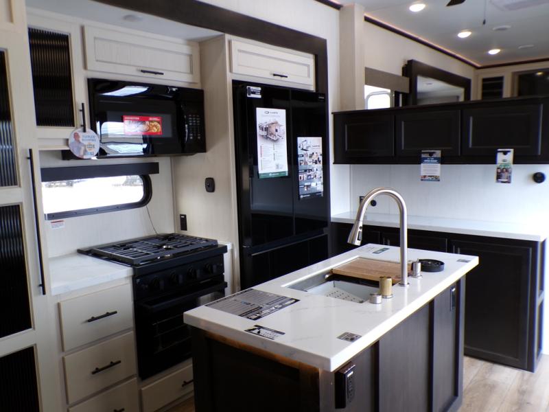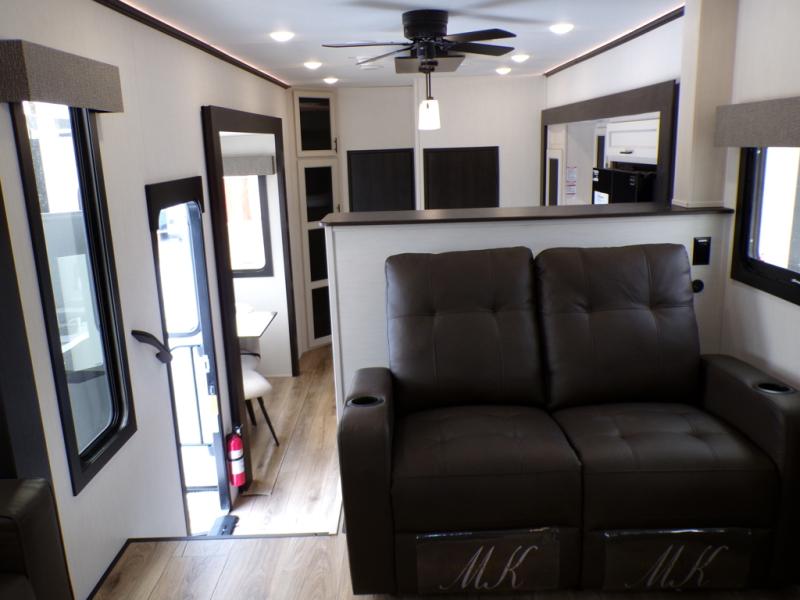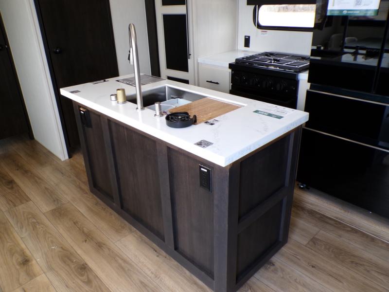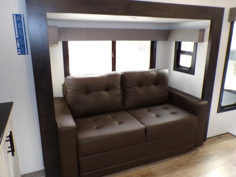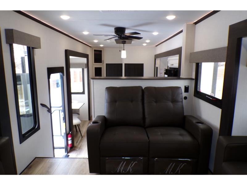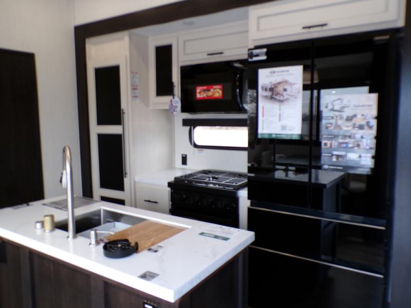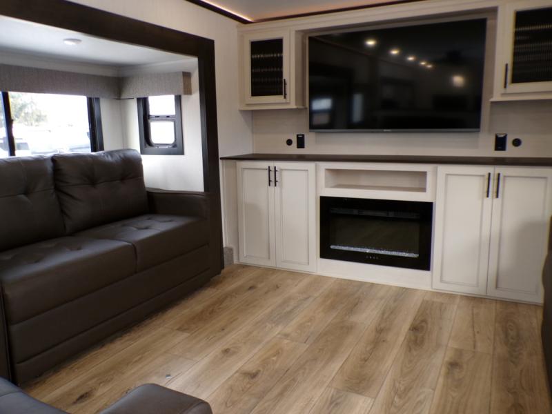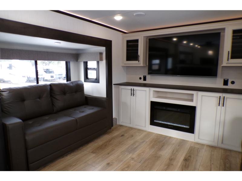 This Sabre fifth wheel with a full and half bath is sure to be a crowd pleaser! The front living area is the perfect place for everyone to visit each other comfortably on the two tri-fold sofas that can be transformed into extra sleeping spaces, or at the theater seating for complete relaxation. You will also find an entertainment center with a fireplace and a TV. This Sabre has a kitchen filled with convenient features, such as a residential size refrigerator, a kitchen island, and a kitchen pantry. The rear master suite has access to its very own full bathroom with a double-sink vanity for two to get ready at once, and a wardrobe with washer and dryer prep for convenience!