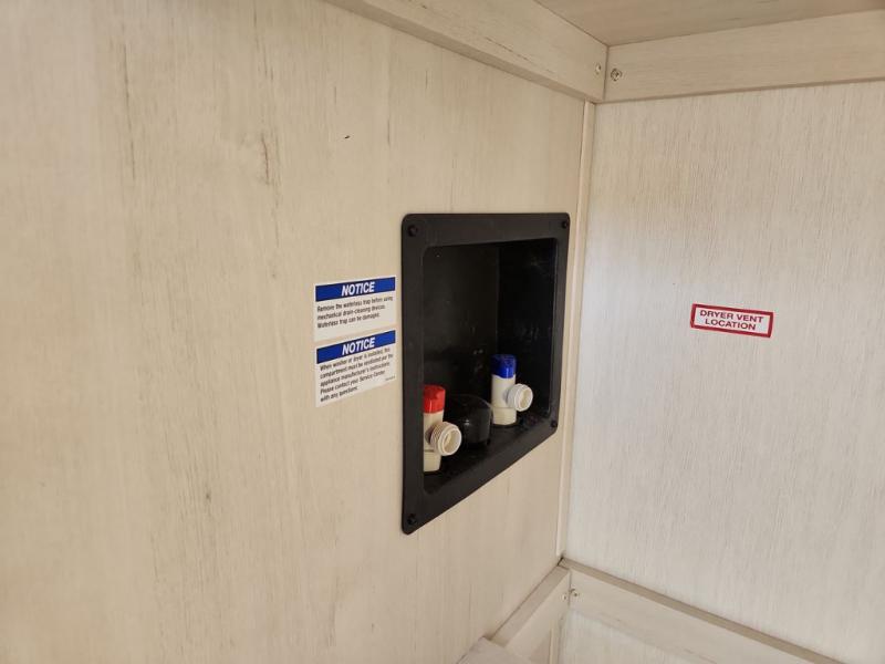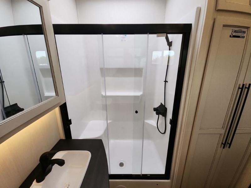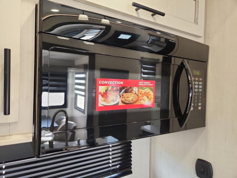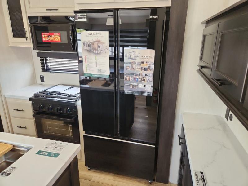 This Sabre fifth wheel with a full and half bath is sure to be a crowd pleaser! The front living area is the perfect place for everyone to visit each other comfortably on the two tri-fold sofas that can be transformed into extra sleeping spaces, or at the theater seating for complete relaxation. You will also find an entertainment center with a fireplace and a TV. This Sabre has a kitchen filled with convenient features, such as a residential size refrigerator, a kitchen island, and a kitchen pantry. The rear master suite has access to its very own full bathroom with a double-sink vanity for two to get ready at once, and a wardrobe with washer and dryer prep for convenience!