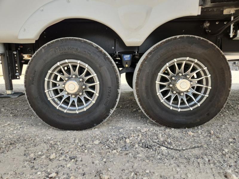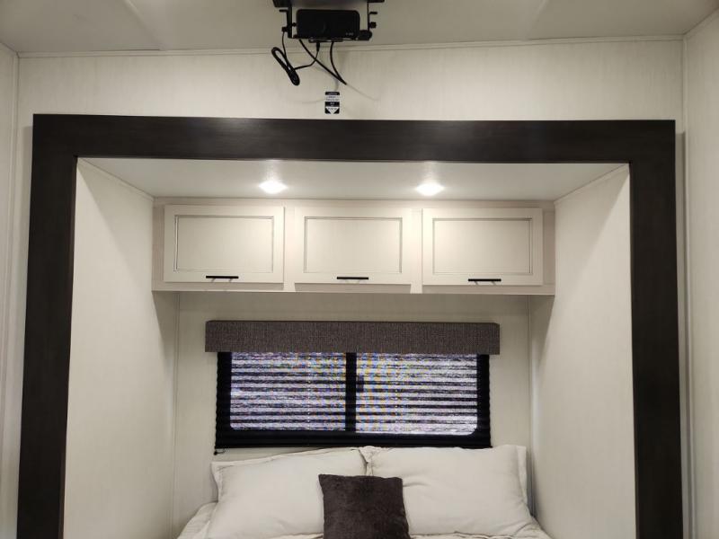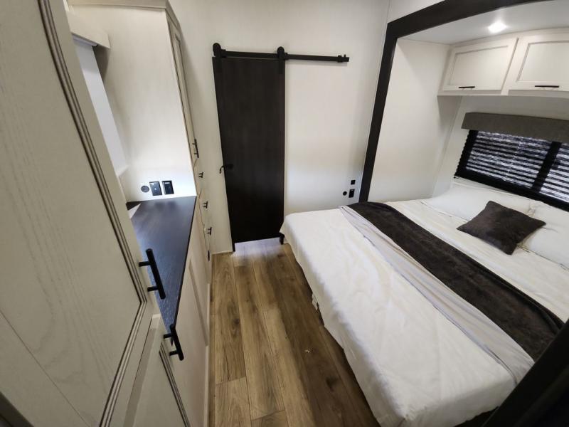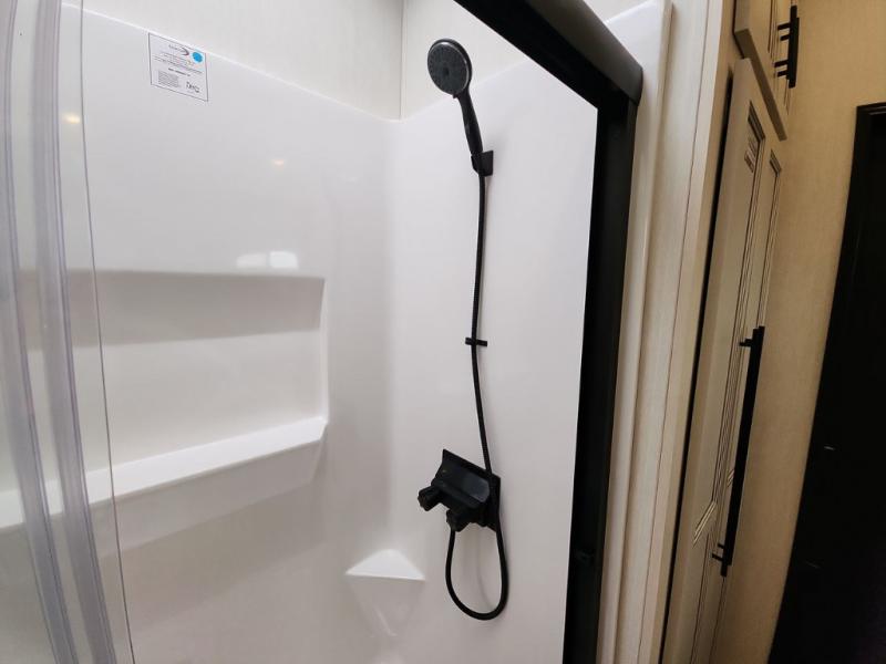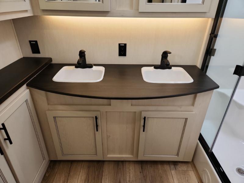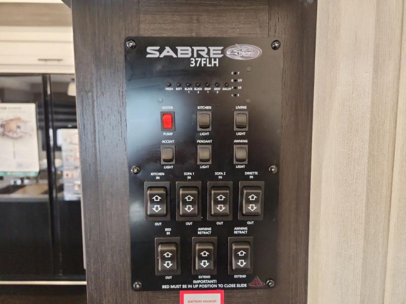 You will experience luxurious camping trips at an affordable price with any one of these Forest River Sabre fifth wheels! These models are durable and ready to travel anytime of the year thanks to features like the high-gloss gel-coat front cap with LED lighting, the PVC roof membrane, and the forced air underbelly with enclosed gate valves. The electric auto-leveling system makes setting up easy and safe, and the adjustable power awning with LED lighting will create an inviting outdoor living space. Each model includes a universal docking station which includes a black tank flush and an outside shower, and adjustable stable steps for you to enter and exit the unit safely. Inside, you will love the design of the ambient accent lighting in the living area, the real wood lumbercore cabinetry, and the linoleum flooring!