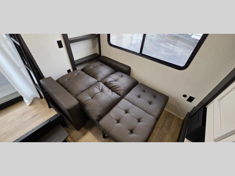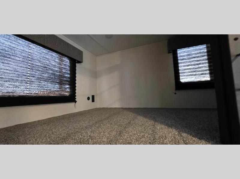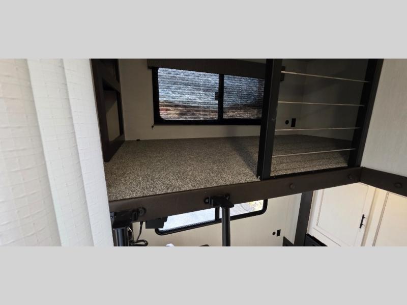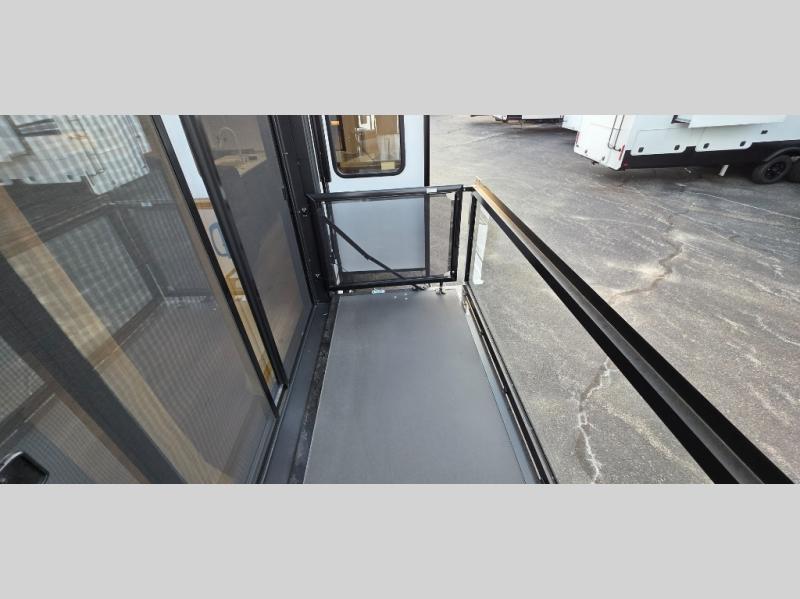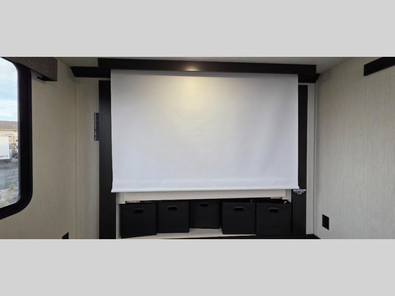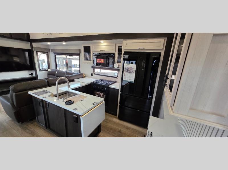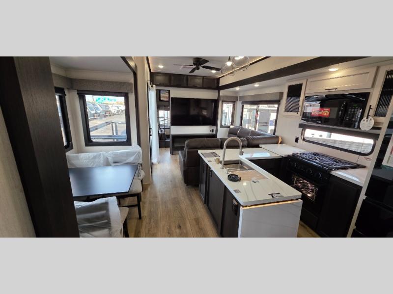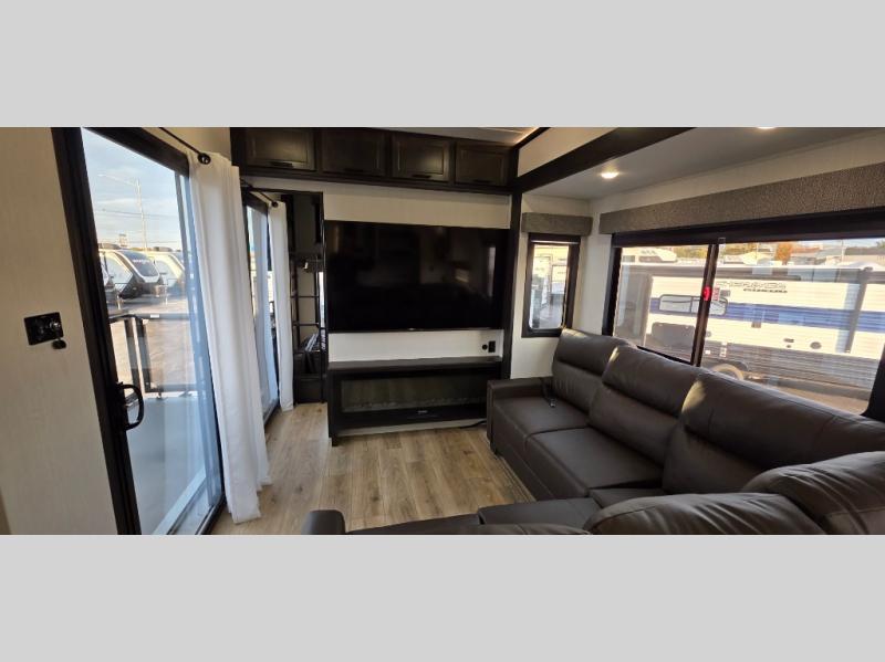 This is the perfect fifth wheel if you enjoy camping with friends and family! You'll have the front private bedroom with a camper king bed slide all to yourselves, while your guests take the rear den. There is a tri-fold sofa here, along with a wardrobe with a desk, additional shelves plus a loft above this room for even more sleeping or storage space! The main living room features an L-shaped sectional sofa with a large ottoman, a fireplace and an entertainment center. And the patio deck with a 12' awning is right off of this room so you can visit with friends indoors or outdoors! There is generous counter space in the full kitchen, along with a pull-out storage drawer and a free-standing table with four chairs. There are many more stand-out features found in this fifth wheel, including washer and dryer prep in the front bedroom, a 70" projector screen in the rear den, a second power awning, and the list goes on!