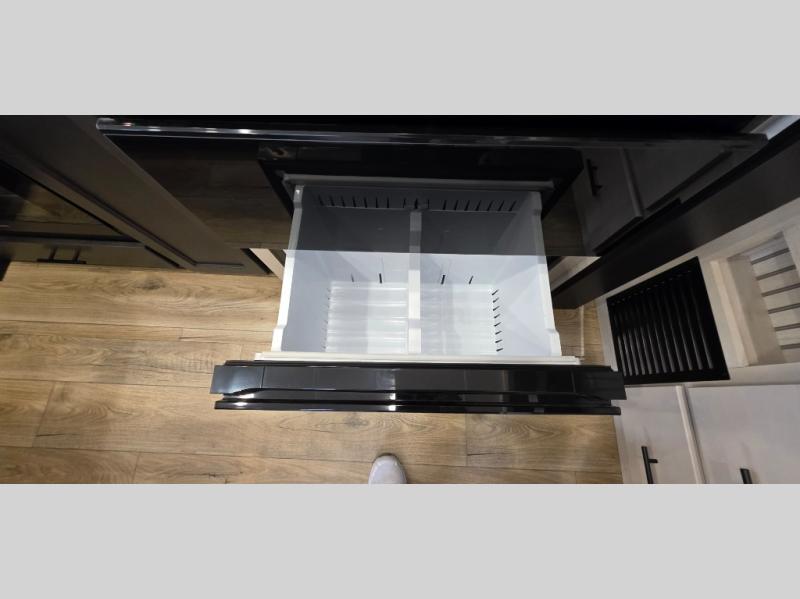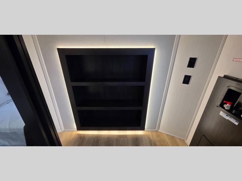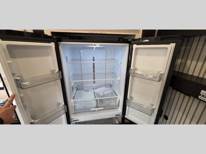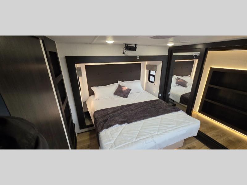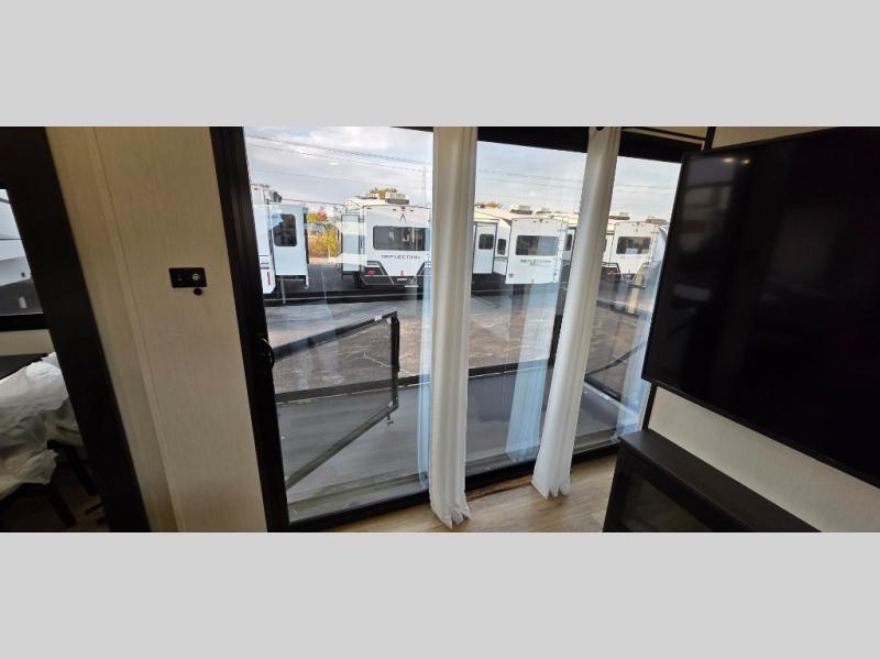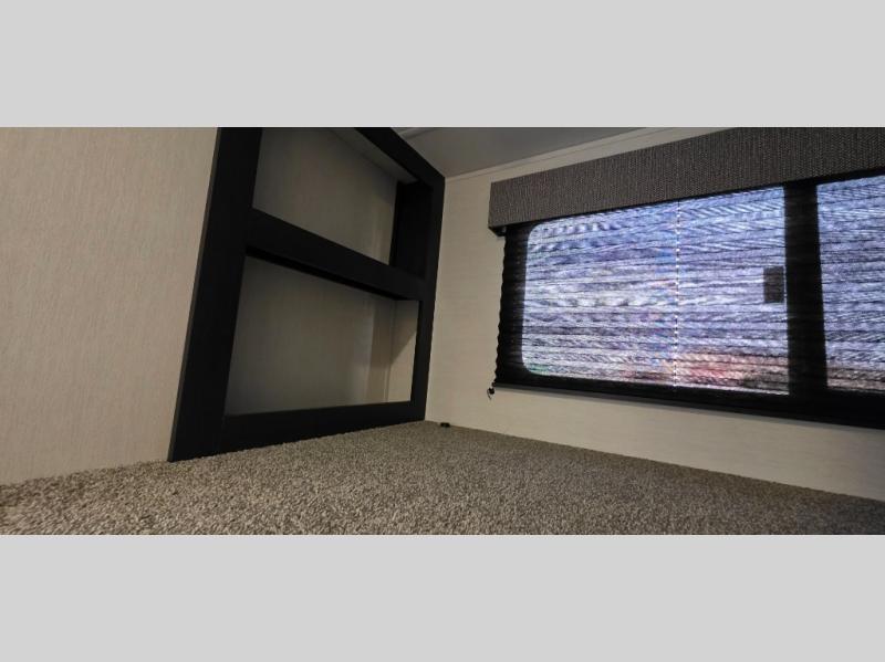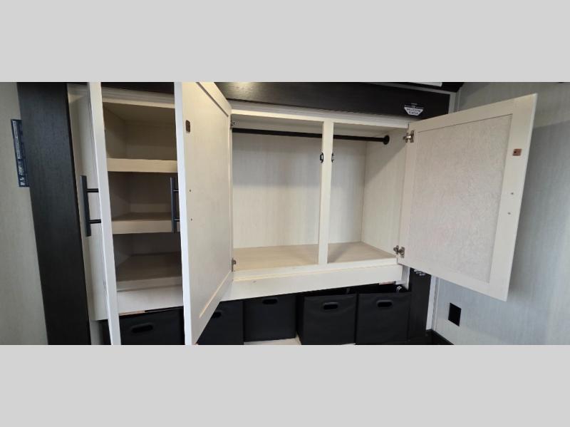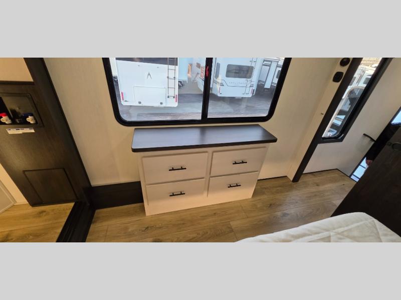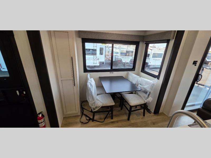 This is the perfect fifth wheel if you enjoy camping with friends and family! You'll have the front private bedroom with a camper king bed slide all to yourselves, while your guests take the rear den. There is a tri-fold sofa here, along with a wardrobe with a desk, additional shelves plus a loft above this room for even more sleeping or storage space! The main living room features an L-shaped sectional sofa with a large ottoman, a fireplace and an entertainment center. And the patio deck with a 12' awning is right off of this room so you can visit with friends indoors or outdoors! There is generous counter space in the full kitchen, along with a pull-out storage drawer and a free-standing table with four chairs. There are many more stand-out features found in this fifth wheel, including washer and dryer prep in the front bedroom, a 70" projector screen in the rear den, a second power awning, and the list goes on!