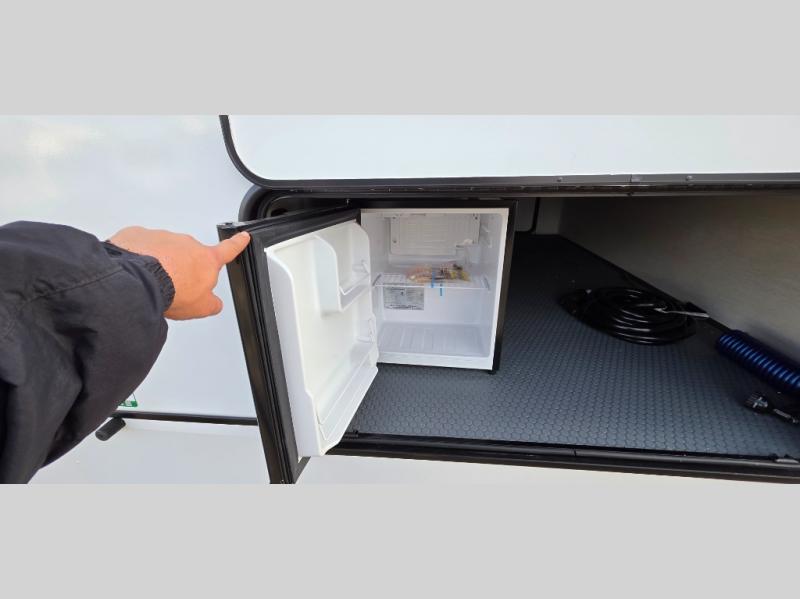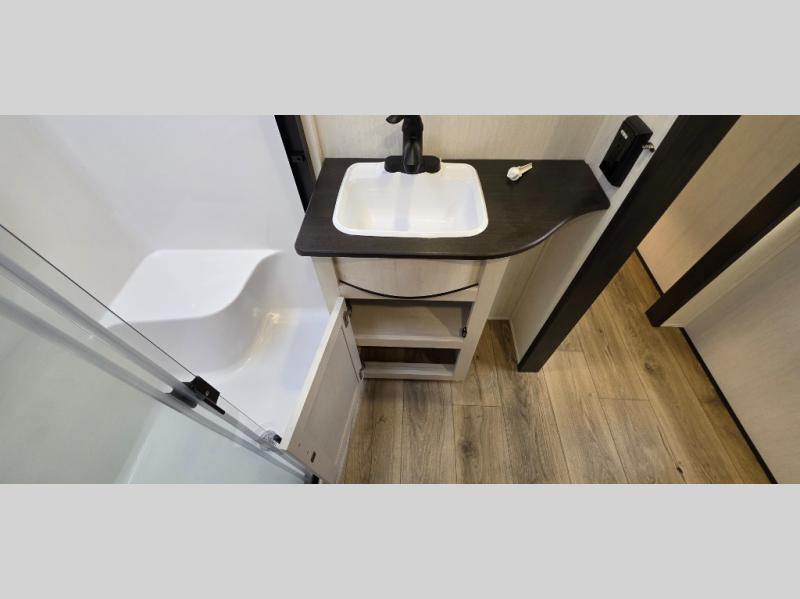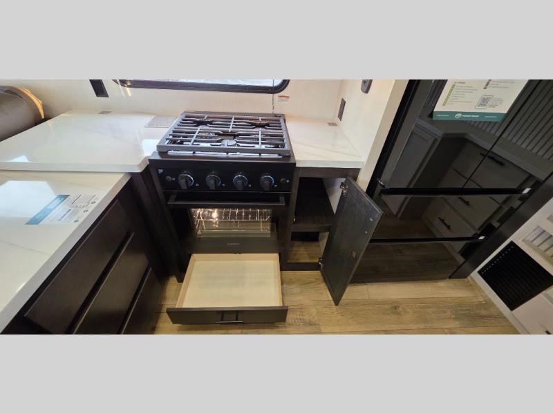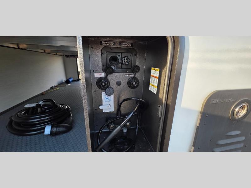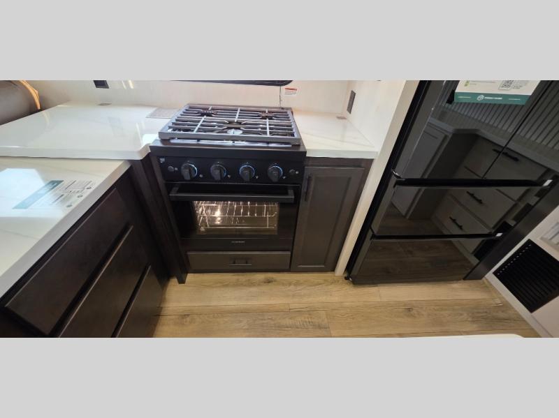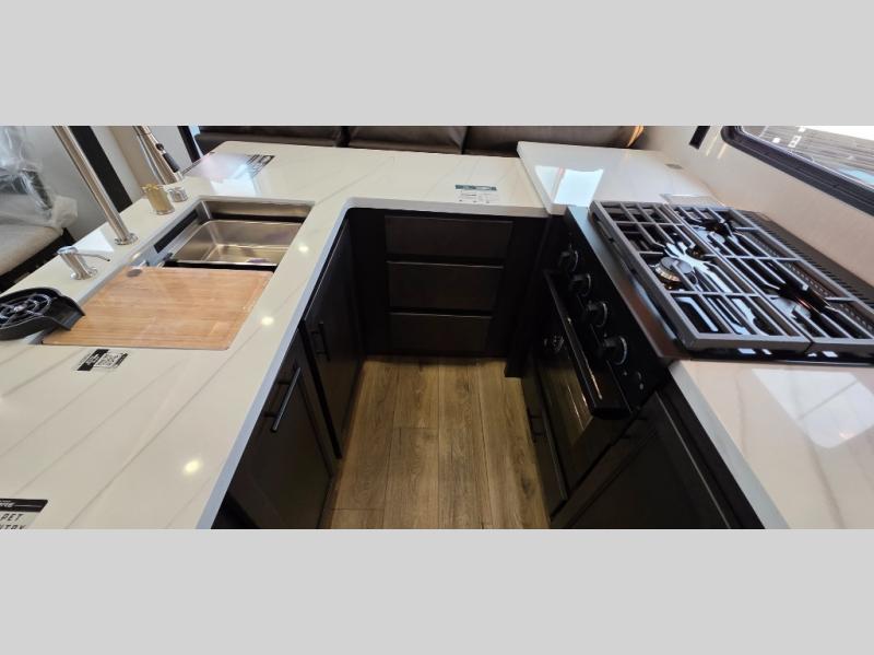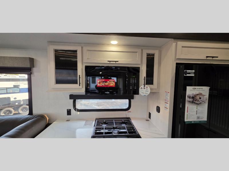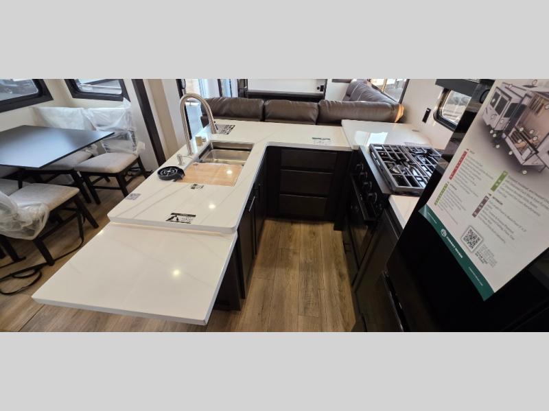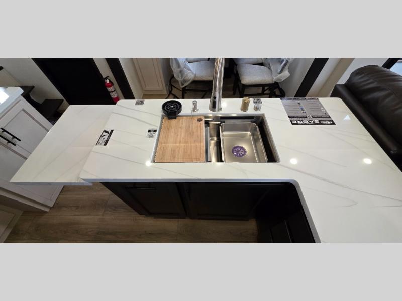 You will experience luxurious camping trips at an affordable price with any one of these Forest River Sabre fifth wheels! These models are durable and ready to travel anytime of the year thanks to features like the high-gloss gel-coat front cap with LED lighting, the PVC roof membrane, and the forced air underbelly with enclosed gate valves. The electric auto-leveling system makes setting up easy and safe, and the adjustable power awning with LED lighting will create an inviting outdoor living space. Each model includes a universal docking station which includes a black tank flush and an outside shower, and detachable and adjustable stable steps for you to enter and exit the unit safely. Inside, you will love the design of the ambient accent lighting in the living area, the real wood lumbercore cabinetry, and the linoleum flooring!