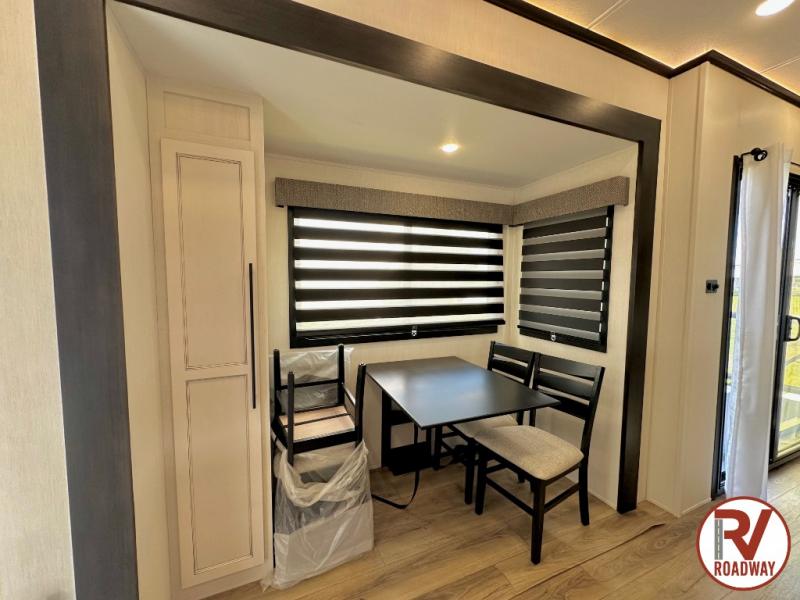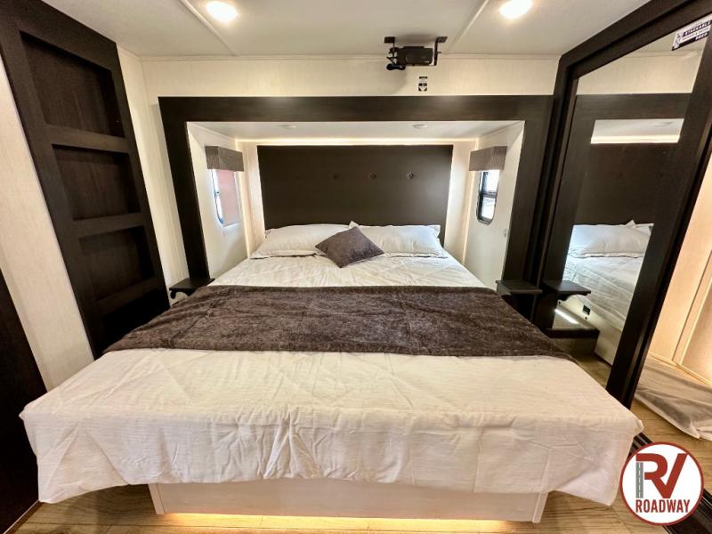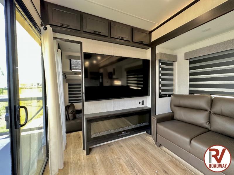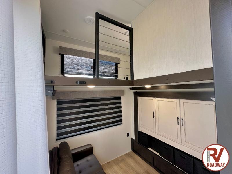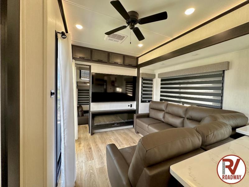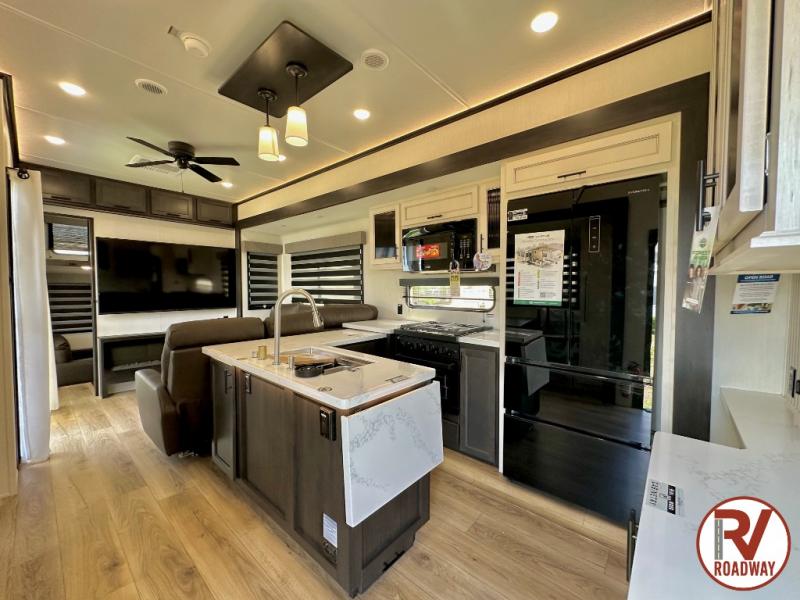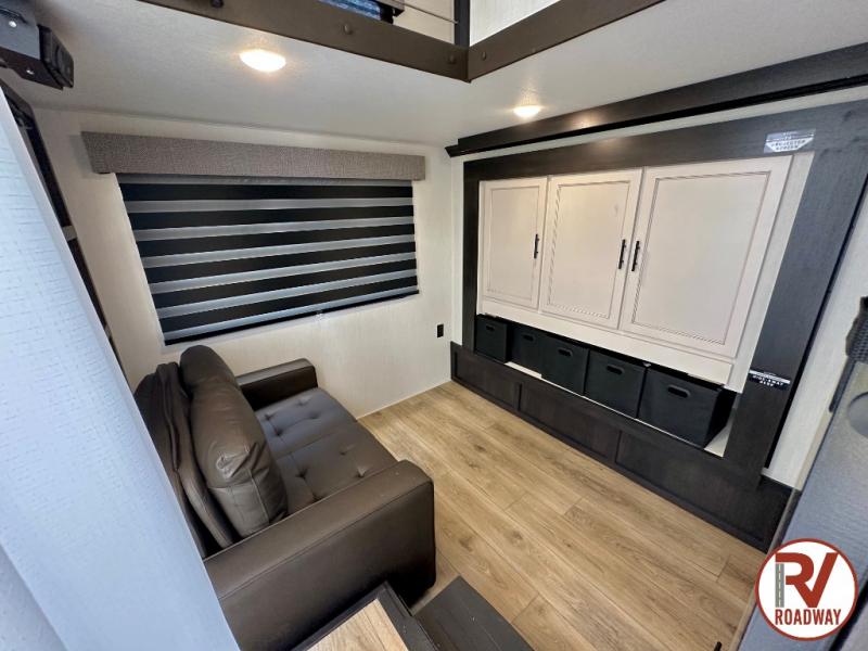 This is the perfect fifth wheel if you enjoy camping with friends and family! You'll have the front private bedroom with a camper king bed slide all to yourselves, while your guests take the rear den. There is a tri-fold sofa here, along with a wardrobe with a desk, additional shelves plus a loft above this room for even more sleeping or storage space! The main living room features an L-shaped sectional sofa with a large ottoman, a fireplace and an entertainment center. And the patio deck with a 12' awning is right off of this room so you can visit with friends indoors or outdoors! There is generous counter space in the full kitchen, along with a pull-out storage drawer and a free-standing table with four chairs. There are many more stand-out features found in this fifth wheel, including washer and dryer prep in the front bedroom, a 70" projector screen in the rear den, a second power awning, and the list goes on!
