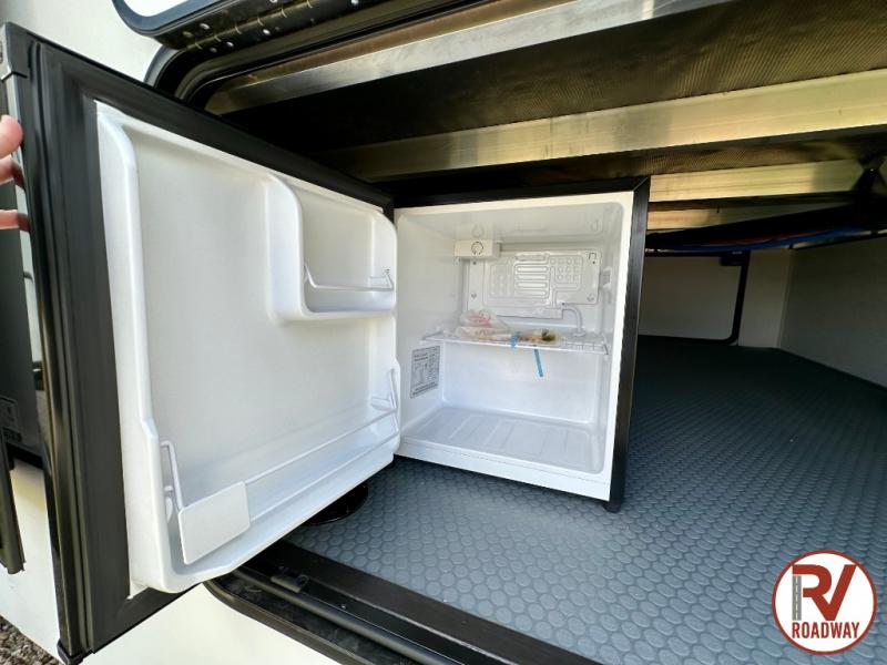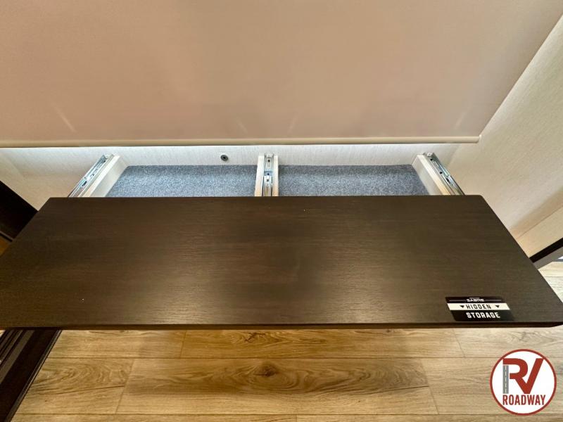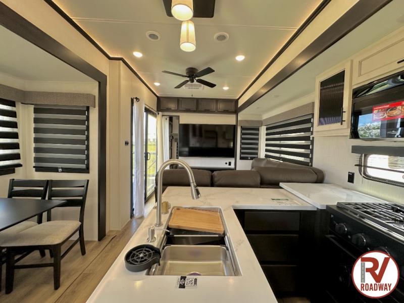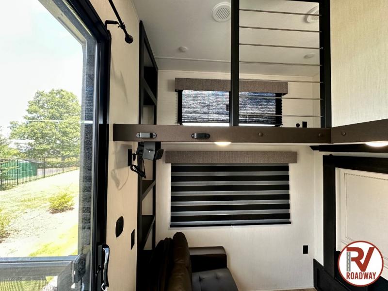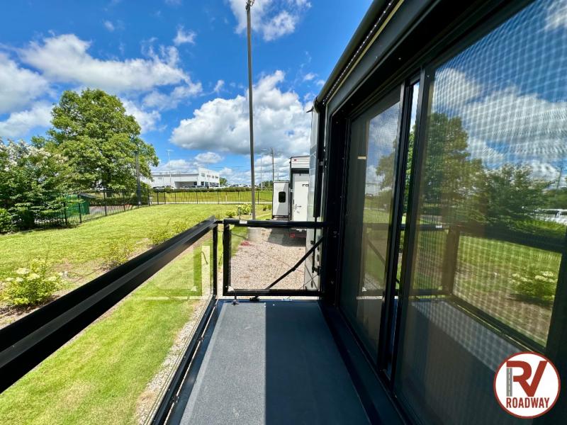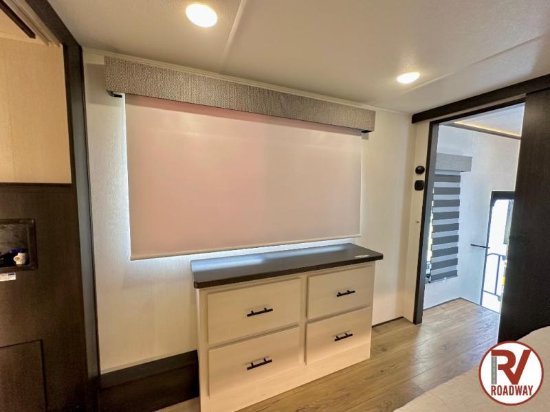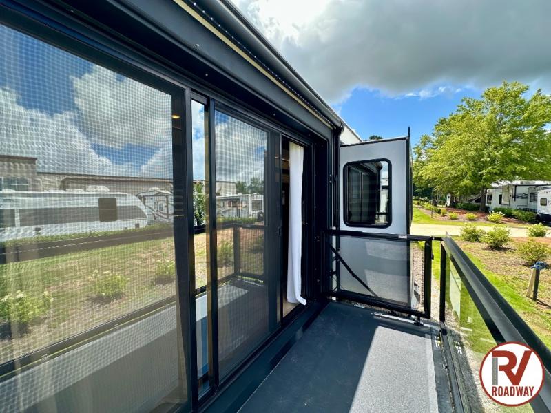 This is the perfect fifth wheel if you enjoy camping with friends and family! You'll have the front private bedroom with a camper king bed slide all to yourselves, while your guests take the rear den. There is a tri-fold sofa here, along with a wardrobe with a desk, additional shelves plus a loft above this room for even more sleeping or storage space! The main living room features an L-shaped sectional sofa with a large ottoman, a fireplace and an entertainment center. And the patio deck with a 12' awning is right off of this room so you can visit with friends indoors or outdoors! There is generous counter space in the full kitchen, along with a pull-out storage drawer and a free-standing table with four chairs. There are many more stand-out features found in this fifth wheel, including washer and dryer prep in the front bedroom, a 70" projector screen in the rear den, a second power awning, and the list goes on!