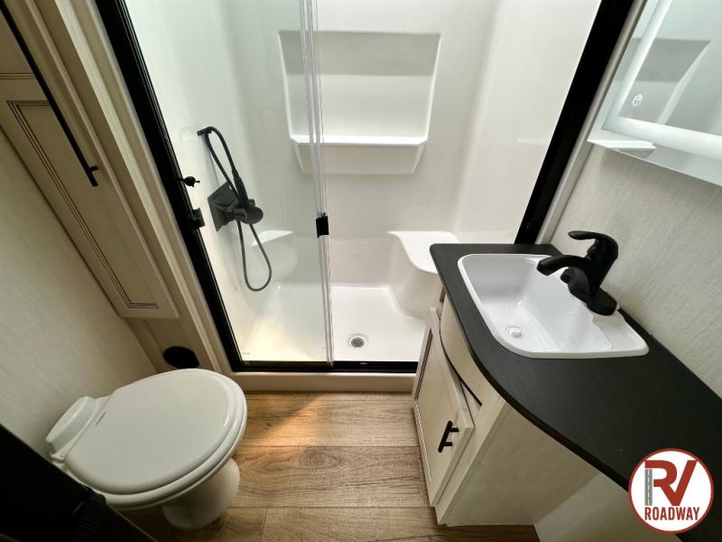 You will experience luxurious camping trips at an affordable price with any one of these Forest River Sabre fifth wheels! These models are durable and ready to travel anytime of the year thanks to features like the high-gloss gel-coat front cap with LED lighting, the PVC roof membrane, and the forced air underbelly with enclosed gate valves. The electric auto-leveling system makes setting up easy and safe, and the adjustable power awning with LED lighting will create an inviting outdoor living space. Each model includes a universal docking station which includes a black tank flush and an outside shower, and detachable and adjustable stable steps for you to enter and exit the unit safely. Inside, you will love the design of the ambient accent lighting in the living area, the real wood lumbercore cabinetry, and the linoleum flooring!