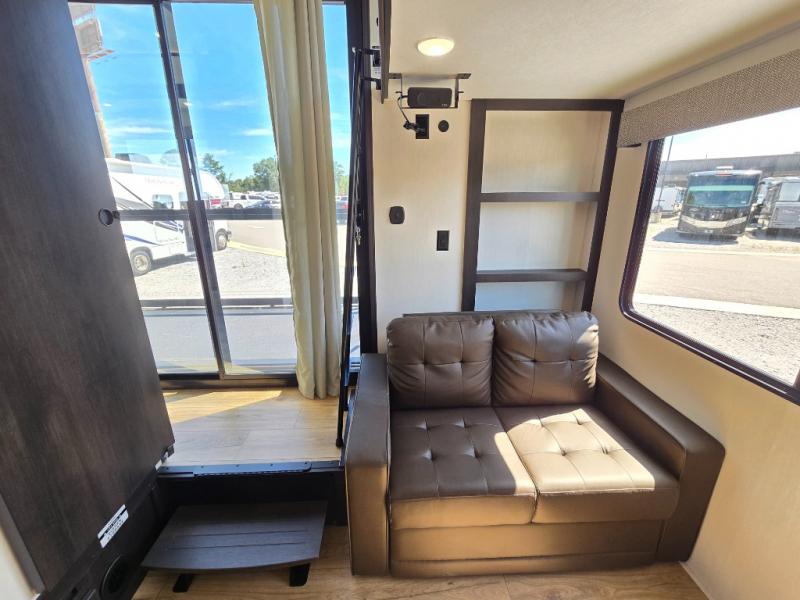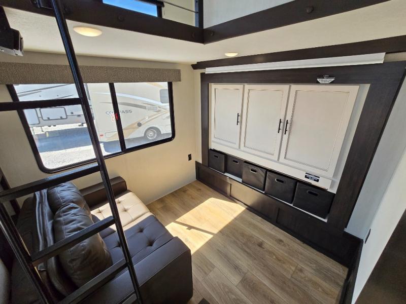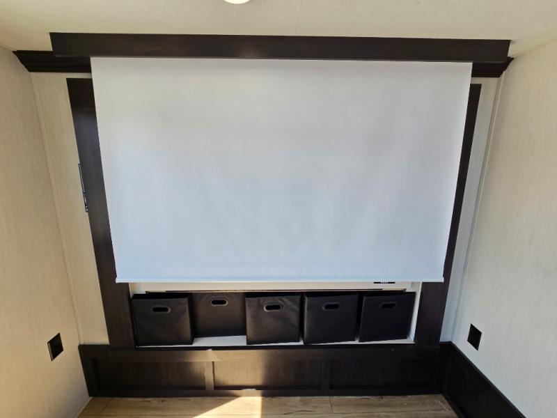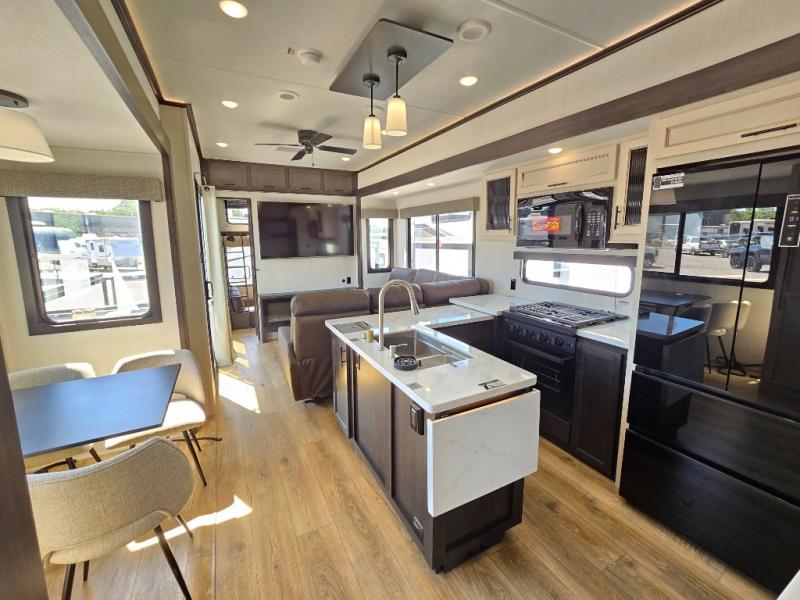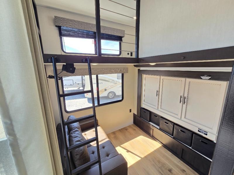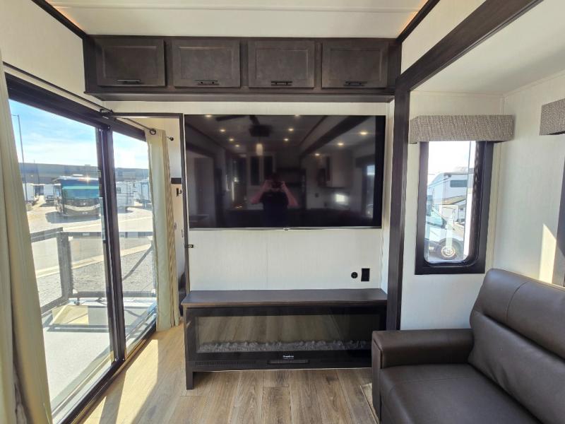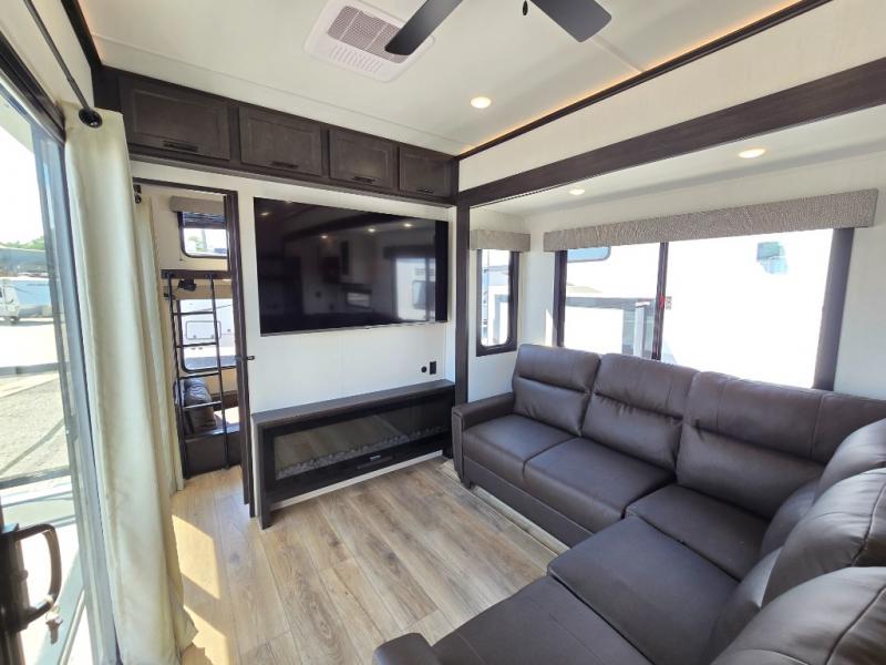 This is the perfect fifth wheel if you enjoy camping with friends and family! You'll have the front private bedroom with a camper king bed slide all to yourselves, while your guests take the rear den. There is a tri-fold sofa here, along with a wardrobe with a desk, additional shelves plus a loft above this room for even more sleeping or storage space! The main living room features an L-shaped sectional sofa, a fireplace and an entertainment center. And the patio deck with a 12' awning is right off of this room so you can visit with friends indoors or outdoors! There is generous counter space in the full kitchen, along with a pull-out storage drawer and a versatile dinette/desk. There are many more stand-out features found in this fifth wheel, including washer and dryer prep in the front bedroom, a 70" projector screen in the rear den, a second power awning, and the list goes on!