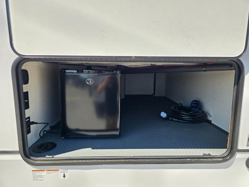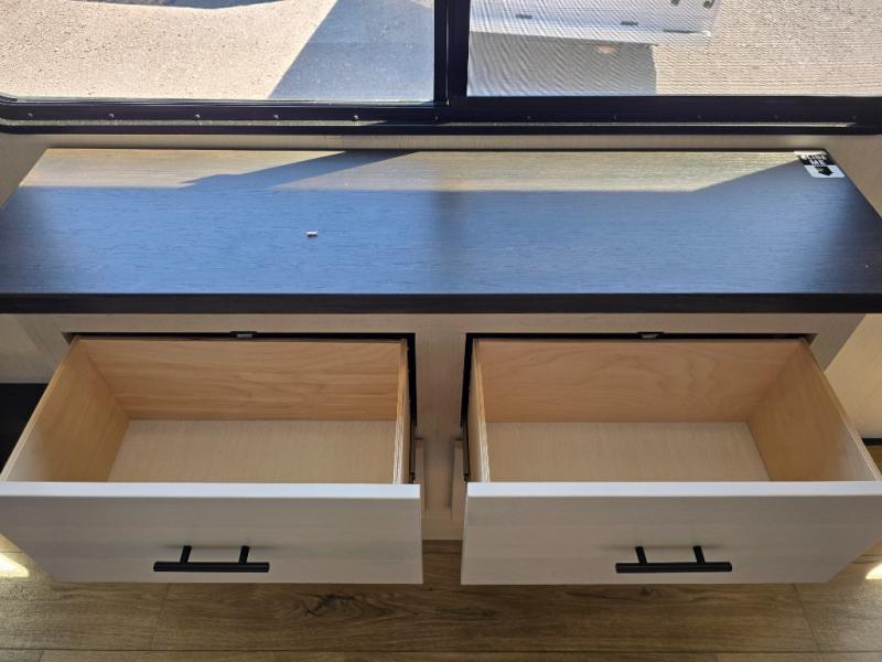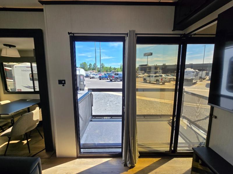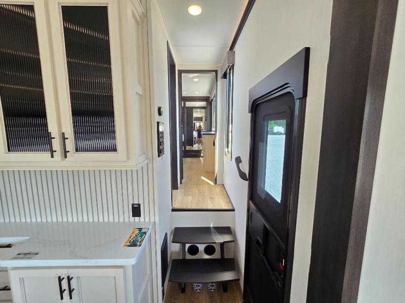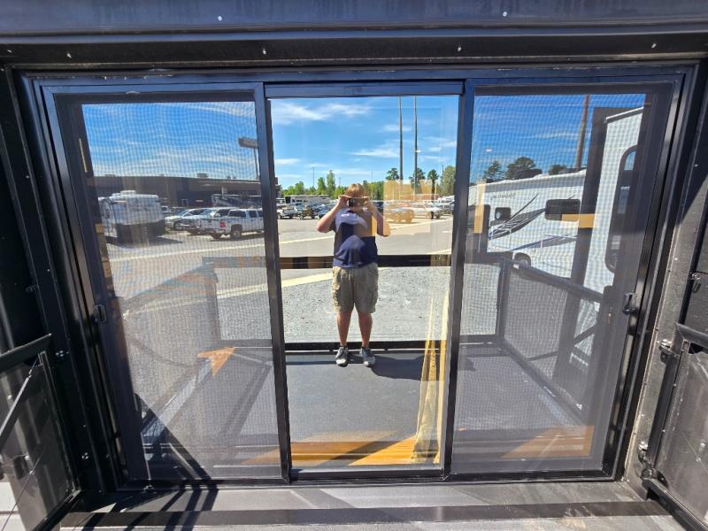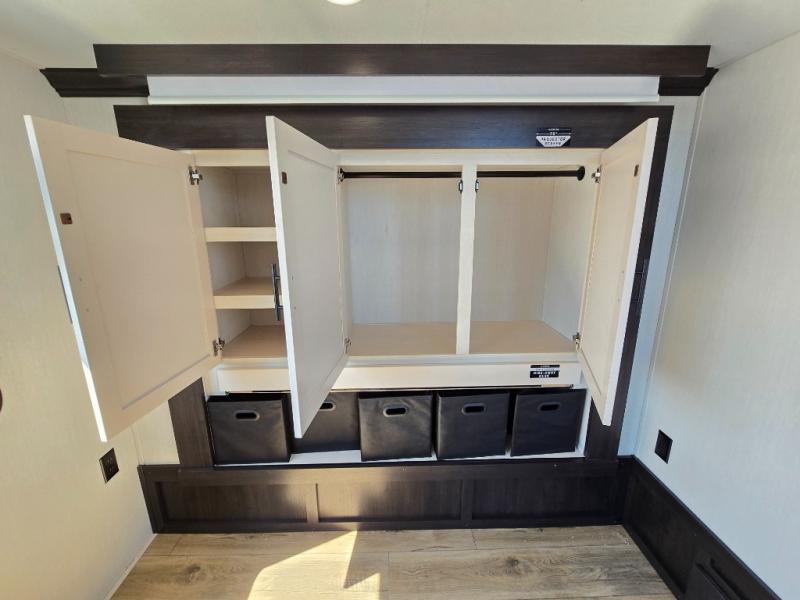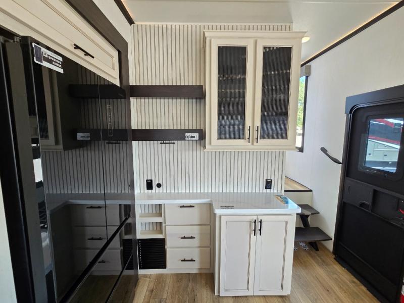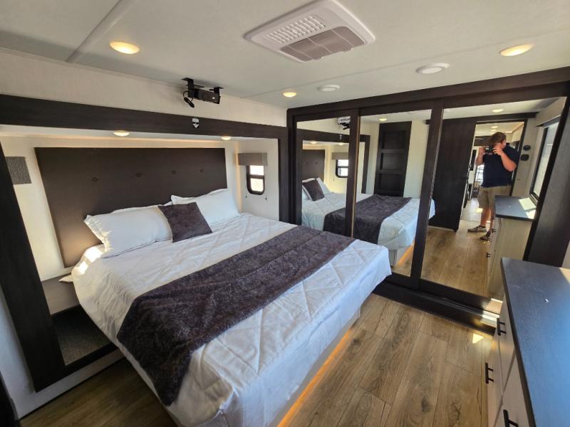 This is the perfect fifth wheel if you enjoy camping with friends and family! You'll have the front private bedroom with a camper king bed slide all to yourselves, while your guests take the rear den. There is a tri-fold sofa here, along with a wardrobe with a desk, additional shelves plus a loft above this room for even more sleeping or storage space! The main living room features an L-shaped sectional sofa, a fireplace and an entertainment center. And the patio deck with a 12' awning is right off of this room so you can visit with friends indoors or outdoors! There is generous counter space in the full kitchen, along with a pull-out storage drawer and a versatile dinette/desk. There are many more stand-out features found in this fifth wheel, including washer and dryer prep in the front bedroom, a 70" projector screen in the rear den, a second power awning, and the list goes on!