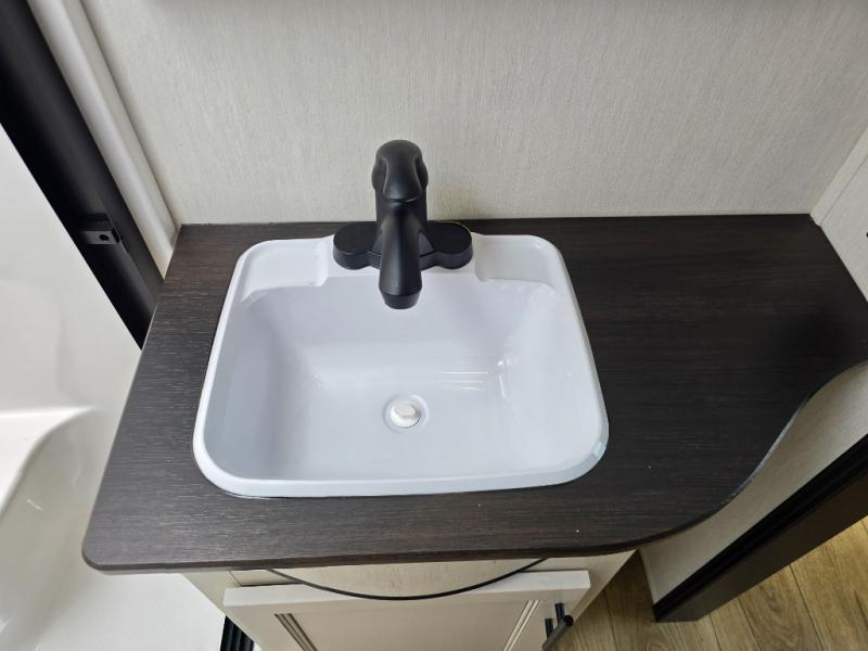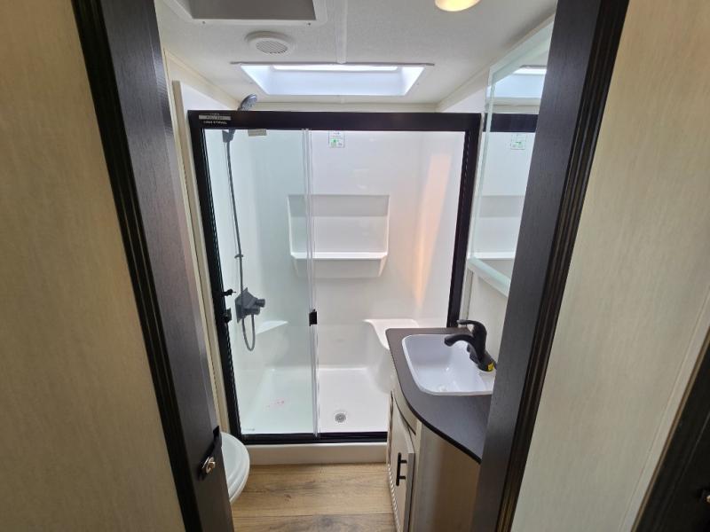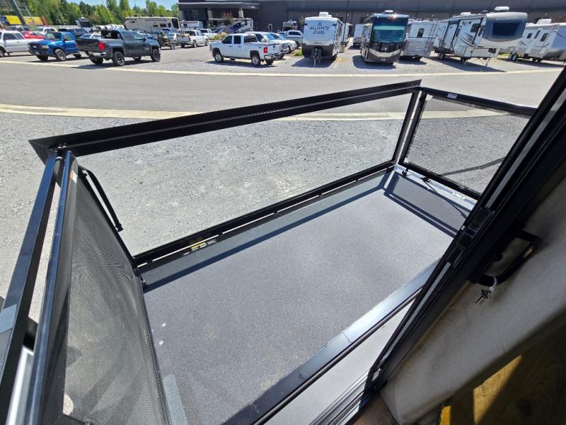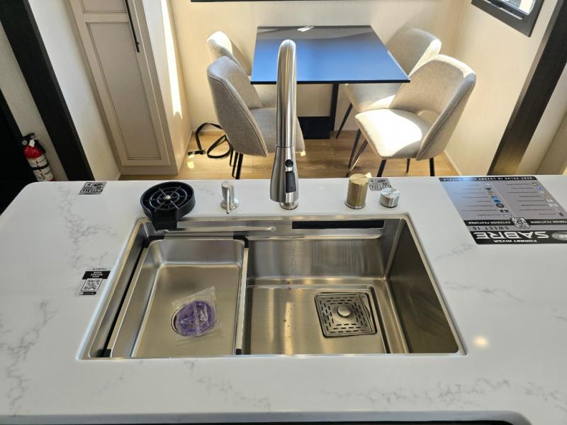 You will experience luxurious camping trips at an affordable price with any one of these Forest River Sabre fifth wheels! These models are durable and ready to travel anytime of the year thanks to features like the high-gloss gel-coat front cap with LED lighting, the PVC roof membrane, and the forced air underbelly with enclosed gate valves. The electric auto-leveling system makes setting up easy and safe, and the adjustable power awning with LED lighting will create an inviting outdoor living space. Each model includes a universal docking station which includes a black tank flush and an outside shower, and adjustable stable steps for you to enter and exit the unit safely. Inside, you will love the design of the ambient accent lighting in the living area, the real wood lumbercore cabinetry, and the linoleum flooring!