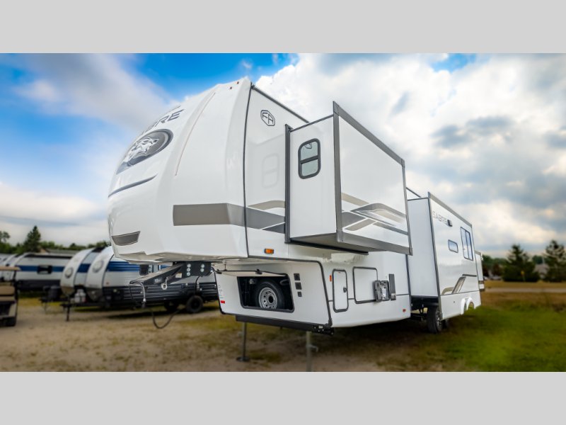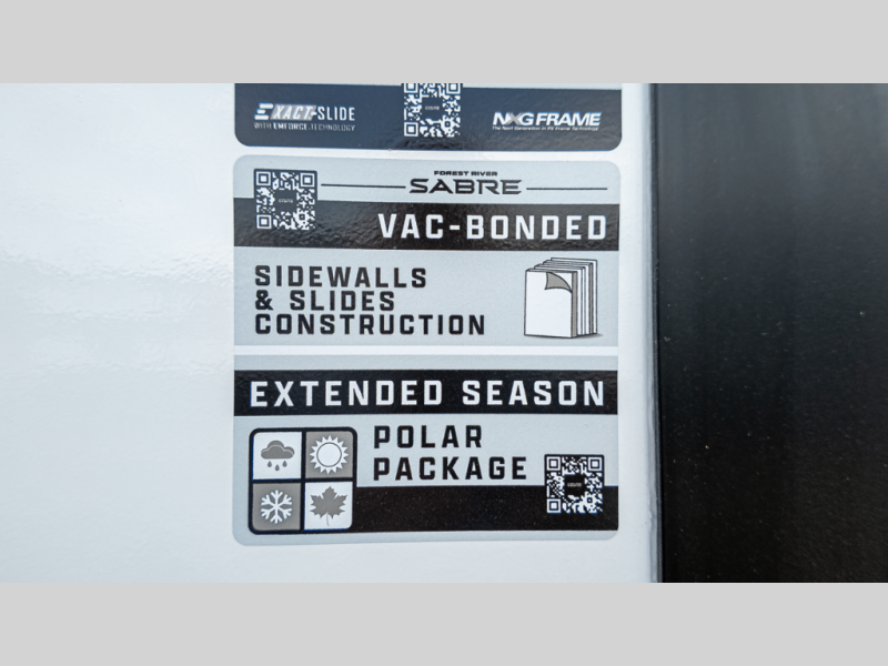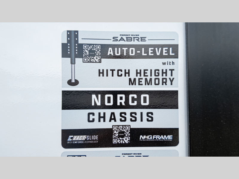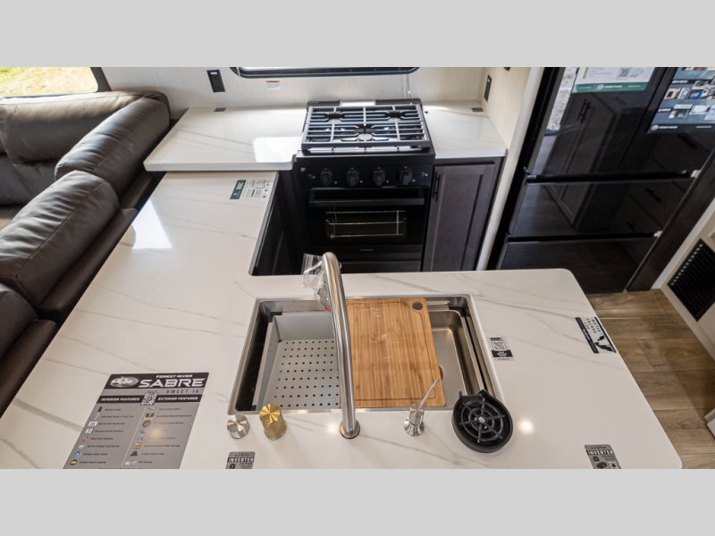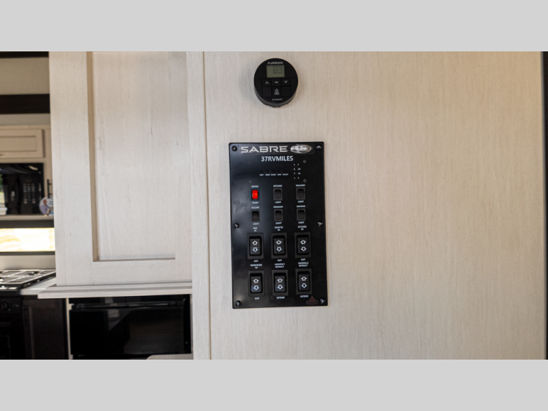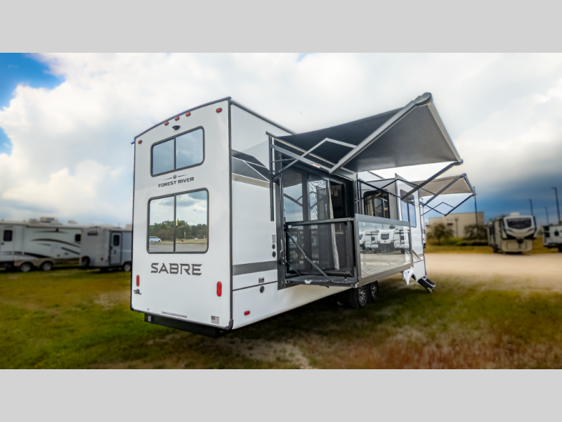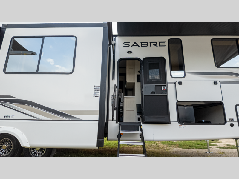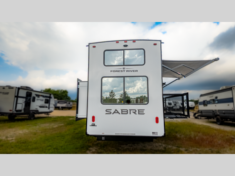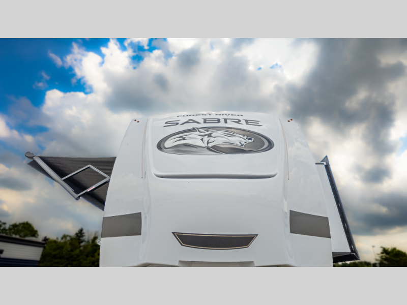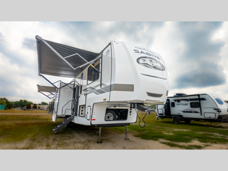 You will experience luxurious camping trips at an affordable price with any one of these Forest River Sabre fifth wheels! These models are durable and ready to travel anytime of the year thanks to features like the high-gloss gel-coat front cap with LED lighting, the PVC roof membrane, and the forced air underbelly with enclosed gate valves. The electric auto-leveling system makes setting up easy and safe, and the adjustable power awning with LED lighting will create an inviting outdoor living space. Each model includes a universal docking station which includes a black tank flush and an outside shower, and adjustable stable steps for you to enter and exit the unit safely. Inside, you will love the design of the ambient accent lighting in the living area, the real wood lumbercore cabinetry, and the linoleum flooring!