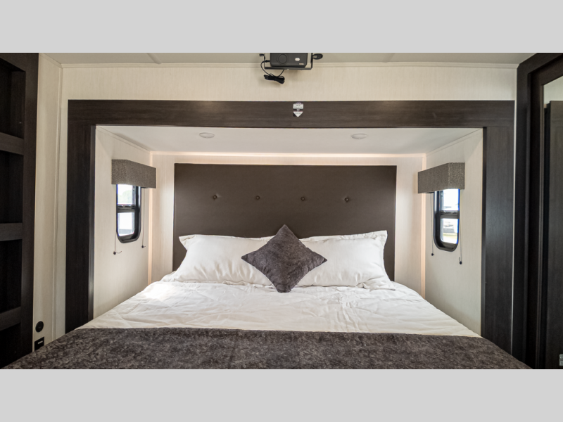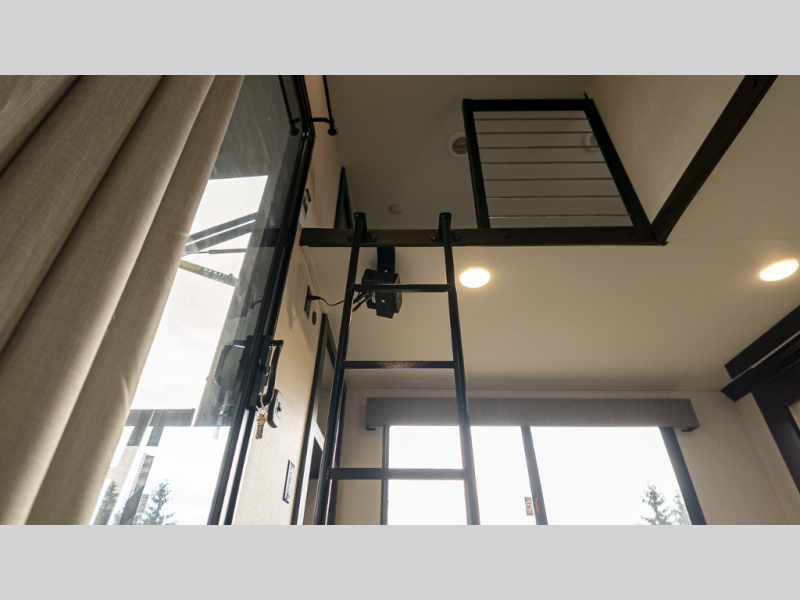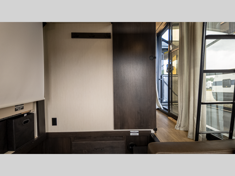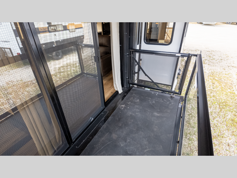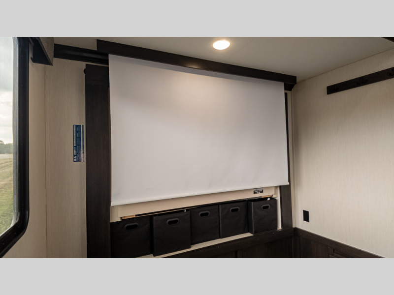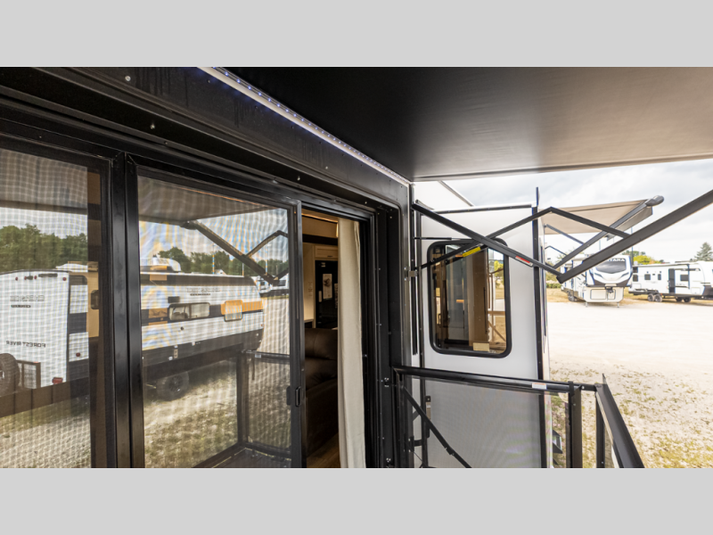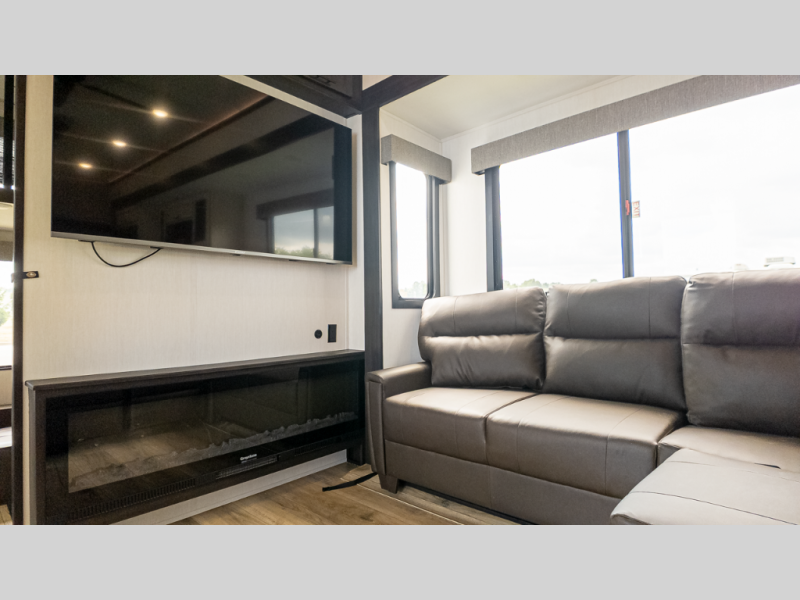 This is the perfect fifth wheel if you enjoy camping with friends and family! You'll have the front private bedroom with a camper king bed slide all to yourselves, while your guests take the rear den. There is a tri-fold sofa here, along with a wardrobe with a desk, additional shelves plus a loft above this room for even more sleeping or storage space! The main living room features an L-shaped sectional sofa, a fireplace and an entertainment center. And the patio deck with a 12' awning is right off of this room so you can visit with friends indoors or outdoors! There is generous counter space in the full kitchen, along with a pull-out storage drawer and a versatile dinette/desk. There are many more stand-out features found in this fifth wheel, including washer and dryer prep in the front bedroom, a 70" projector screen in the rear den, a second power awning, and the list goes on!