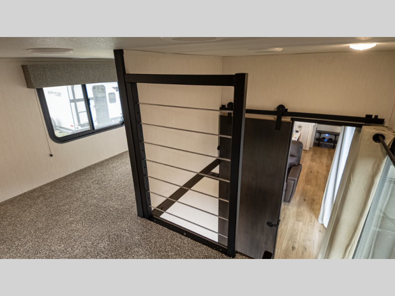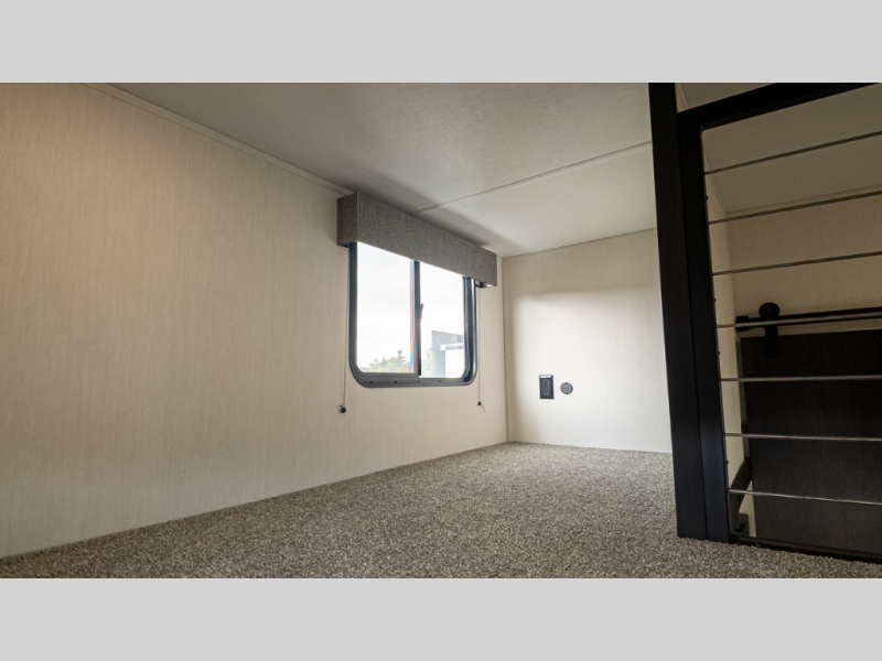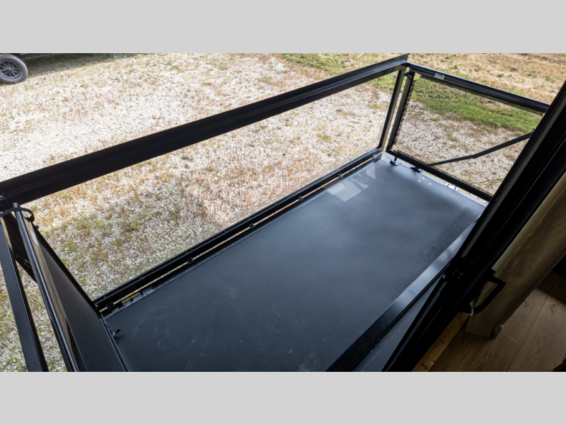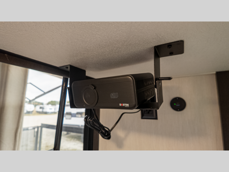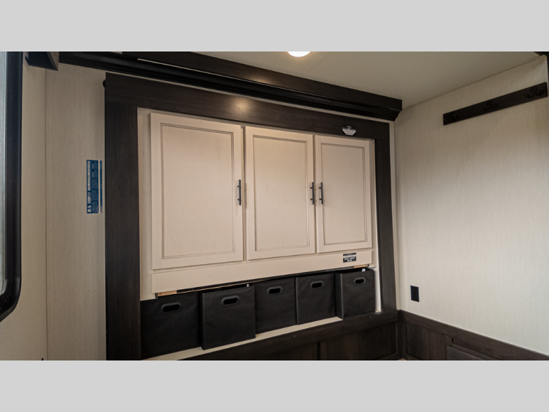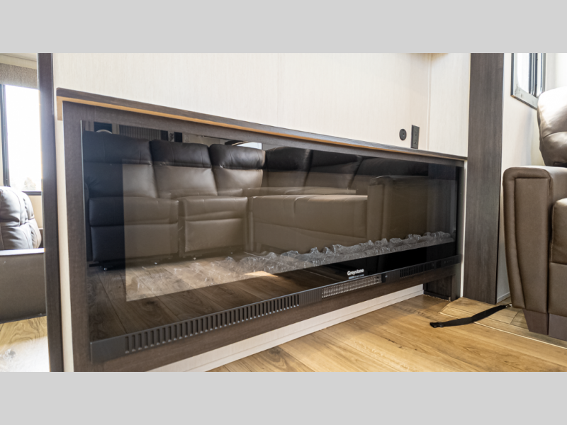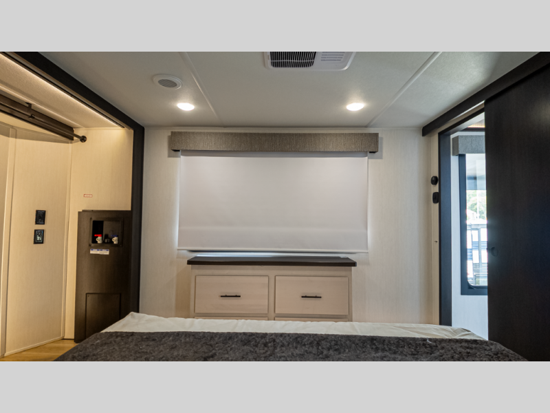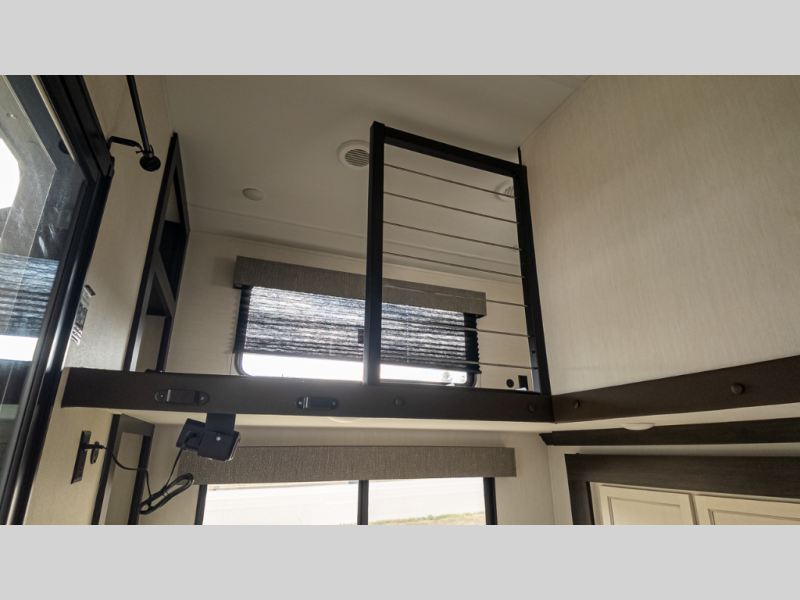 This is the perfect fifth wheel if you enjoy camping with friends and family! You'll have the front private bedroom with a camper king bed slide all to yourselves, while your guests take the rear den. There is a tri-fold sofa here, along with a wardrobe with a desk, additional shelves plus a loft above this room for even more sleeping or storage space! The main living room features an L-shaped sectional sofa, a fireplace and an entertainment center. And the patio deck with a 12' awning is right off of this room so you can visit with friends indoors or outdoors! There is generous counter space in the full kitchen, along with a pull-out storage drawer and a versatile dinette/desk. There are many more stand-out features found in this fifth wheel, including washer and dryer prep in the front bedroom, a 70" projector screen in the rear den, a second power awning, and the list goes on!