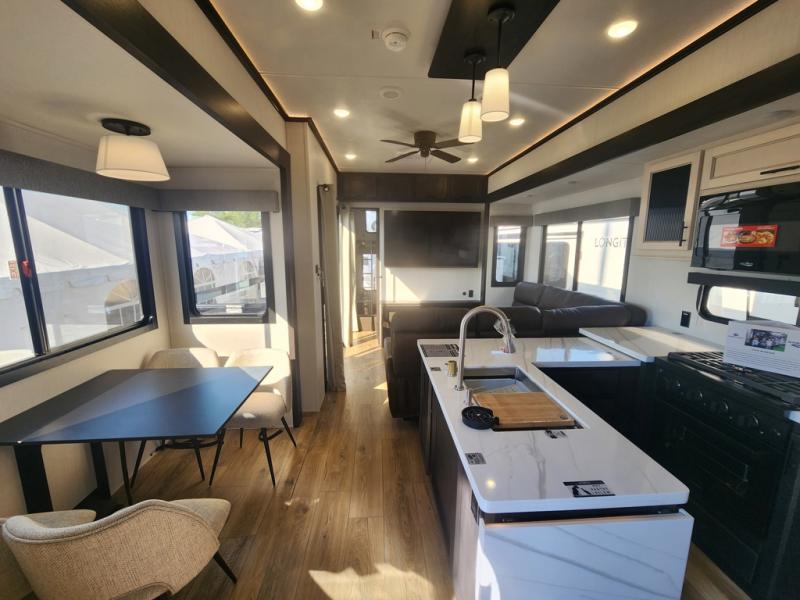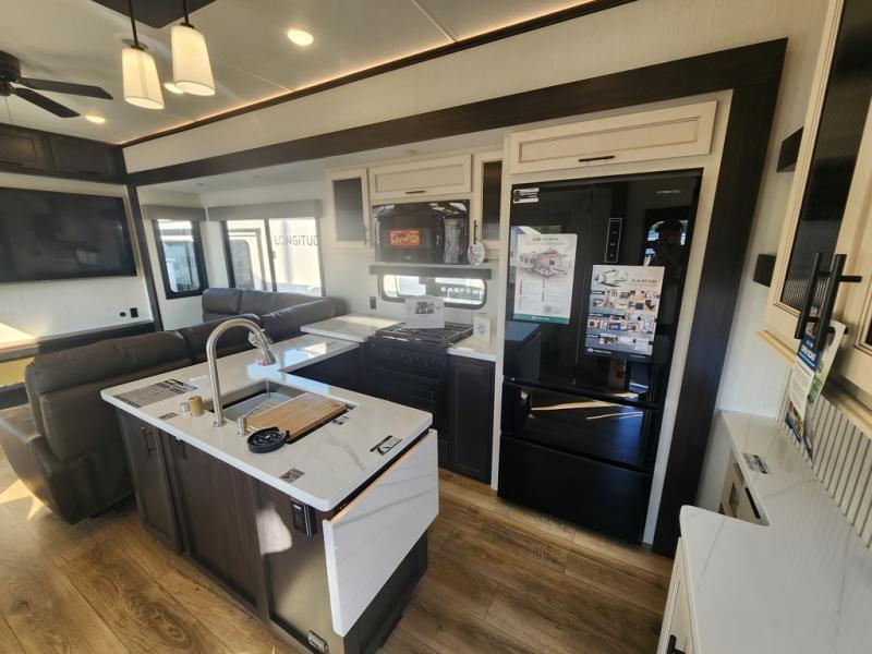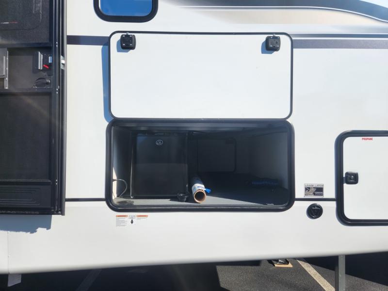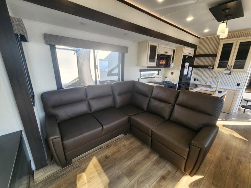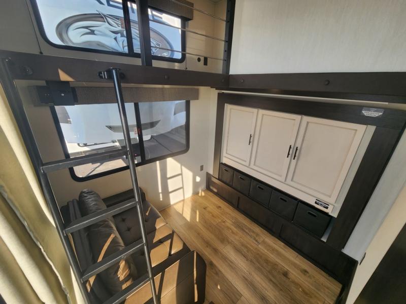 This is the perfect fifth wheel if you enjoy camping with friends and family! You'll have the front private bedroom with a camper king bed slide all to yourselves, while your guests take the rear den. There is a tri-fold sofa here, along with a wardrobe with a desk, additional shelves plus a loft above this room for even more sleeping or storage space! The main living room features an L-shaped sectional sofa, a fireplace and an entertainment center. And the patio deck with a 12' awning is right off of this room so you can visit with friends indoors or outdoors! There is generous counter space in the full kitchen, along with a pull-out storage drawer and a versatile dinette/desk. There are many more stand-out features found in this fifth wheel, including washer and dryer prep in the front bedroom, a 70" projector screen in the rear den, a second power awning, and the list goes on!