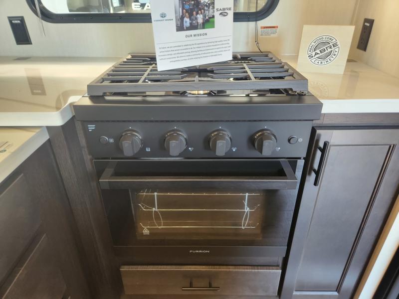 You will experience luxurious camping trips at an affordable price with any one of these Forest River Sabre fifth wheels! These models are durable and ready to travel anytime of the year thanks to features like the high-gloss gel-coat front cap with LED lighting, the PVC roof membrane, and the forced air underbelly with enclosed gate valves. The electric auto-leveling system makes setting up easy and safe, and the adjustable power awning with LED lighting will create an inviting outdoor living space. Each model includes a universal docking station which includes a black tank flush and an outside shower, and adjustable stable steps for you to enter and exit the unit safely. Inside, you will love the design of the ambient accent lighting in the living area, the real wood lumbercore cabinetry, and the linoleum flooring!