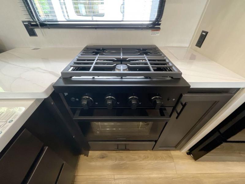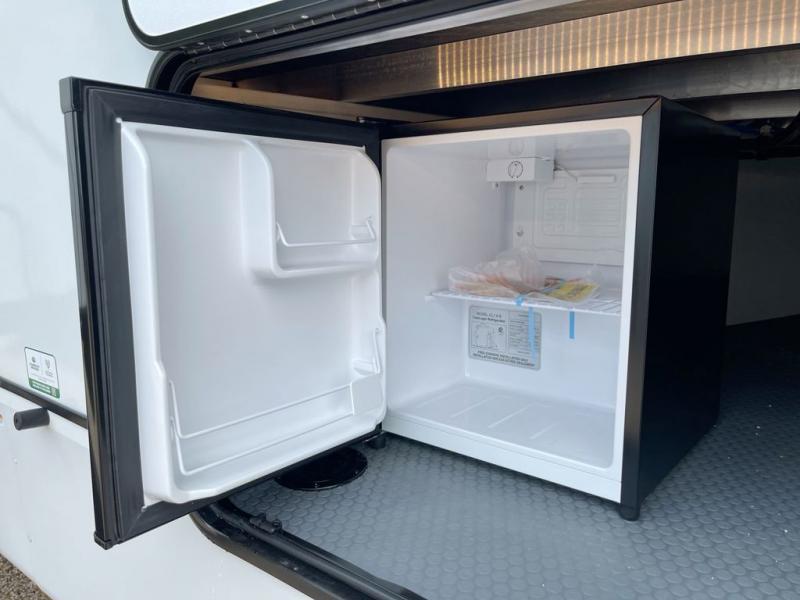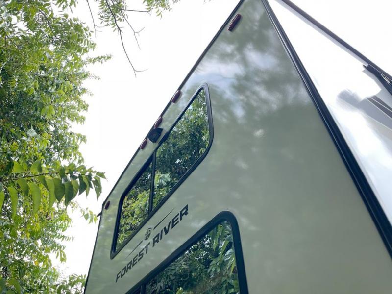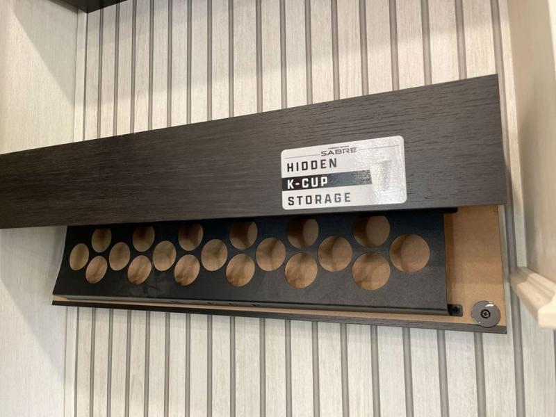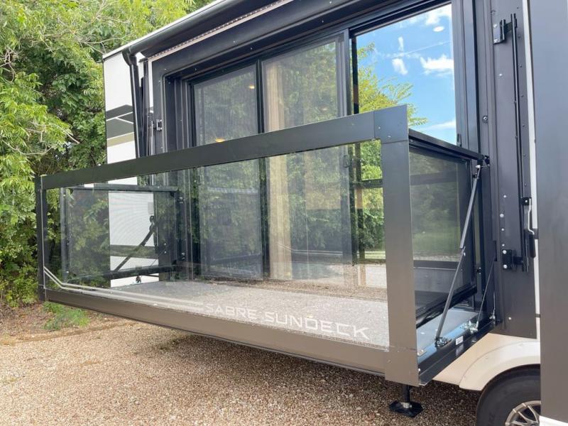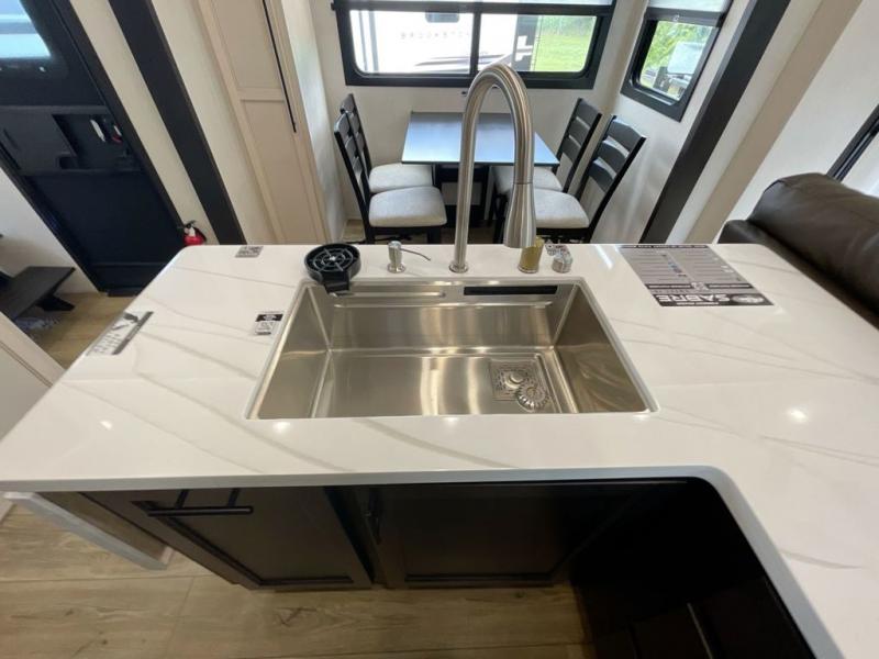 You will experience luxurious camping trips at an affordable price with any one of these Forest River Sabre fifth wheels! These models are durable and ready to travel anytime of the year thanks to features like the high-gloss gel-coat front cap with LED lighting, the PVC roof membrane, and the forced air underbelly with enclosed gate valves. The electric auto-leveling system makes setting up easy and safe, and the adjustable power awning with LED lighting will create an inviting outdoor living space. Each model includes a universal docking station which includes a black tank flush and an outside shower, and adjustable stable steps for you to enter and exit the unit safely. Inside, you will love the design of the ambient accent lighting in the living area, the real wood lumbercore cabinetry, and the linoleum flooring!