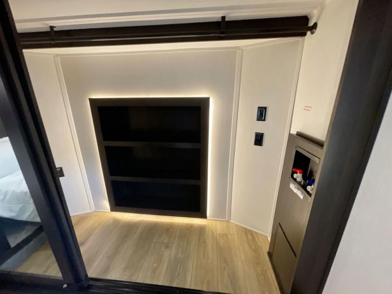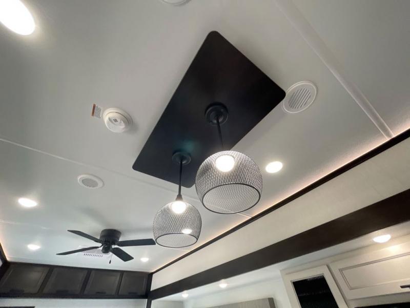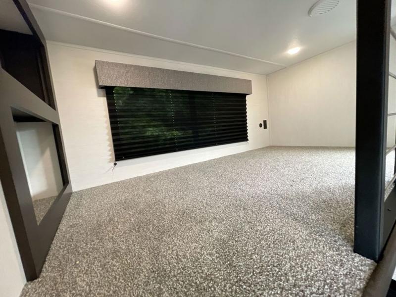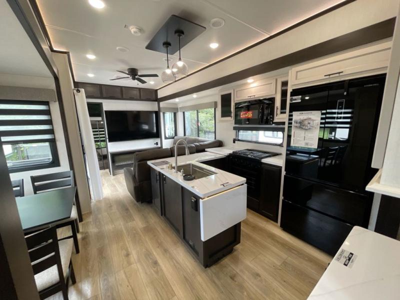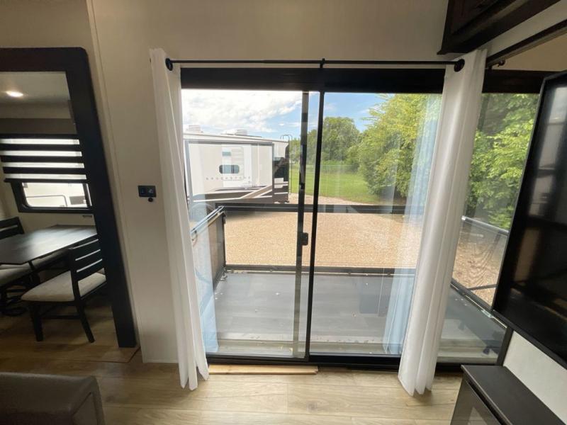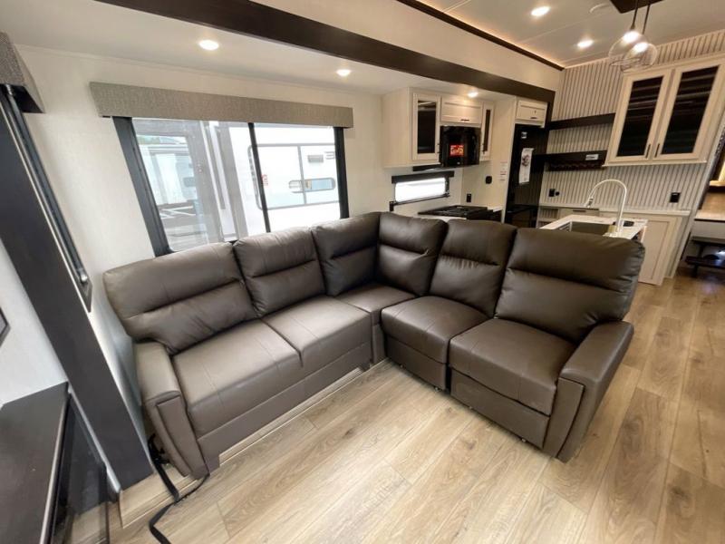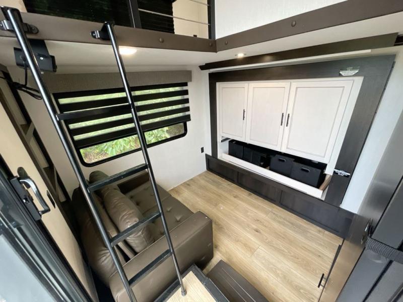 This is the perfect fifth wheel if you enjoy camping with friends and family! You'll have the front private bedroom with a camper king bed slide all to yourselves, while your guests take the rear den. There is a tri-fold sofa here, along with a wardrobe with a desk, additional shelves plus a loft above this room for even more sleeping or storage space! The main living room features an L-shaped sectional sofa, a fireplace and an entertainment center. And the patio deck with a 12' awning is right off of this room so you can visit with friends indoors or outdoors! There is generous counter space in the full kitchen, along with a pull-out storage drawer and a versatile dinette/desk. There are many more stand-out features found in this fifth wheel, including washer and dryer prep in the front bedroom, a 70" projector screen in the rear den, a second power awning, and the list goes on!