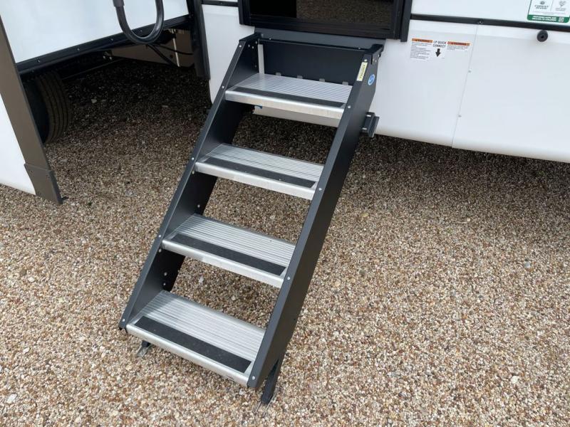You will experience luxurious camping trips at an affordable price with any one of these Forest River Sabre fifth wheels! These models are durable and ready to travel anytime of the year thanks to features like the high-gloss gel-coat front cap with LED lighting, the PVC roof membrane, and the forced air underbelly with enclosed gate valves. The electric auto-leveling system makes setting up easy and safe, and the adjustable power awning with LED lighting will create an inviting outdoor living space. Each model includes a universal docking station which includes a black tank flush and an outside shower, and adjustable stable steps for you to enter and exit the unit safely. Inside, you will love the design of the ambient accent lighting in the living area, the real wood lumbercore cabinetry, and the linoleum flooring!