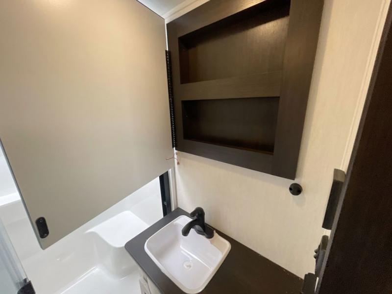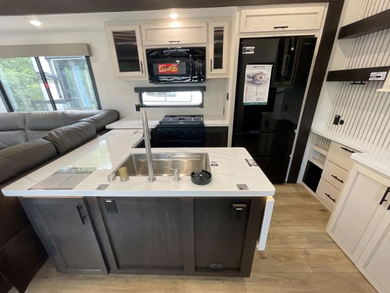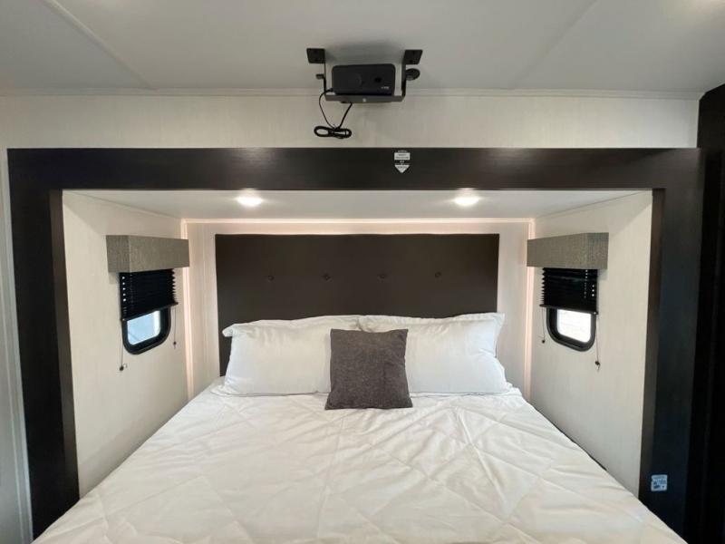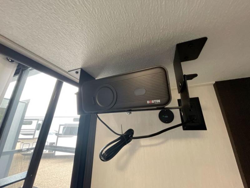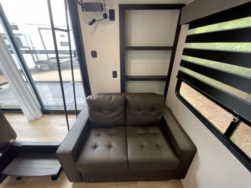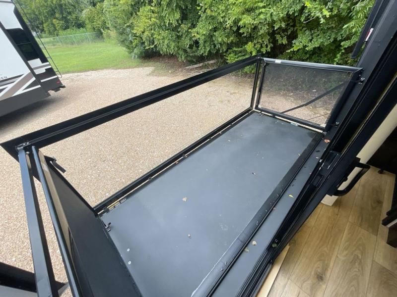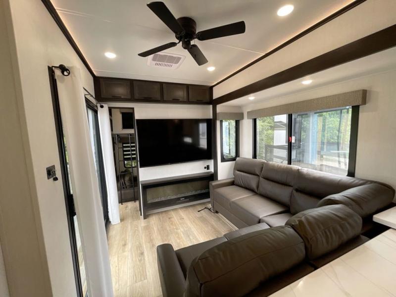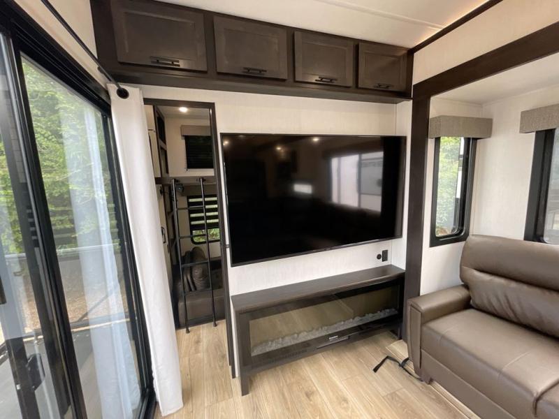 This is the perfect fifth wheel if you enjoy camping with friends and family! You'll have the front private bedroom with a camper king bed slide all to yourselves, while your guests take the rear den. There is a tri-fold sofa here, along with a wardrobe with a desk, additional shelves plus a loft above this room for even more sleeping or storage space! The main living room features an L-shaped sectional sofa, a fireplace and an entertainment center. And the patio deck with a 12' awning is right off of this room so you can visit with friends indoors or outdoors! There is generous counter space in the full kitchen, along with a pull-out storage drawer and a versatile dinette/desk. There are many more stand-out features found in this fifth wheel, including washer and dryer prep in the front bedroom, a 70" projector screen in the rear den, a second power awning, and the list goes on!