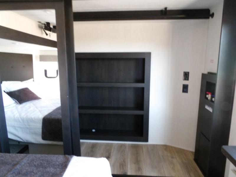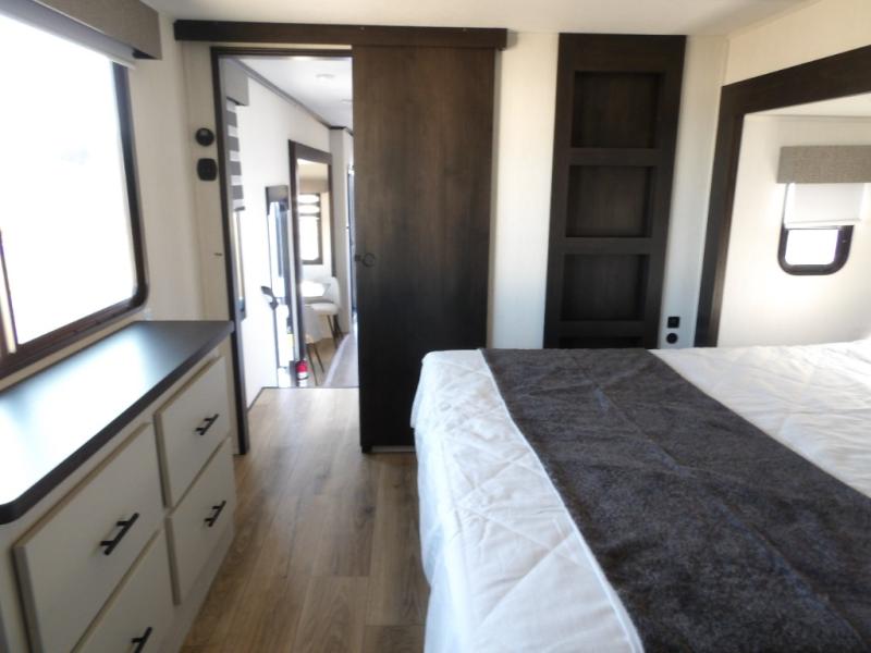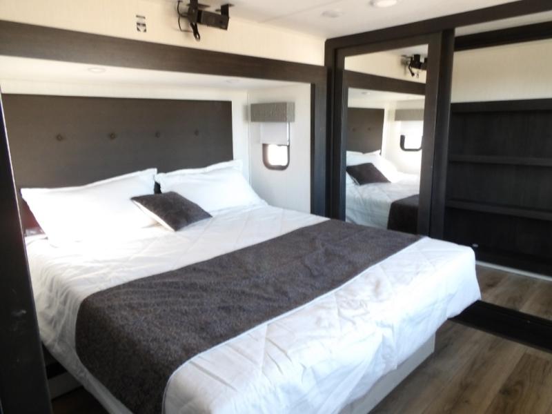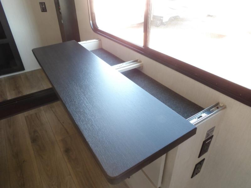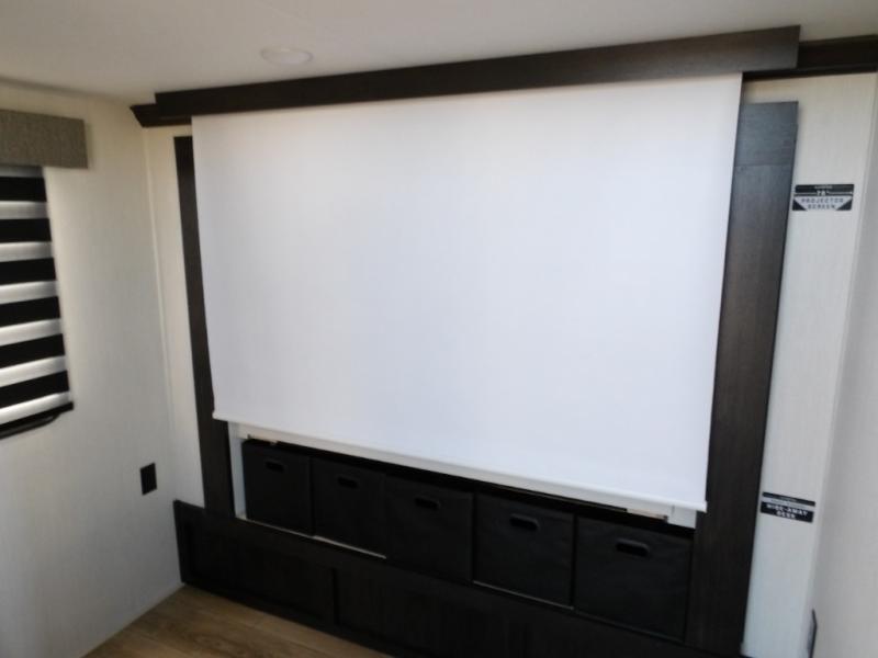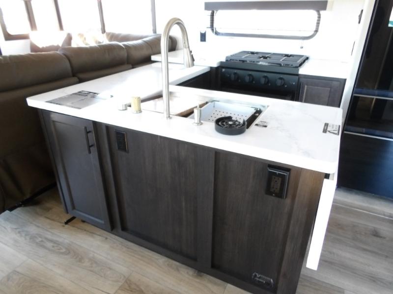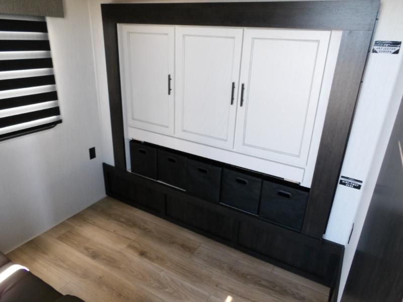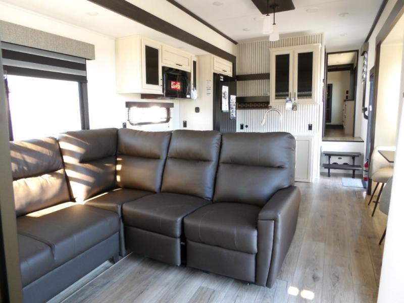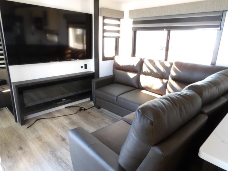 This is the perfect fifth wheel if you enjoy camping with friends and family! You'll have the front private bedroom with a camper king bed slide all to yourselves, while your guests take the rear den. There is a tri-fold sofa here, along with a wardrobe with a desk, additional shelves plus a loft above this room for even more sleeping or storage space! The main living room features an L-shaped sectional sofa, a fireplace and an entertainment center. And the patio deck with a 12' awning is right off of this room so you can visit with friends indoors or outdoors! There is generous counter space in the full kitchen, along with a pull-out storage drawer and a versatile dinette/desk. There are many more stand-out features found in this fifth wheel, including washer and dryer prep in the front bedroom, a 70" projector screen in the rear den, a second power awning, and the list goes on!