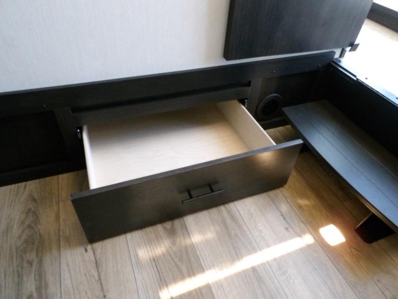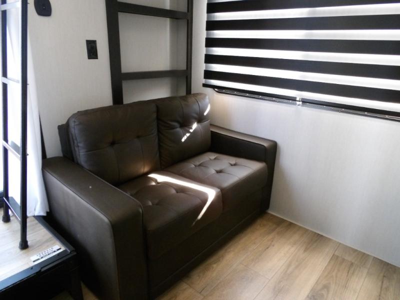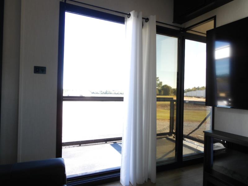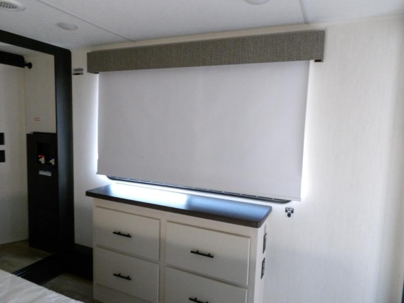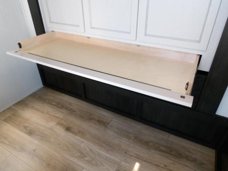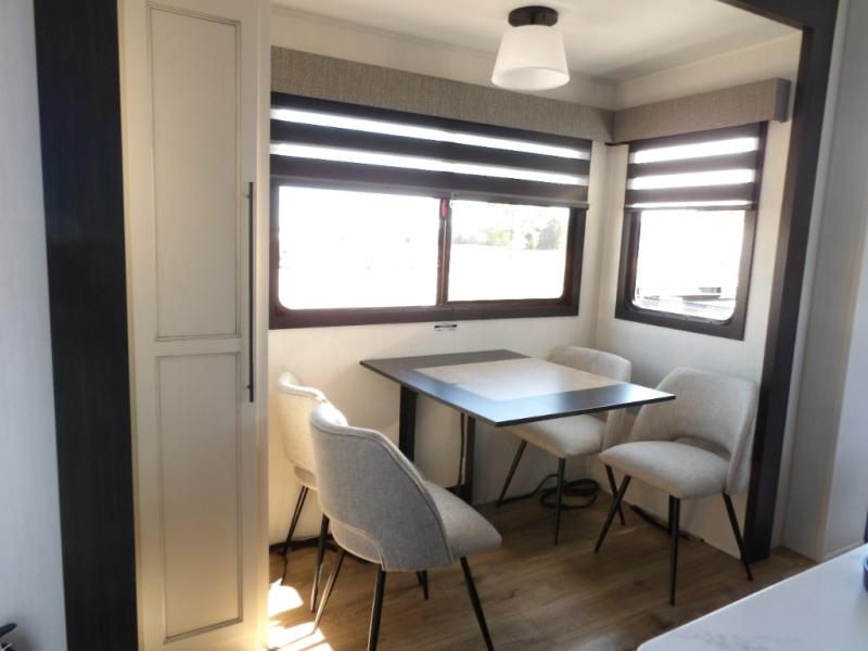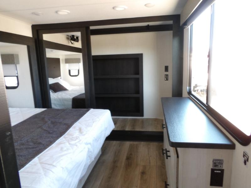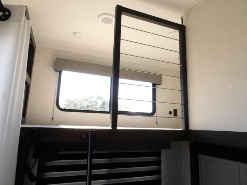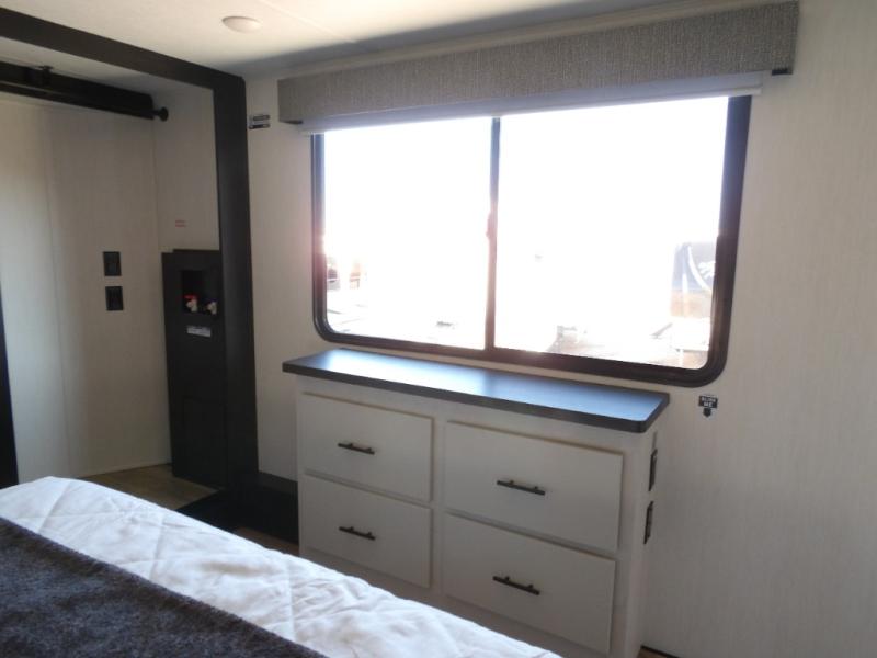 This is the perfect fifth wheel if you enjoy camping with friends and family! You'll have the front private bedroom with a camper king bed slide all to yourselves, while your guests take the rear den. There is a tri-fold sofa here, along with a wardrobe with a desk, additional shelves plus a loft above this room for even more sleeping or storage space! The main living room features an L-shaped sectional sofa, a fireplace and an entertainment center. And the patio deck with a 12' awning is right off of this room so you can visit with friends indoors or outdoors! There is generous counter space in the full kitchen, along with a pull-out storage drawer and a versatile dinette/desk. There are many more stand-out features found in this fifth wheel, including washer and dryer prep in the front bedroom, a 70" projector screen in the rear den, a second power awning, and the list goes on!