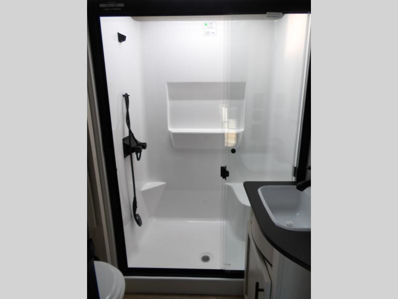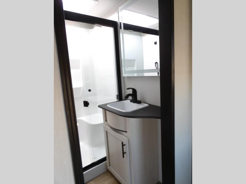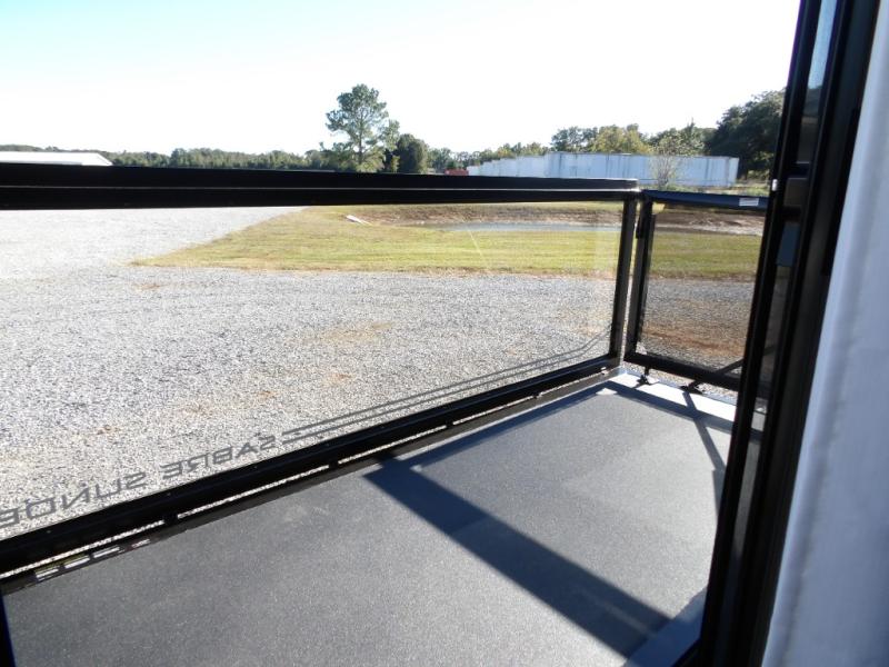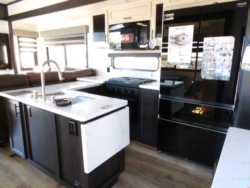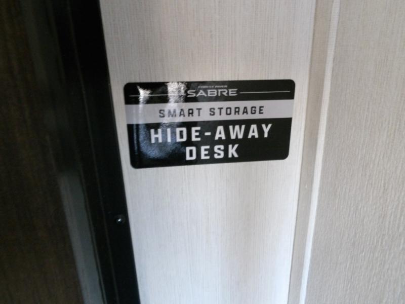You will experience luxurious camping trips at an affordable price with any one of these Forest River Sabre fifth wheels! These models are durable and ready to travel anytime of the year thanks to features like the high-gloss gel-coat front cap with LED lighting, the PVC roof membrane, and the forced air underbelly with enclosed gate valves. The electric auto-leveling system makes setting up easy and safe, and the adjustable power awning with LED lighting will create an inviting outdoor living space. Each model includes a universal docking station which includes a black tank flush and an outside shower, and adjustable stable steps for you to enter and exit the unit safely. Inside, you will love the design of the ambient accent lighting in the living area, the real wood lumbercore cabinetry, and the linoleum flooring!