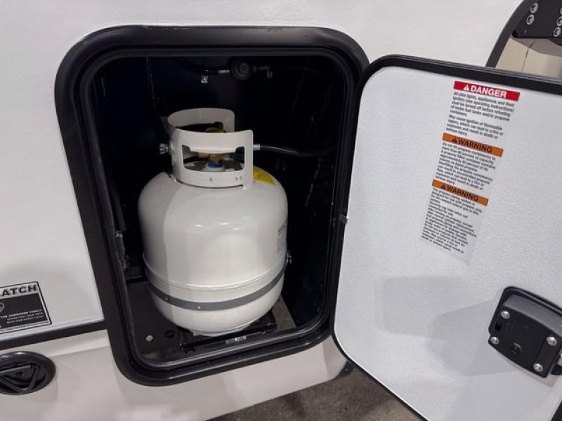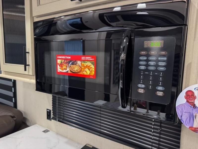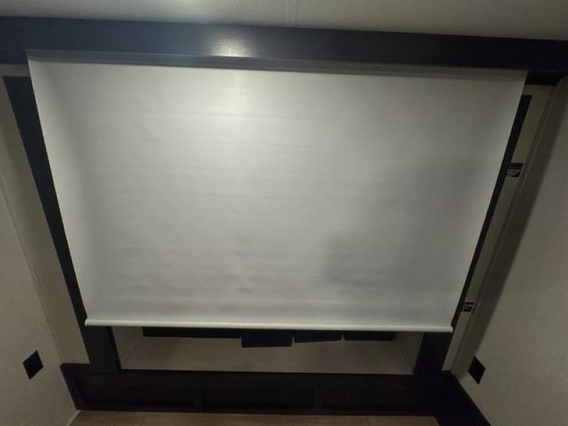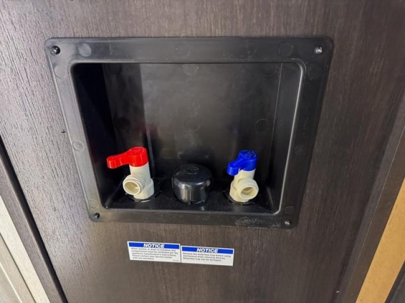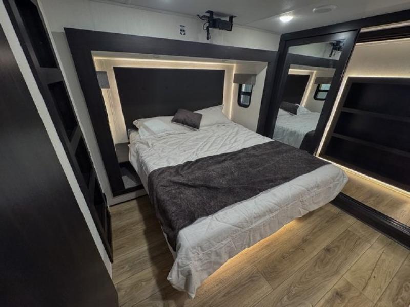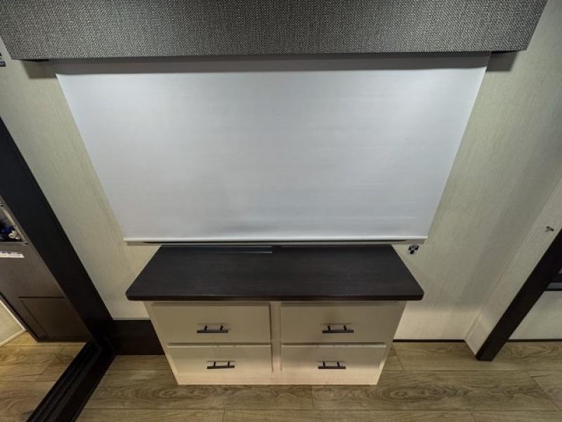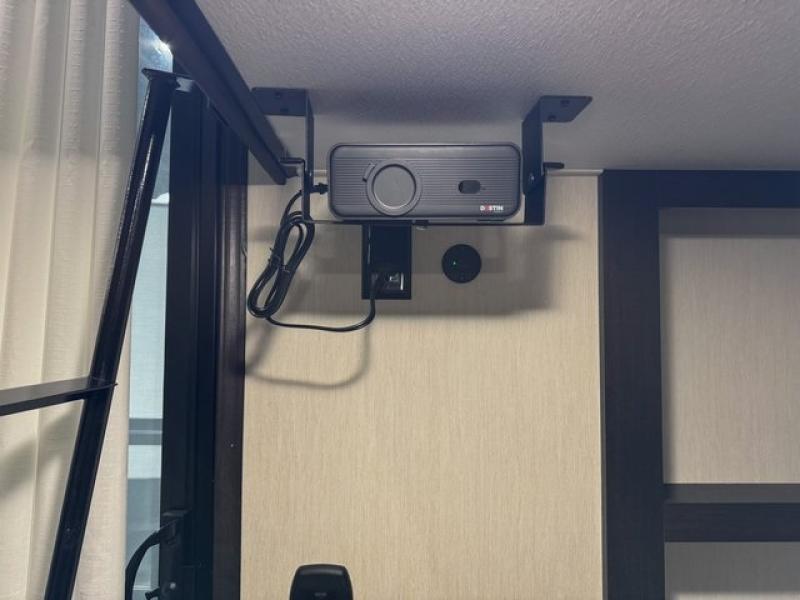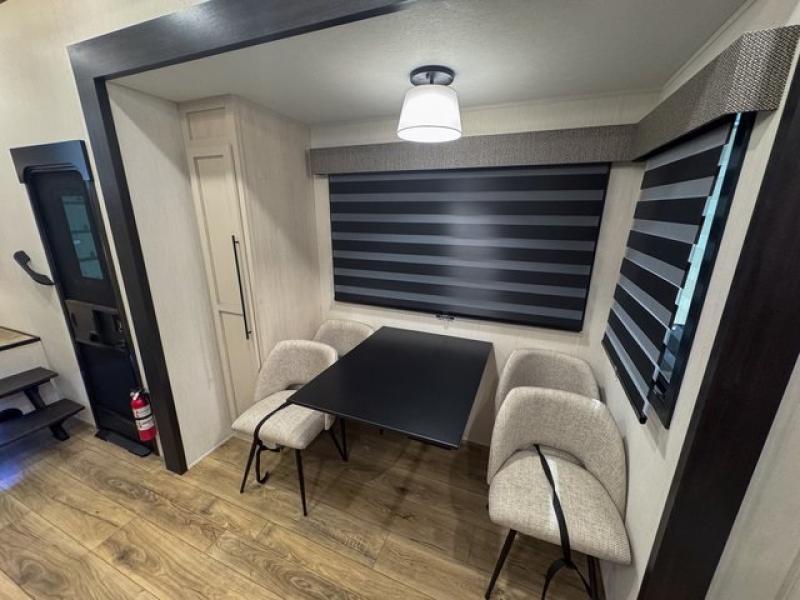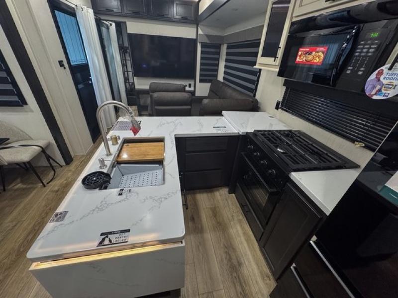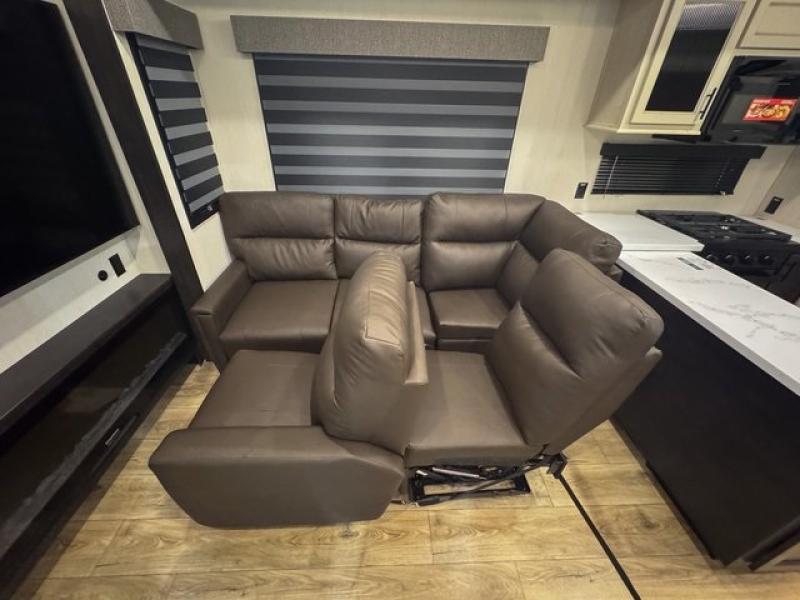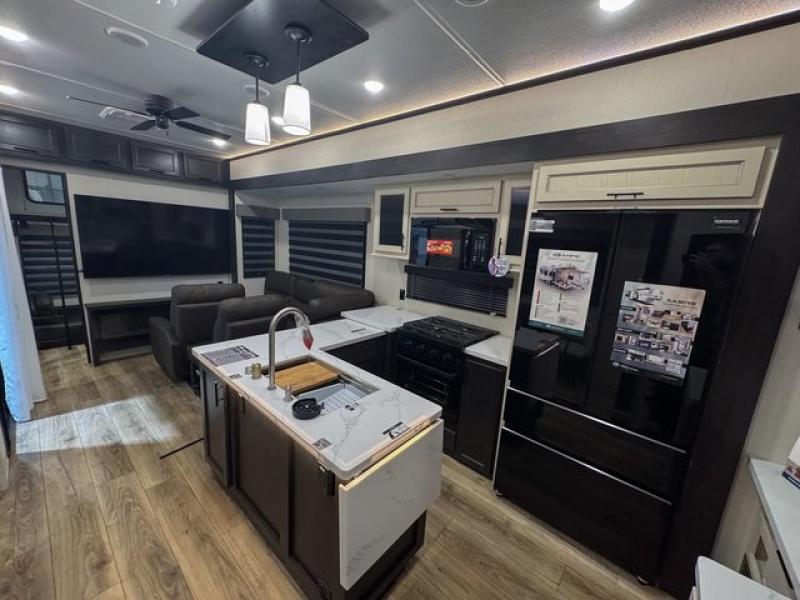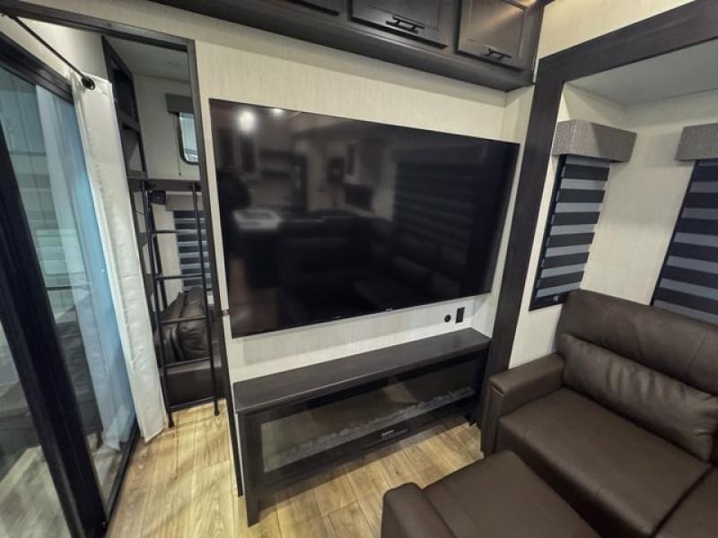 This is the perfect fifth wheel if you enjoy camping with friends and family! You'll have the front private bedroom with a camper king bed slide all to yourselves, while your guests take the rear den. There is a tri-fold sofa here, along with a wardrobe with a desk, additional shelves plus a loft above this room for even more sleeping or storage space! The main living room features an L-shaped sectional sofa, a fireplace and an entertainment center. And the patio deck with a 12' awning is right off of this room so you can visit with friends indoors or outdoors! There is generous counter space in the full kitchen, along with a pull-out storage drawer and a versatile dinette/desk. There are many more stand-out features found in this fifth wheel, including washer and dryer prep in the front bedroom, a 70" projector screen in the rear den, a second power awning, and the list goes on!