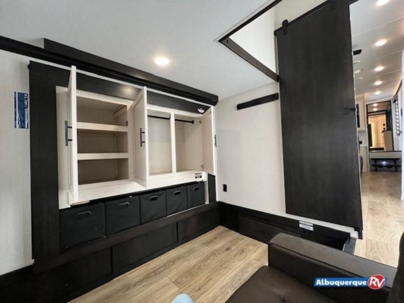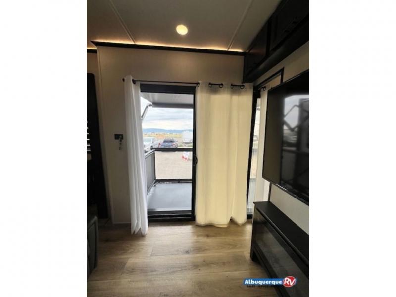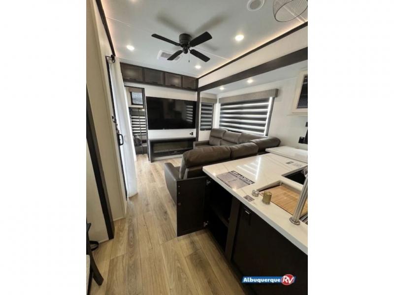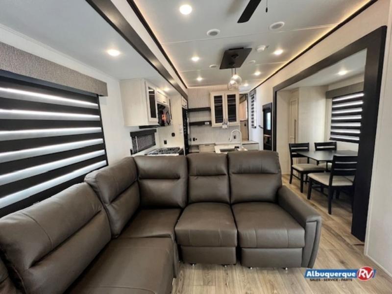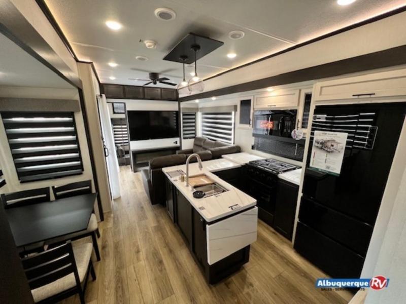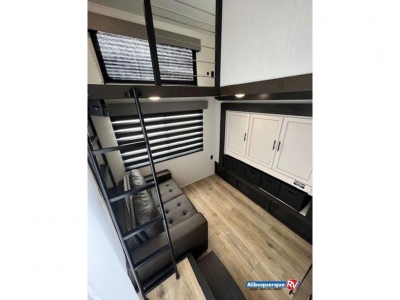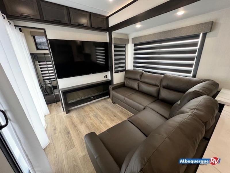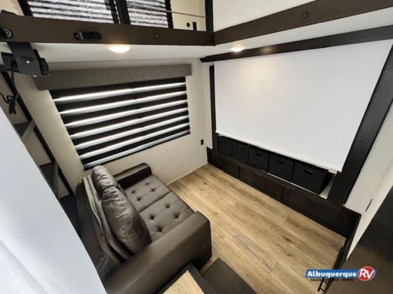 This is the perfect fifth wheel if you enjoy camping with friends and family! You'll have the front private bedroom with a camper king bed slide all to yourselves, while your guests take the rear den. There is a tri-fold sofa here, along with a wardrobe with a desk, additional shelves plus a loft above this room for even more sleeping or storage space! The main living room features an L-shaped sectional sofa, a fireplace and an entertainment center. And the patio deck with a 12' awning is right off of this room so you can visit with friends indoors or outdoors! There is generous counter space in the full kitchen, along with a pull-out storage drawer and a versatile dinette/desk. There are many more stand-out features found in this fifth wheel, including washer and dryer prep in the front bedroom, a 70" projector screen in the rear den, a second power awning, and the list goes on!