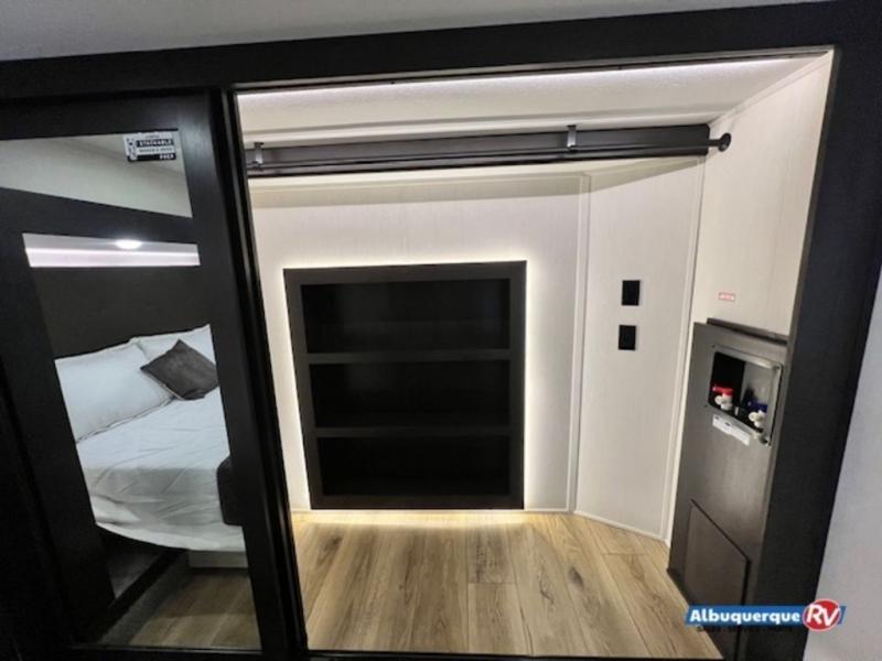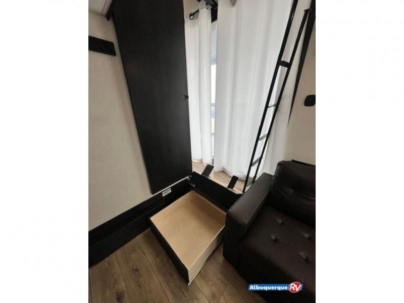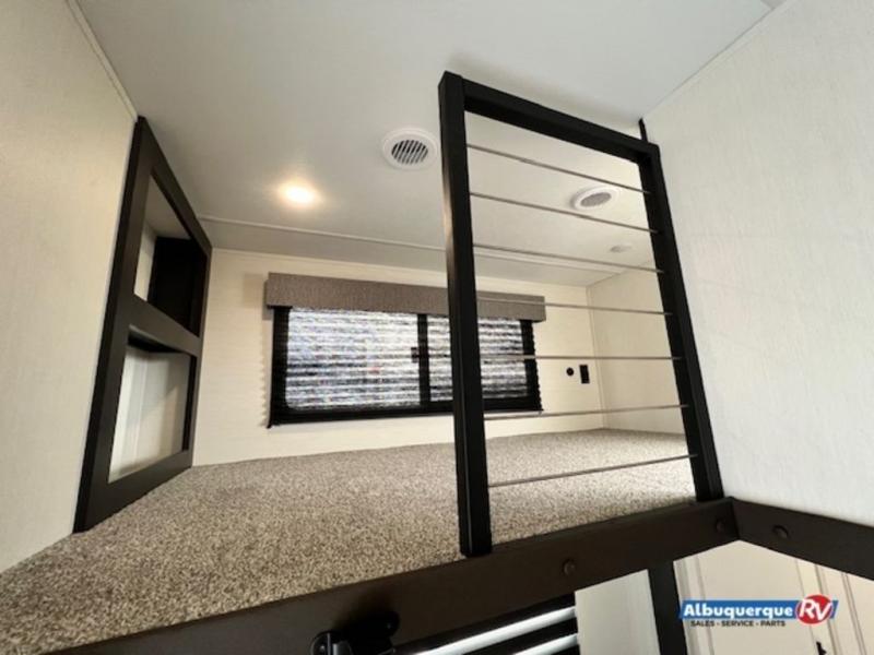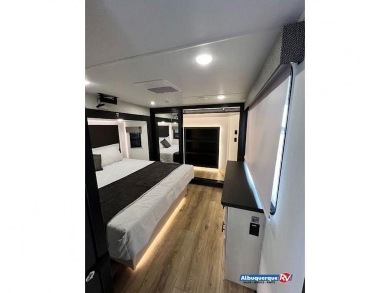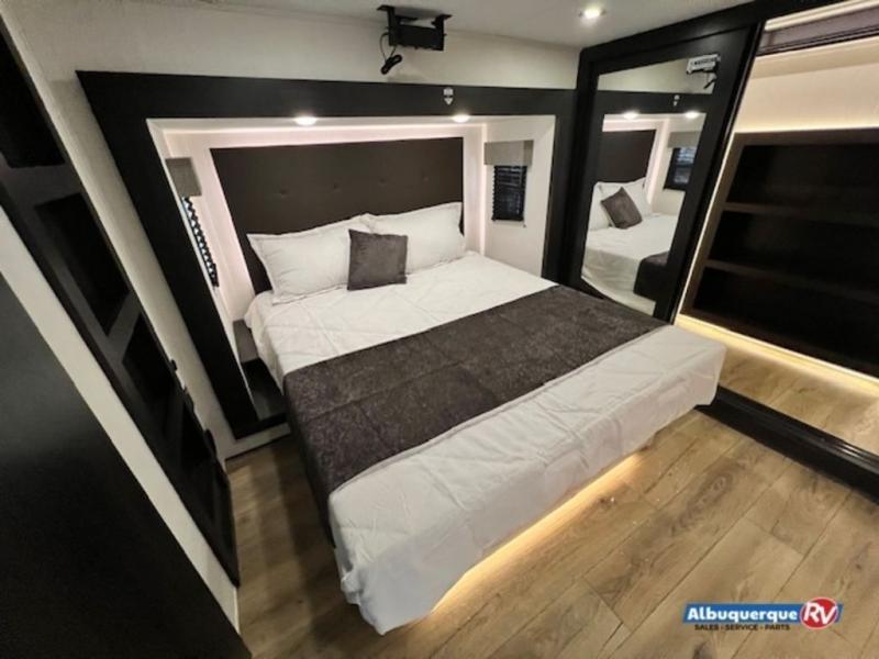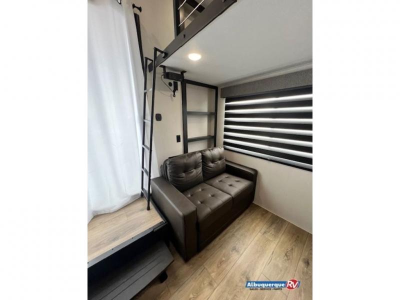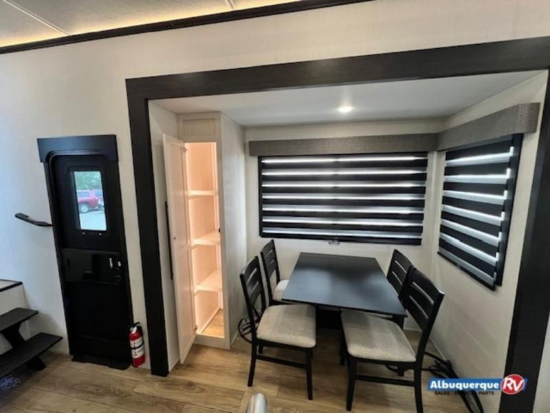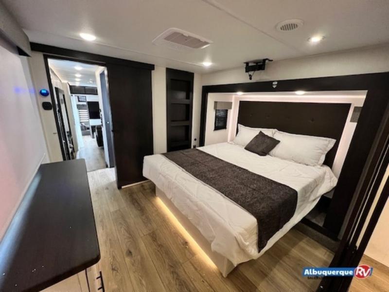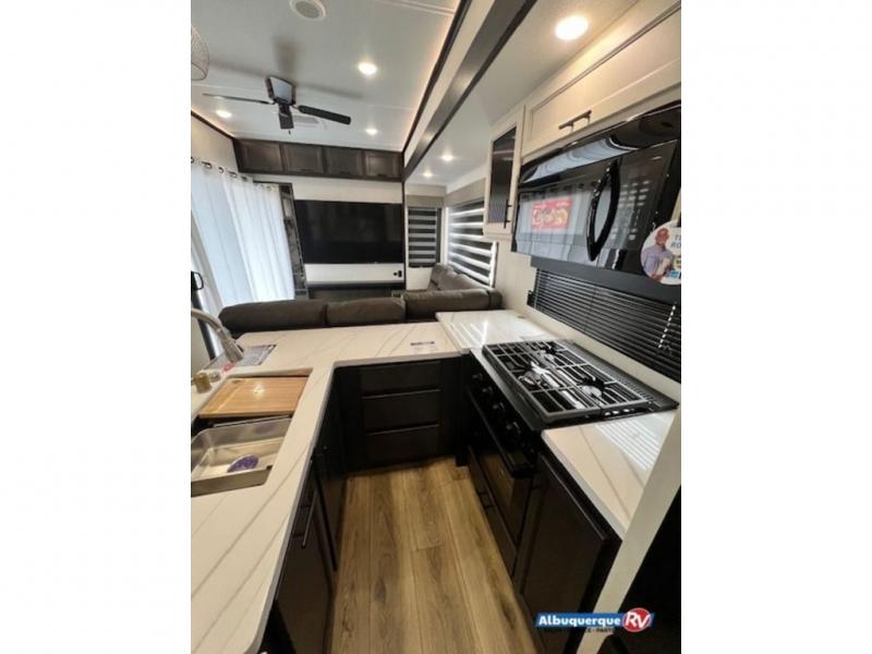 This is the perfect fifth wheel if you enjoy camping with friends and family! You'll have the front private bedroom with a camper king bed slide all to yourselves, while your guests take the rear den. There is a tri-fold sofa here, along with a wardrobe with a desk, additional shelves plus a loft above this room for even more sleeping or storage space! The main living room features an L-shaped sectional sofa, a fireplace and an entertainment center. And the patio deck with a 12' awning is right off of this room so you can visit with friends indoors or outdoors! There is generous counter space in the full kitchen, along with a pull-out storage drawer and a versatile dinette/desk. There are many more stand-out features found in this fifth wheel, including washer and dryer prep in the front bedroom, a 70" projector screen in the rear den, a second power awning, and the list goes on!