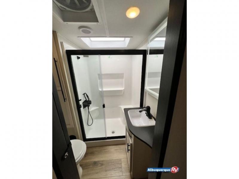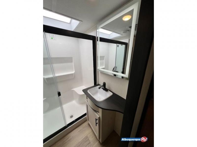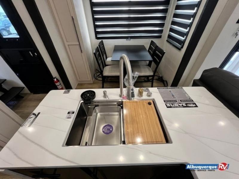 You will experience luxurious camping trips at an affordable price with any one of these Forest River Sabre fifth wheels! These models are durable and ready to travel anytime of the year thanks to features like the high-gloss gel-coat front cap with LED lighting, the PVC roof membrane, and the forced air underbelly with enclosed gate valves. The electric auto-leveling system makes setting up easy and safe, and the adjustable power awning with LED lighting will create an inviting outdoor living space. Each model includes a universal docking station which includes a black tank flush and an outside shower, and adjustable stable steps for you to enter and exit the unit safely. Inside, you will love the design of the ambient accent lighting in the living area, the real wood lumbercore cabinetry, and the linoleum flooring!