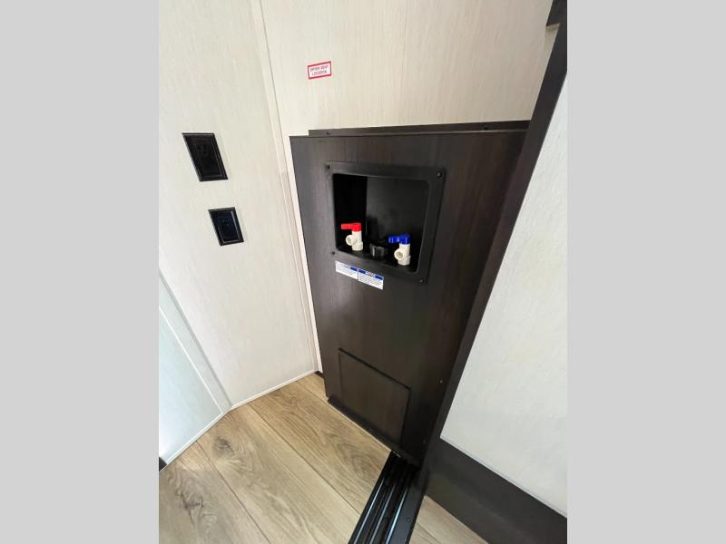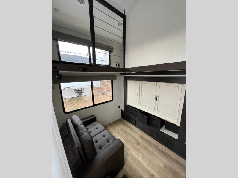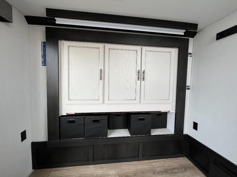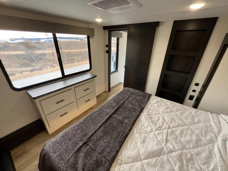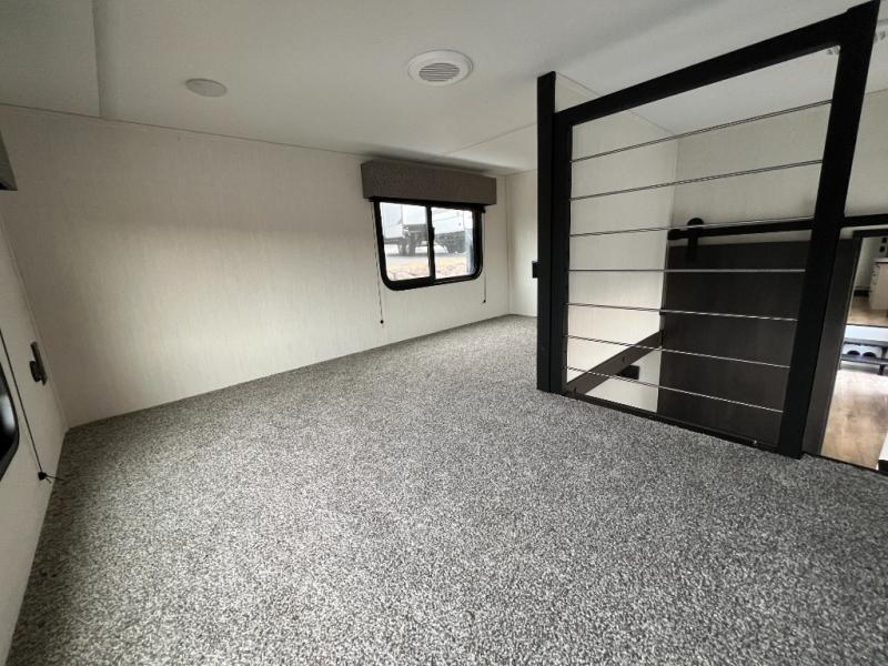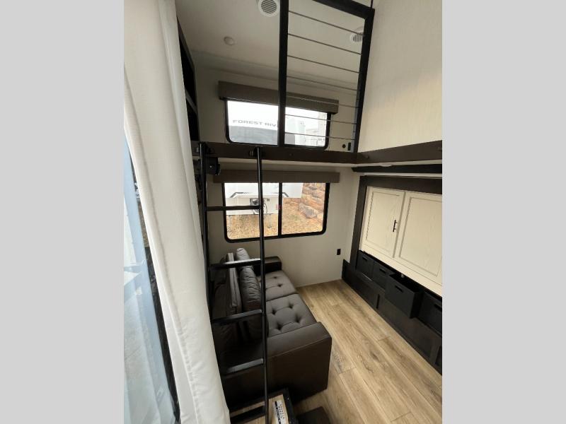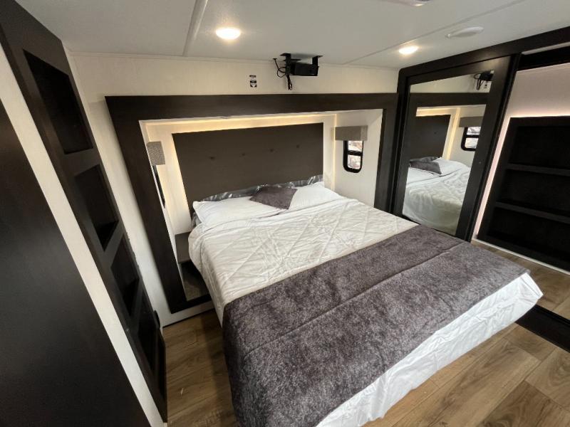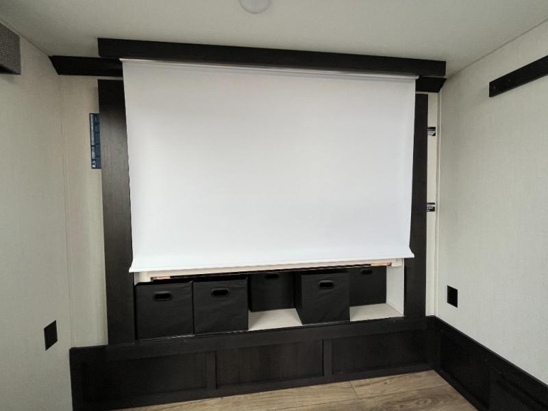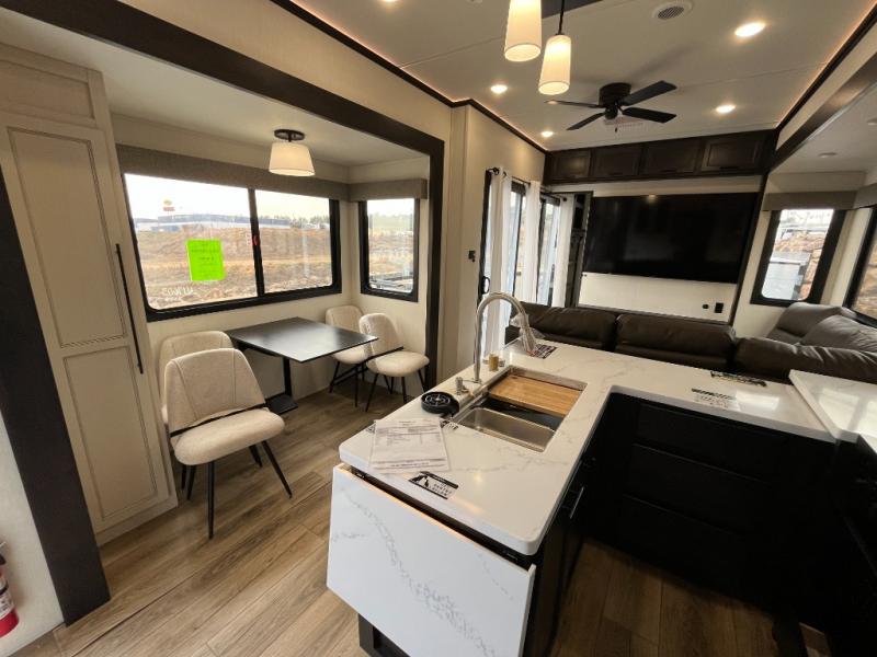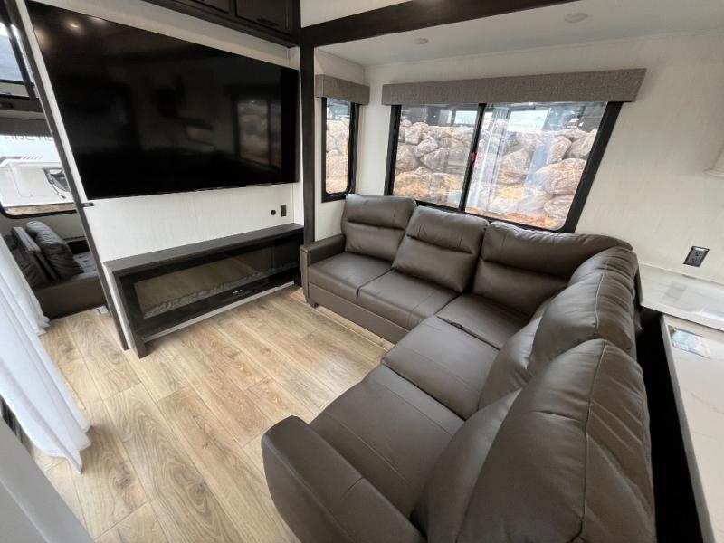 This is the perfect fifth wheel if you enjoy camping with friends and family! You'll have the front private bedroom with a camper king bed slide all to yourselves, while your guests take the rear den. There is a tri-fold sofa here, along with a wardrobe with a desk, additional shelves plus a loft above this room for even more sleeping or storage space! The main living room features an L-shaped sectional sofa, a fireplace and an entertainment center. And the patio deck with a 12' awning is right off of this room so you can visit with friends indoors or outdoors! There is generous counter space in the full kitchen, along with a pull-out storage drawer and a versatile dinette/desk. There are many more stand-out features found in this fifth wheel, including washer and dryer prep in the front bedroom, a 70" projector screen in the rear den, a second power awning, and the list goes on!