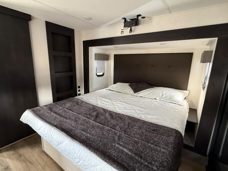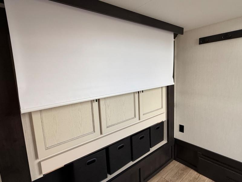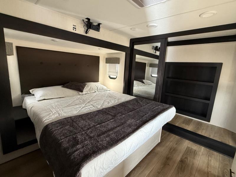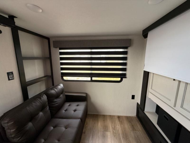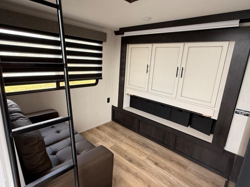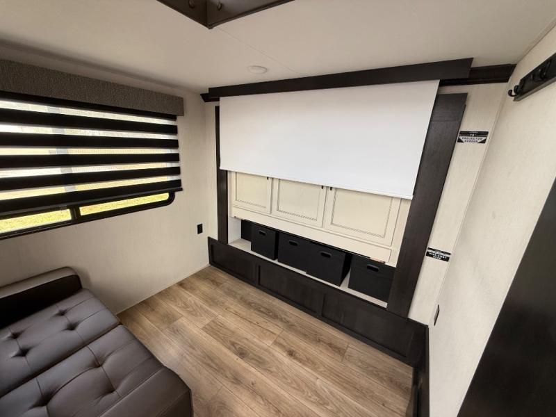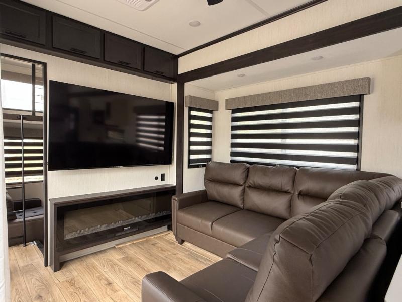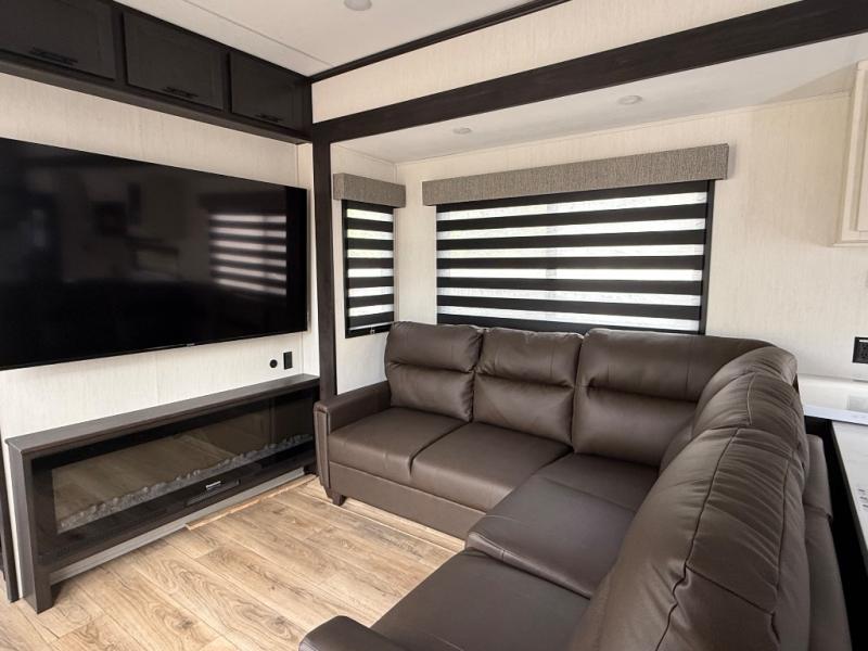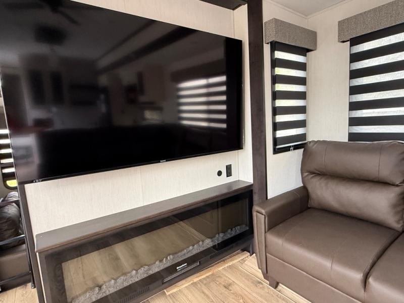This is the perfect fifth wheel if you enjoy camping with friends and family! You'll have the front private bedroom with a camper king bed slide all to yourselves, while your guests take the rear den. There is a tri-fold sofa here, along with a wardrobe with a desk, additional shelves plus a loft above this room for even more sleeping or storage space! The main living room features an L-shaped sectional sofa, a fireplace and an entertainment center. And the patio deck with a 12' awning is right off of this room so you can visit with friends indoors or outdoors! There is generous counter space in the full kitchen, along with a pull-out storage drawer and a versatile dinette/desk. There are many more stand-out features found in this fifth wheel, including washer and dryer prep in the front bedroom, a 70" projector screen in the rear den, a second power awning, and the list goes on!