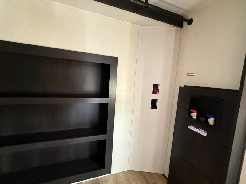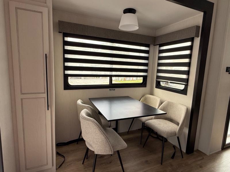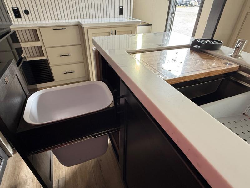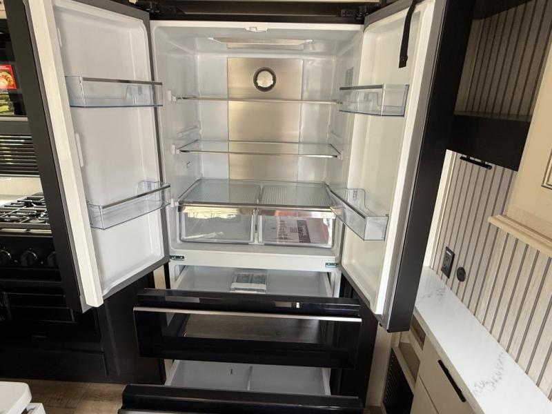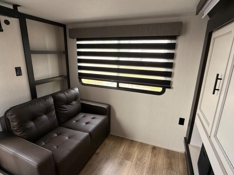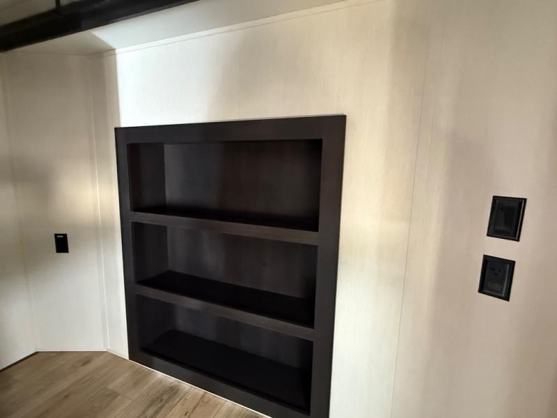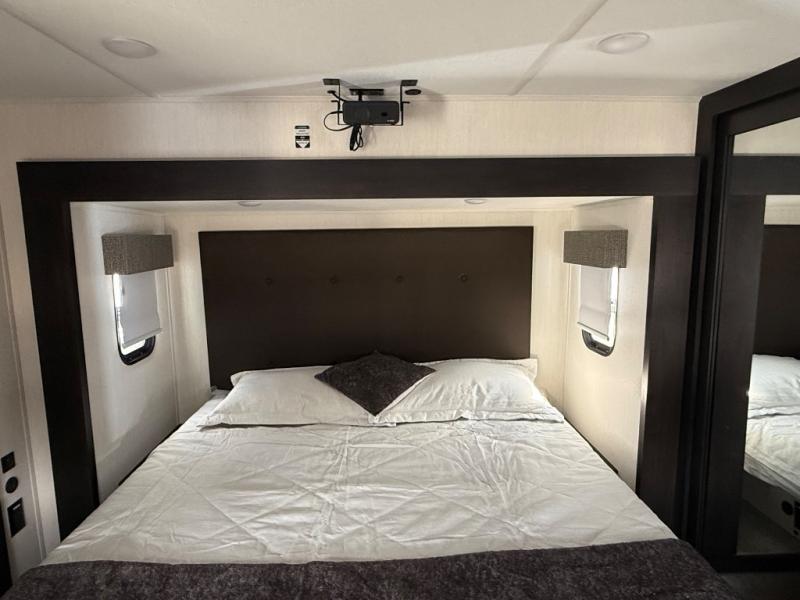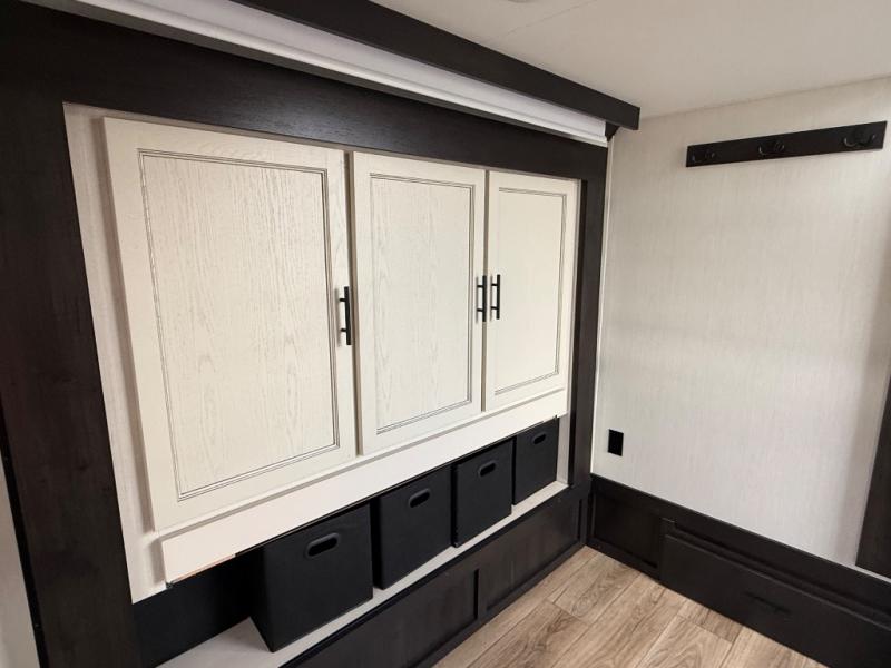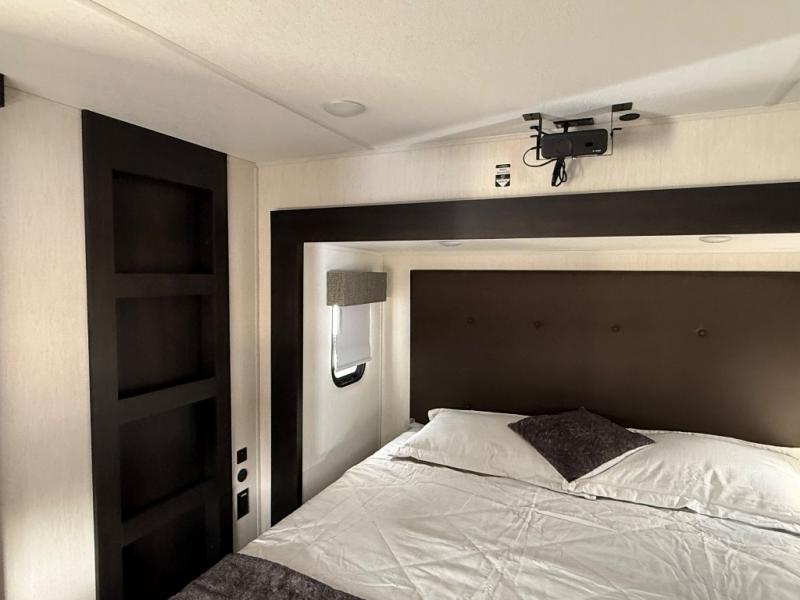 This is the perfect fifth wheel if you enjoy camping with friends and family! You'll have the front private bedroom with a camper king bed slide all to yourselves, while your guests take the rear den. There is a tri-fold sofa here, along with a wardrobe with a desk, additional shelves plus a loft above this room for even more sleeping or storage space! The main living room features an L-shaped sectional sofa, a fireplace and an entertainment center. And the patio deck with a 12' awning is right off of this room so you can visit with friends indoors or outdoors! There is generous counter space in the full kitchen, along with a pull-out storage drawer and a versatile dinette/desk. There are many more stand-out features found in this fifth wheel, including washer and dryer prep in the front bedroom, a 70" projector screen in the rear den, a second power awning, and the list goes on!