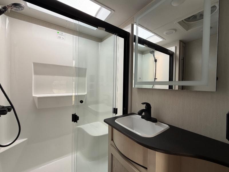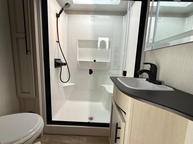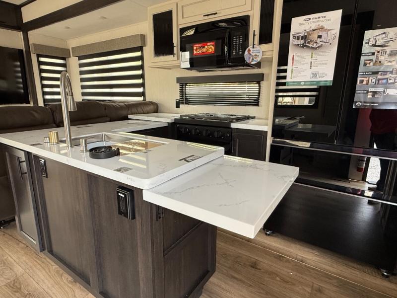 You will experience luxurious camping trips at an affordable price with any one of these Forest River Cherokee Sabre fifth wheels! These models are durable and ready to travel anytime of the year thanks to features like the high-gloss gel-coat front cap with LED lighting, the PVC roof membrane, and the forced air underbelly with enclosed gate valves. The electric auto-leveling system makes setting up easy and safe, and the adjustable power awning with LED lighting will create an inviting outdoor living space. Each model includes a universal docking station which includes a black tank flush and an outside shower, and adjustable stable steps for you to enter and exit the unit safely. Inside, you will love the design of the ambient accent lighting in the living area, the real wood lumbercore cabinetry, and the linoleum flooring!