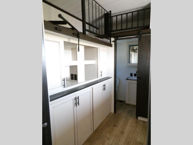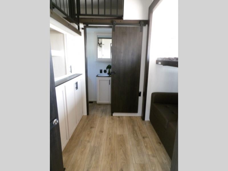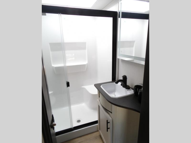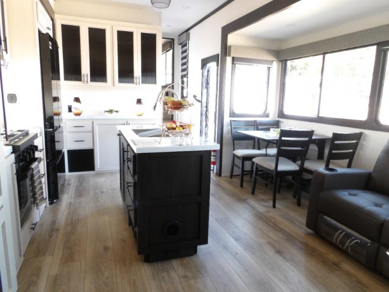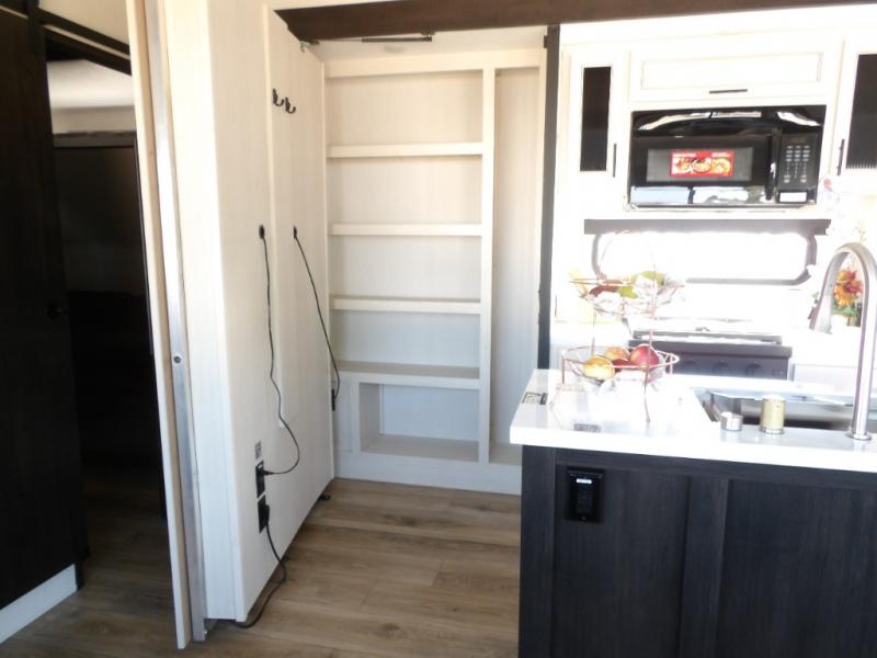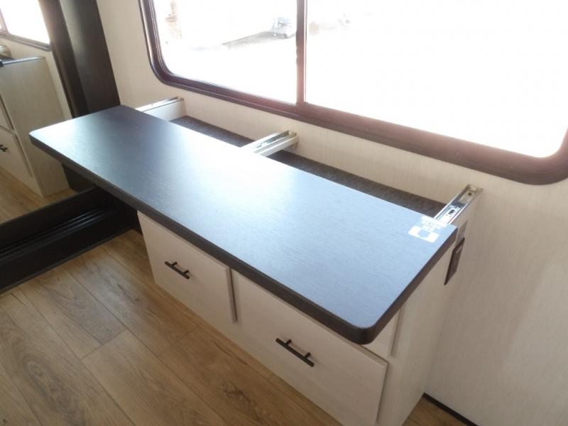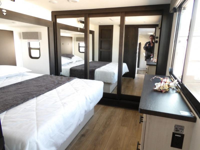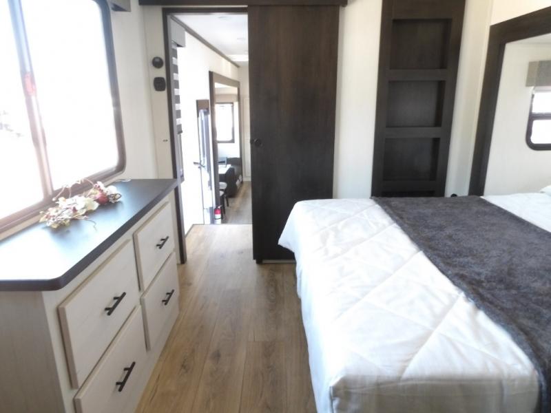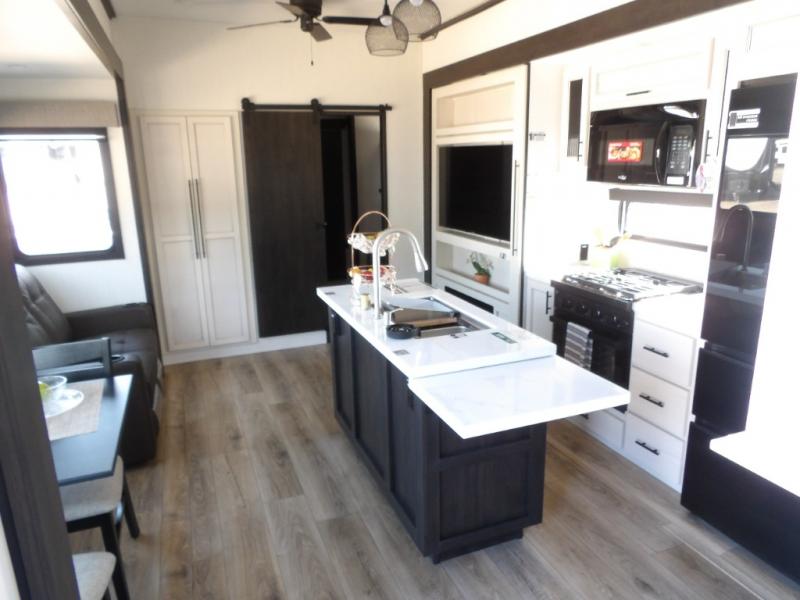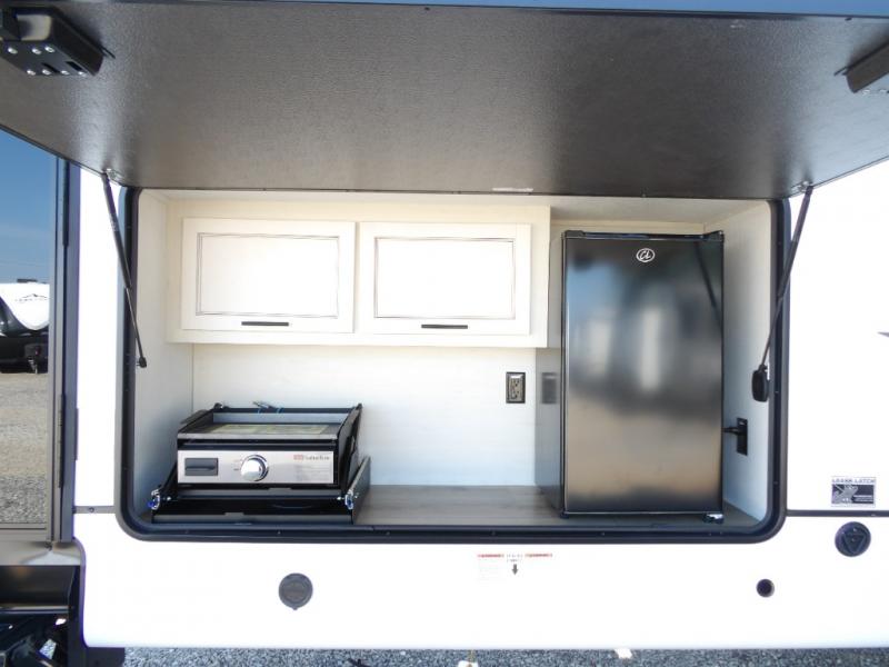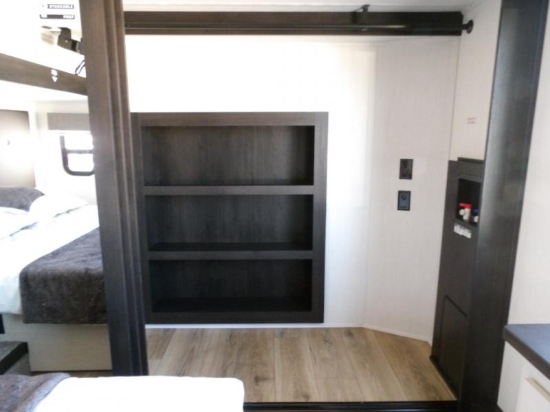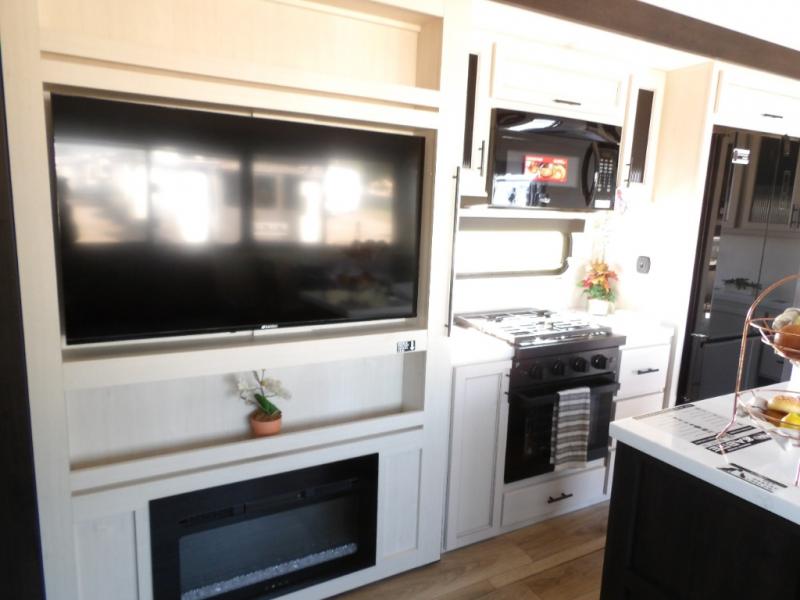 You won't believe all that this fifth wheel has to offer! Enjoy a good night's rest each night on the camper king bed slide in the front private bedroom which also has a front wardrobe with washer and dryer prep, and the rest of your group can sleep in the second bedroom. Inside this bedroom is a slide that houses a tri-fold sofa with a flip-up bunk above it, an entertainment center with storage, and a loft area above it all with two bunks and cabinets. The rear bedroom even has its very own rear full bathroom with a 36" x 24" shower to freshen up in each morning and one of the dual entry doors to the unit. The chef will enjoy using the kitchen island to prepare their best home cooked meals and everyone can gather together at the versatile dinette/desk conveniently across from the entertainment center with a fireplace.