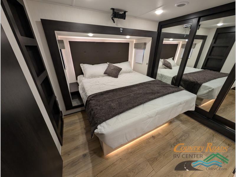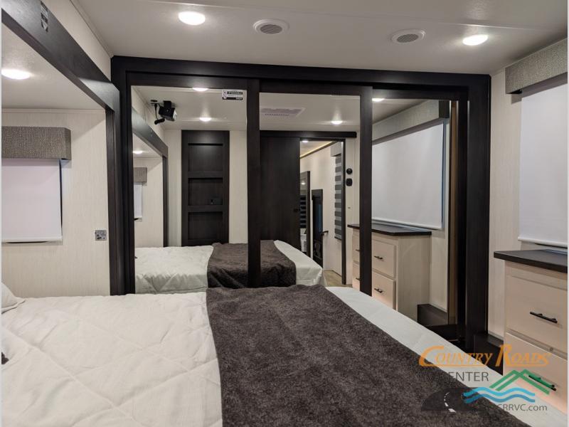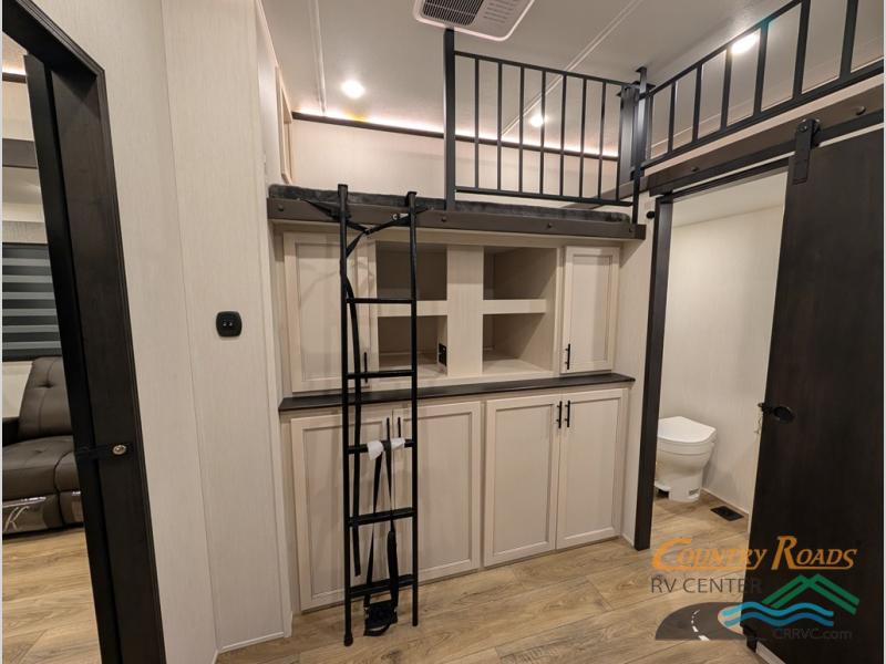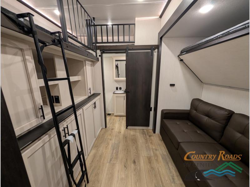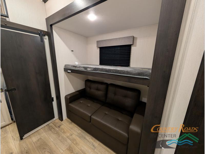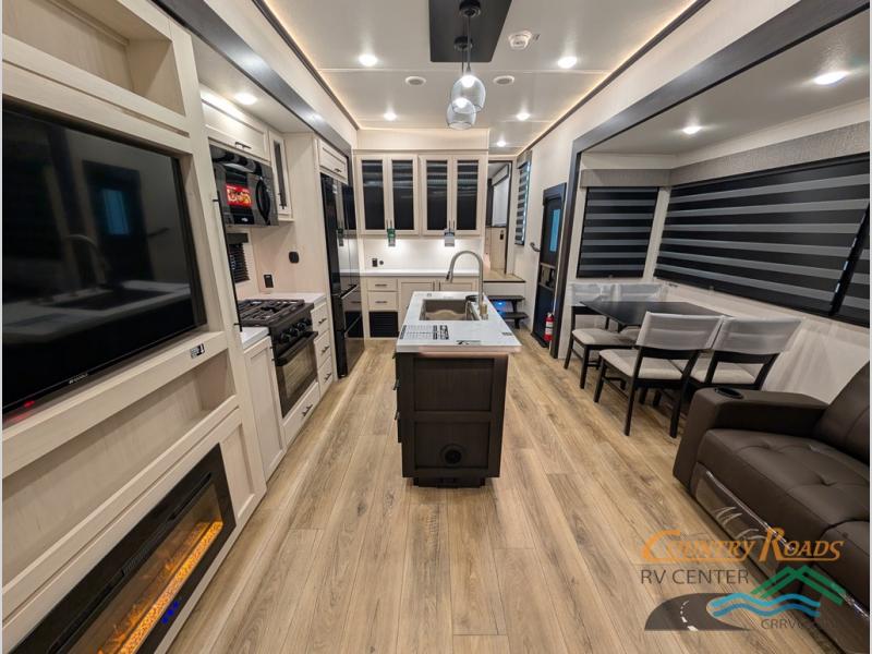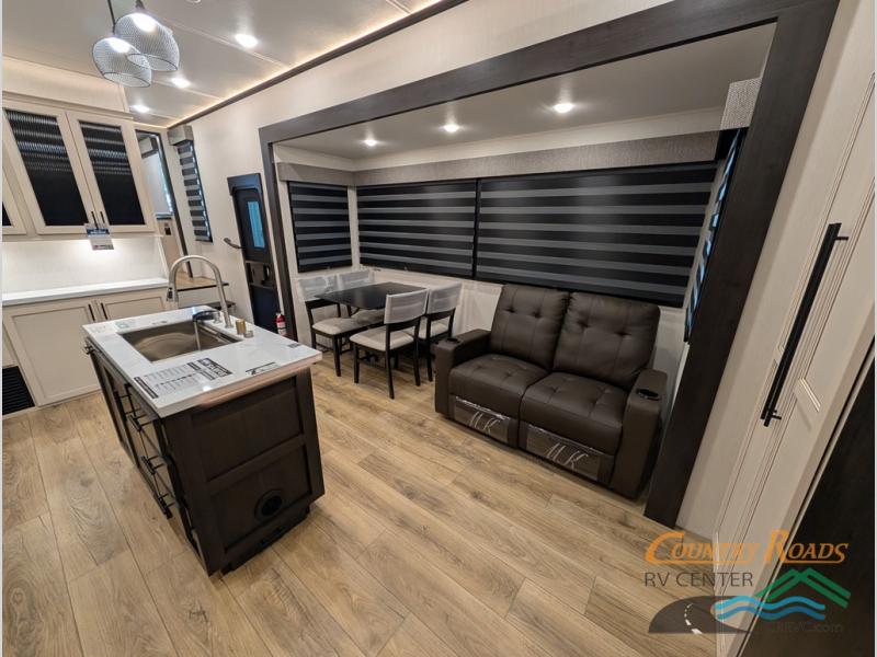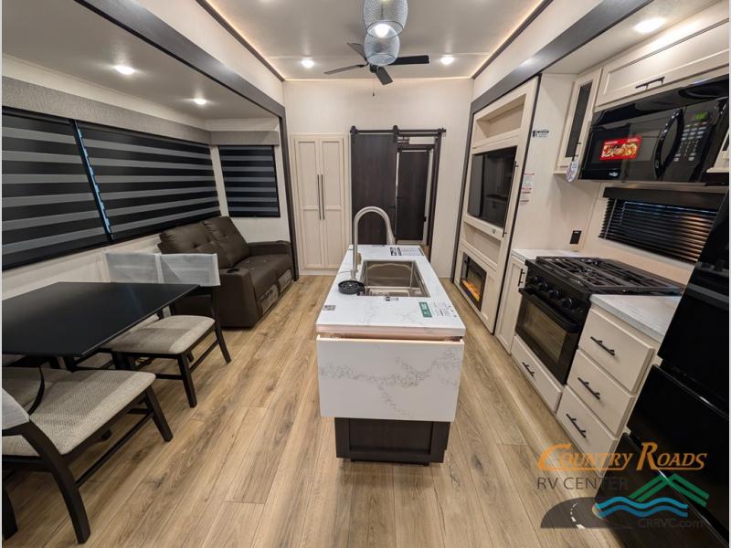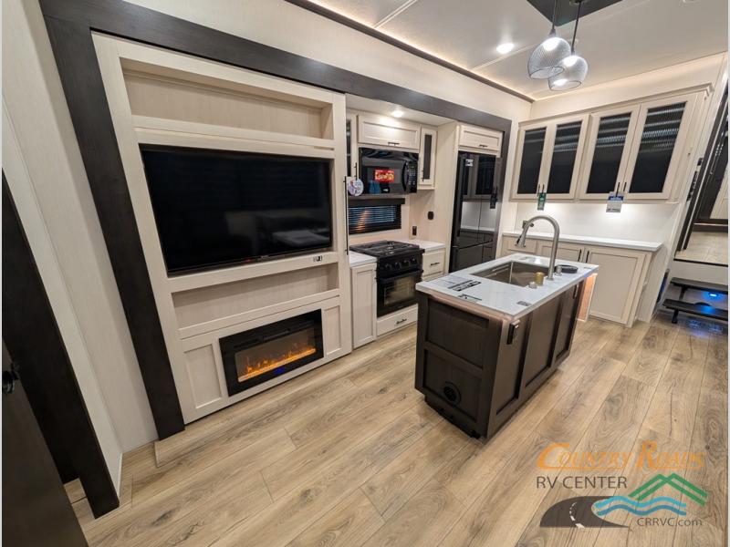You won't believe all that this fifth wheel has to offer! Enjoy a good night's rest each night on the camper king bed slide in the front private bedroom which also has a front wardrobe with washer and dryer prep, and the rest of your group can sleep in the second bedroom. Inside this bedroom is a slide that houses a tri-fold sofa with a flip-up bunk above it, an entertainment center with storage, and a loft area above it all with two bunks and cabinets. The rear bedroom even has its very own rear full bathroom with a 36" x 24" shower to freshen up in each morning and one of the dual entry doors to the unit. The chef will enjoy using the kitchen island to prepare their best home cooked meals and everyone can gather together at the versatile dinette/desk conveniently across from the entertainment center with a fireplace.