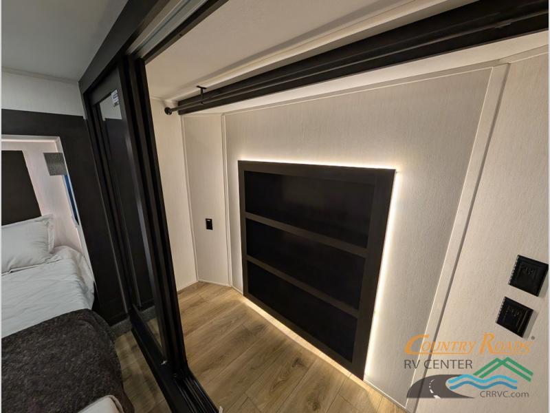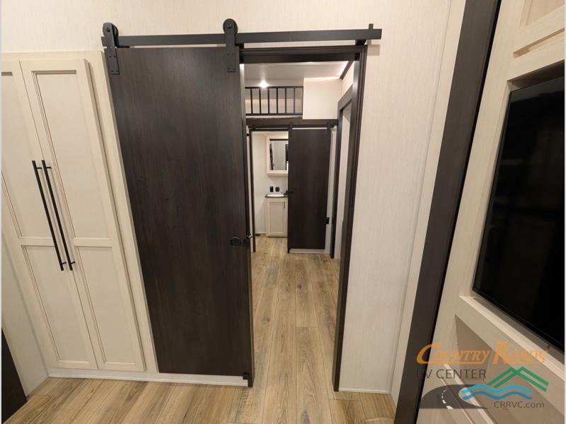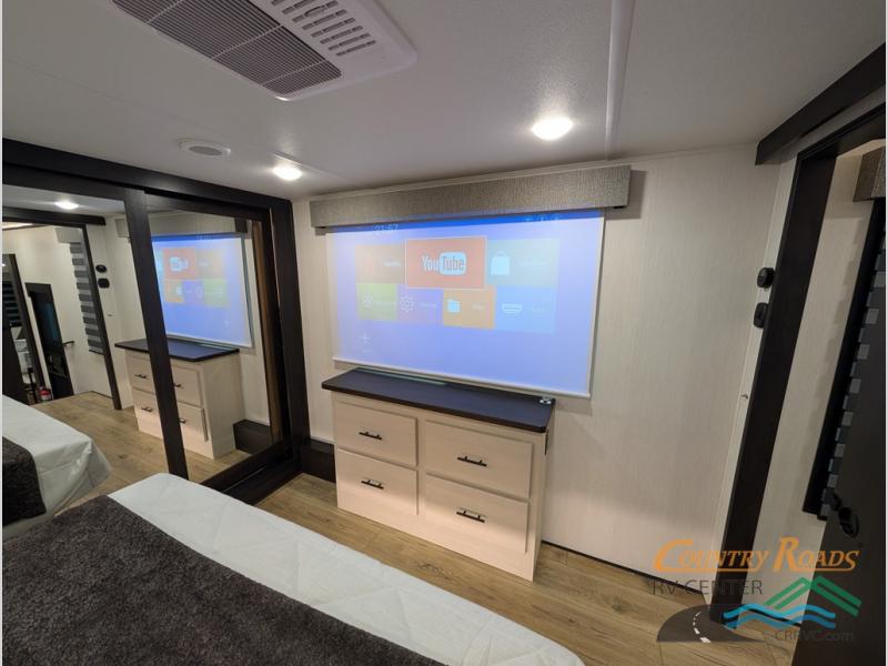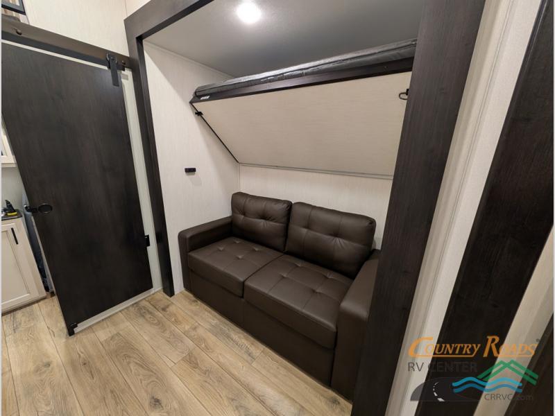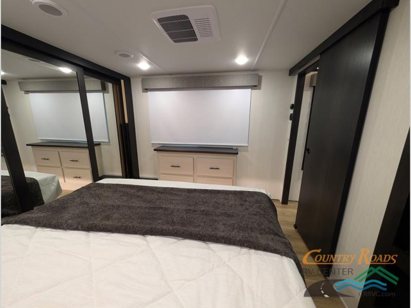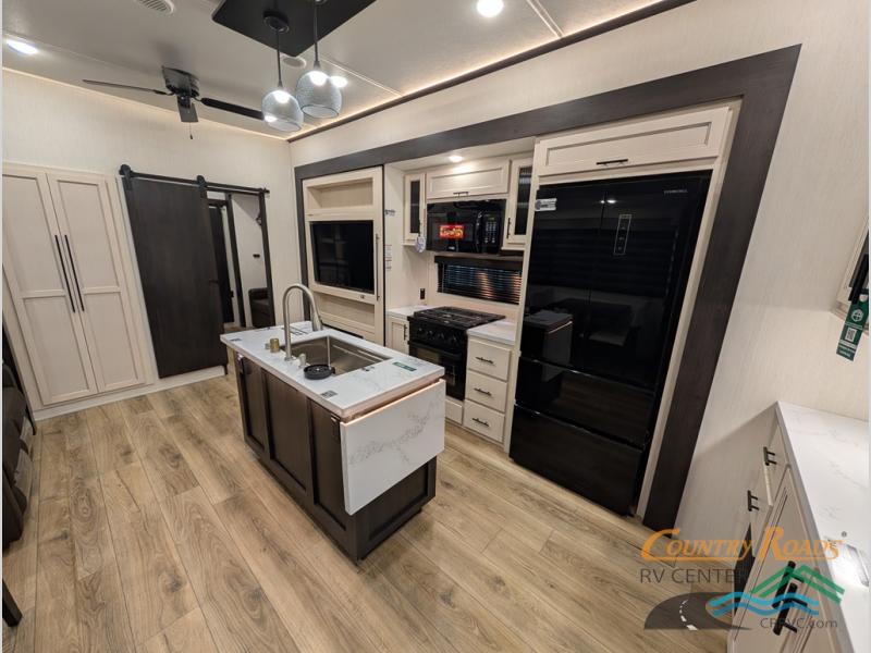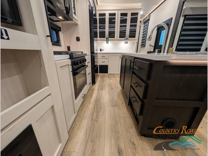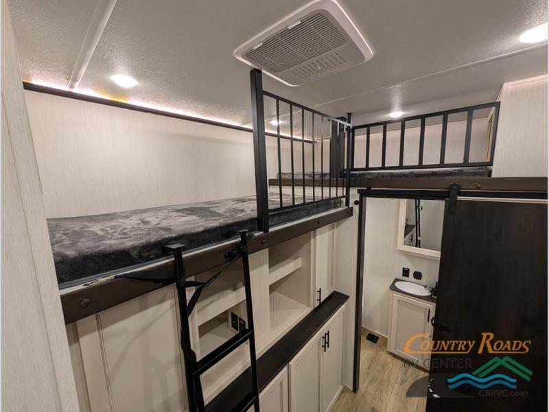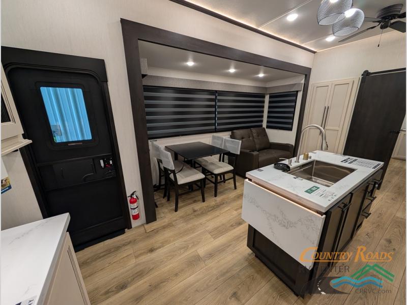 You won't believe all that this fifth wheel has to offer! Enjoy a good night's rest each night on the camper king bed slide in the front private bedroom which also has a front wardrobe with washer and dryer prep, and the rest of your group can sleep in the second bedroom. Inside this bedroom is a slide that houses a tri-fold sofa with a flip-up bunk above it, an entertainment center with storage, and a loft area above it all with two bunks and cabinets. The rear bedroom even has its very own rear full bathroom with a 36" x 24" shower to freshen up in each morning and one of the dual entry doors to the unit. The chef will enjoy using the kitchen island to prepare their best home cooked meals and everyone can gather together at the versatile dinette/desk conveniently across from the entertainment center with a fireplace.