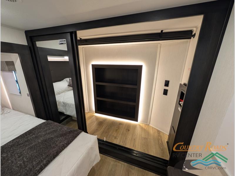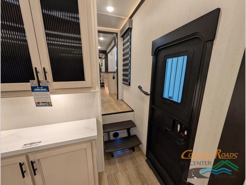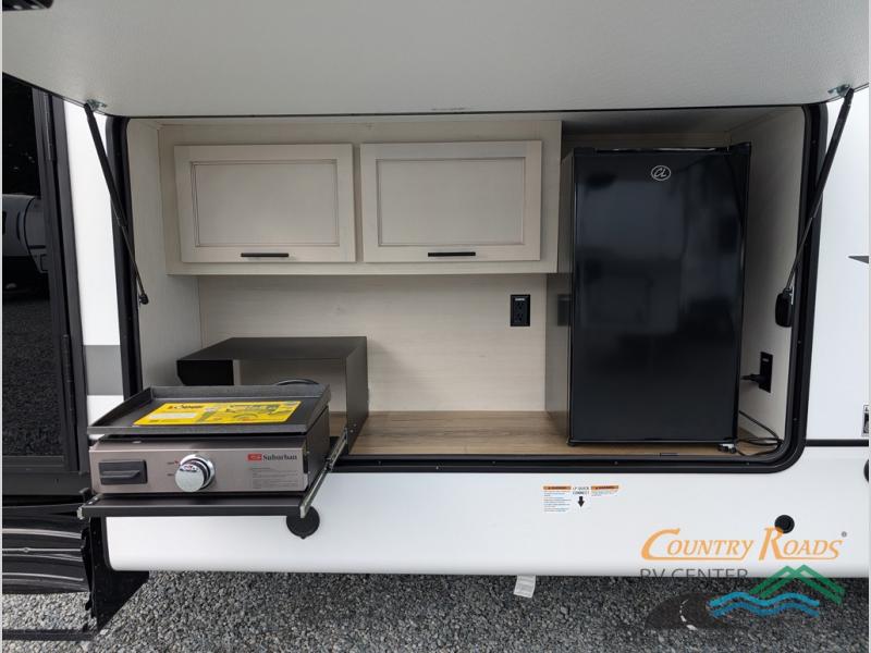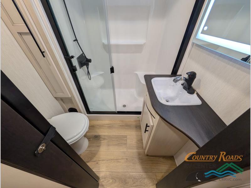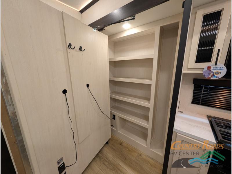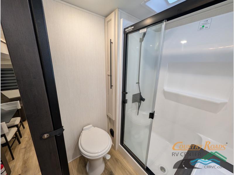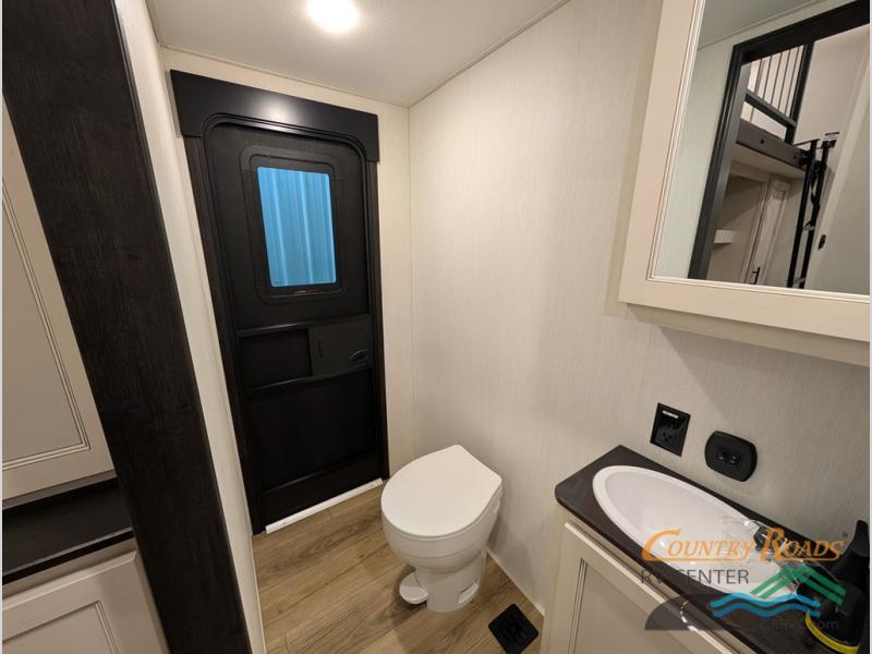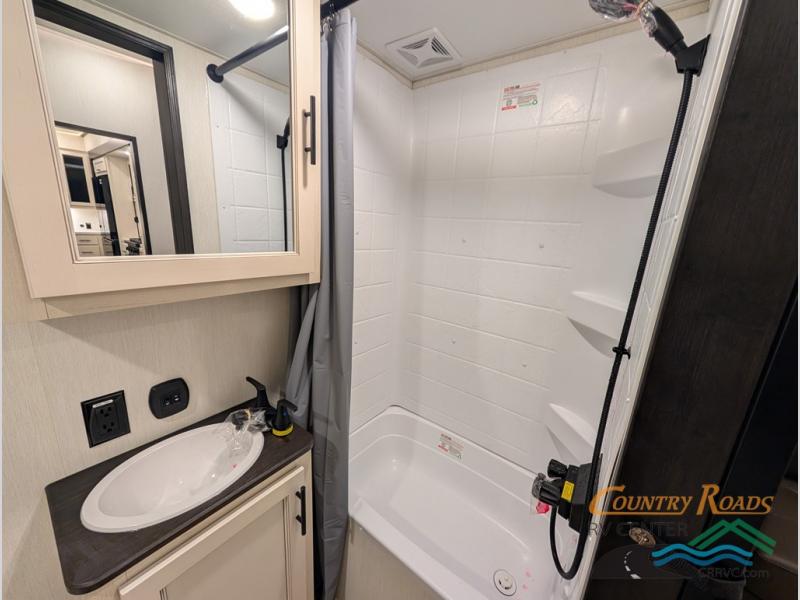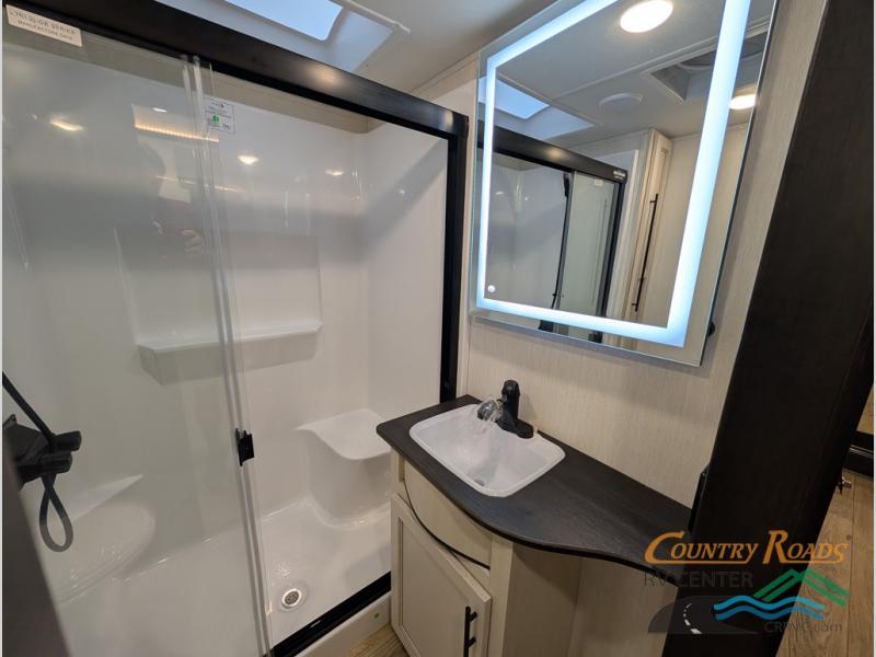 You won't believe all that this fifth wheel has to offer! Enjoy a good night's rest each night on the camper king bed slide in the front private bedroom which also has a front wardrobe with washer and dryer prep, and the rest of your group can sleep in the second bedroom. Inside this bedroom is a slide that houses a tri-fold sofa with a flip-up bunk above it, an entertainment center with storage, and a loft area above it all with two bunks and cabinets. The rear bedroom even has its very own rear full bathroom with a 36" x 24" shower to freshen up in each morning and one of the dual entry doors to the unit. The chef will enjoy using the kitchen island to prepare their best home cooked meals and everyone can gather together at the versatile dinette/desk conveniently across from the entertainment center with a fireplace.