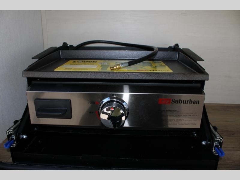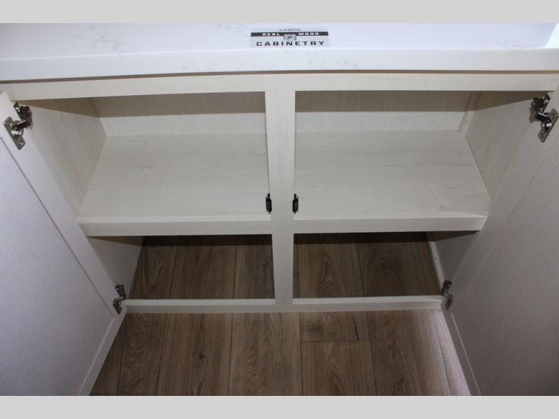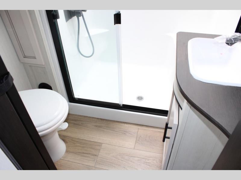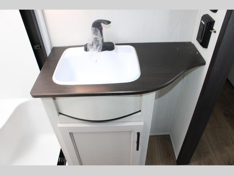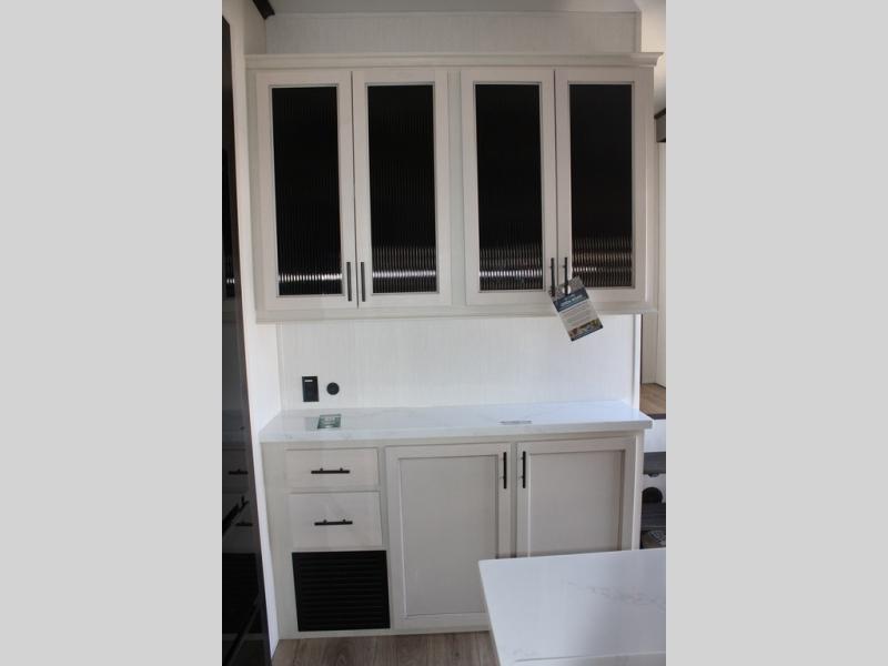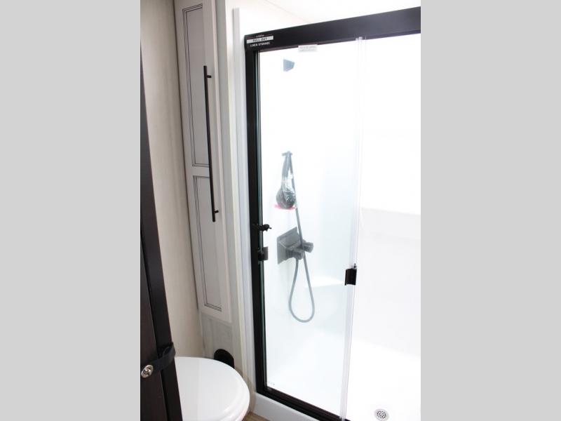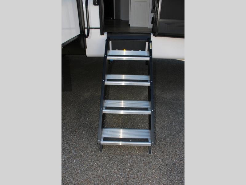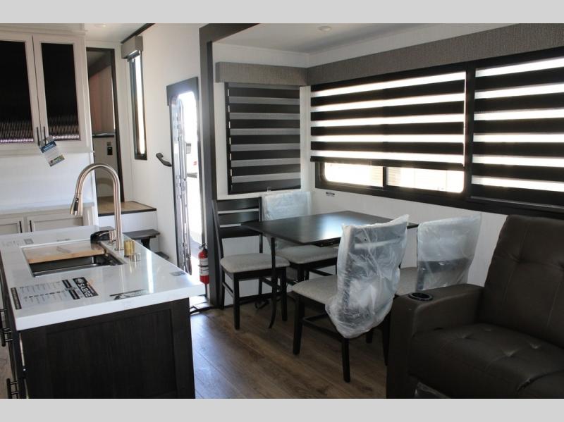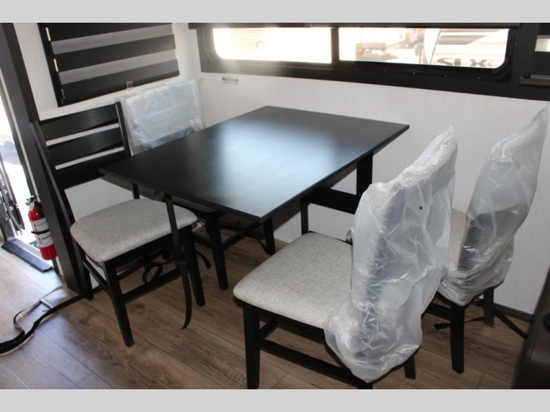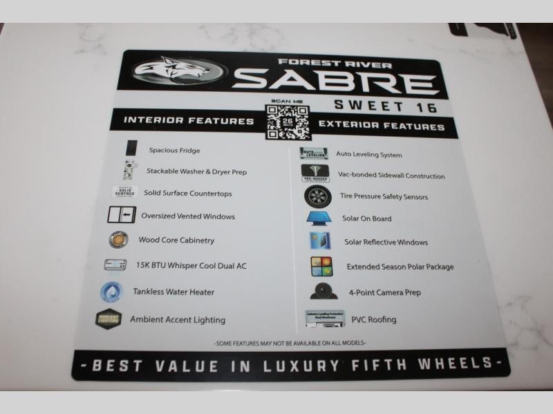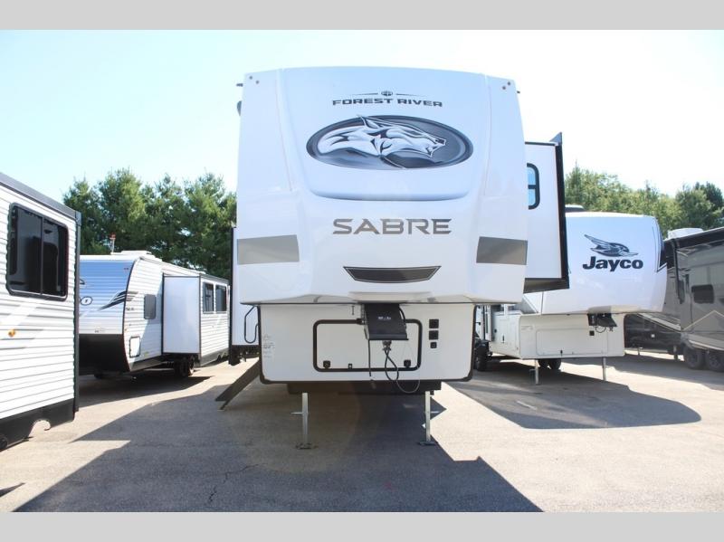 You will experience luxurious camping trips at an affordable price with any one of these Forest River Sabre fifth wheels! These models are durable and ready to travel anytime of the year thanks to features like the high-gloss gel-coat front cap with LED lighting, the PVC roof membrane, and the forced air underbelly with enclosed gate valves. The electric auto-leveling system makes setting up easy and safe, and the adjustable power awning with LED lighting will create an inviting outdoor living space. Each model includes a universal docking station which includes a black tank flush and an outside shower, and detachable and adjustable stable steps for you to enter and exit the unit safely. Inside, you will love the design of the ambient accent lighting in the living area, the real wood lumbercore cabinetry, and the linoleum flooring!