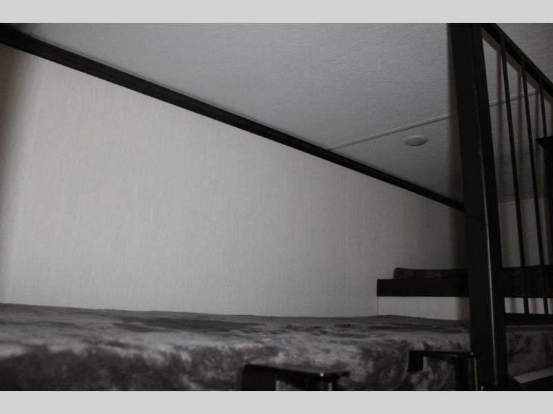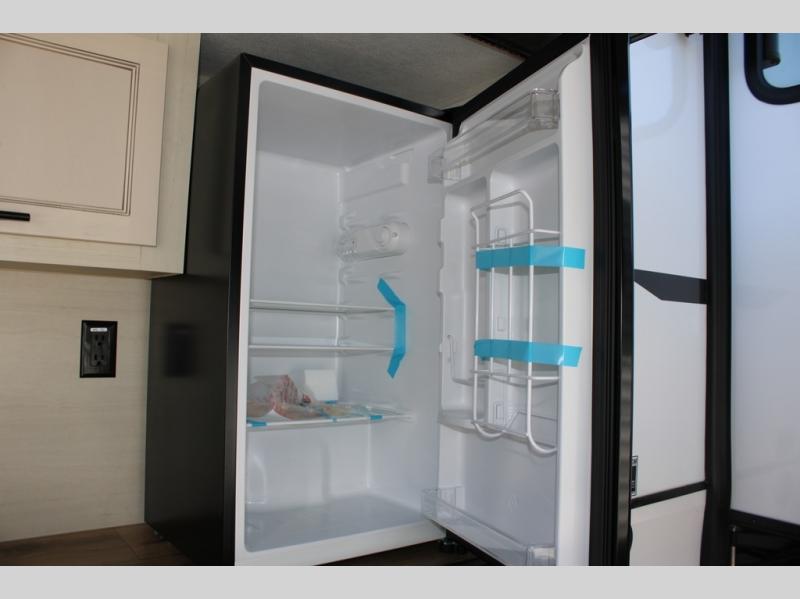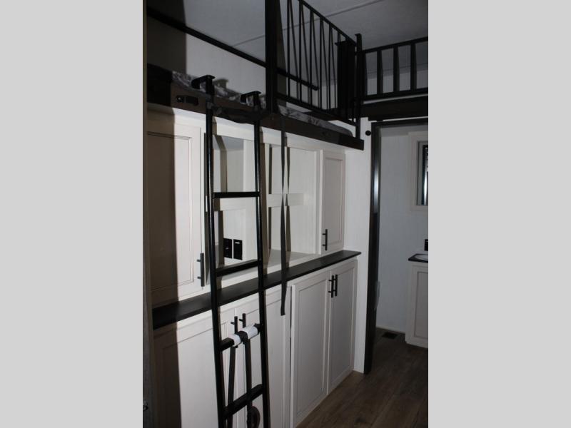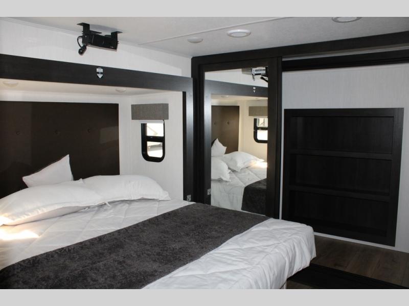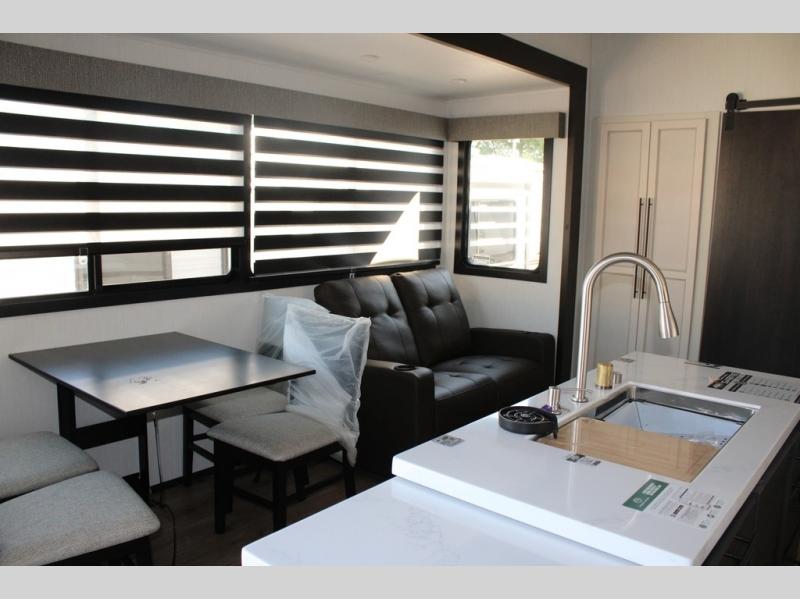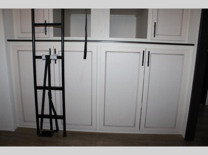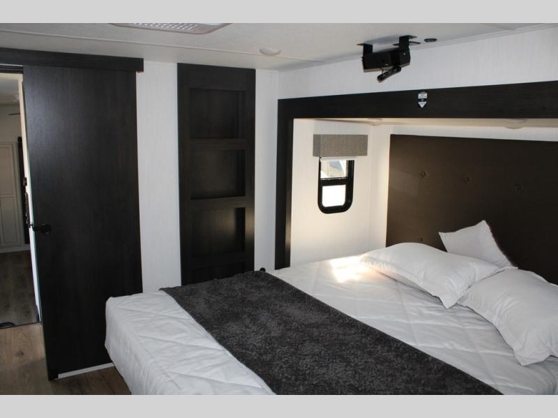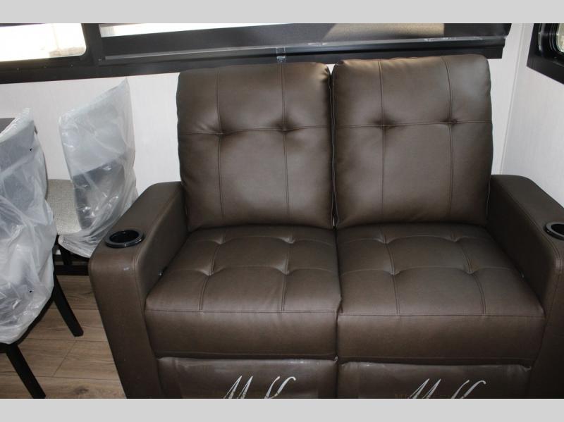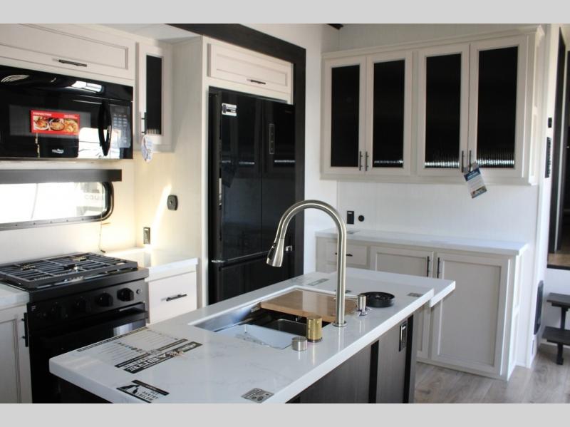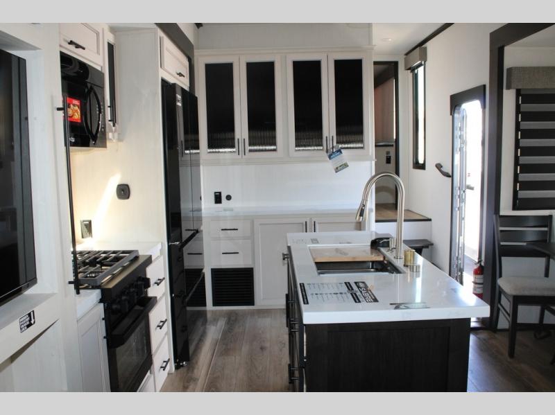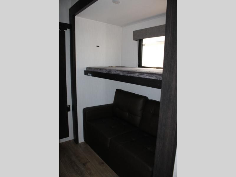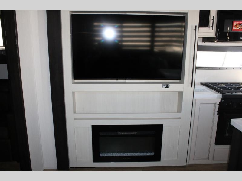 You won't believe all that this fifth wheel has to offer! Enjoy a good night's rest each night on the camper king bed slide in the front private bedroom which also has a front wardrobe with washer and dryer prep, and the rest of your group can sleep in the second bedroom. Inside this bedroom is a slide that houses a tri-fold sofa with a flip-up bunk above it, an entertainment center with storage, and a loft area above it all with two bunks and cabinets. The rear bedroom even has its very own rear full bathroom with a 36" x 24" shower to freshen up in each morning and one of the dual entry doors to the unit. The chef will enjoy using the kitchen island to prepare their best home cooked meals and everyone can gather together at the versatile dinette/desk conveniently across from the entertainment center with a fireplace.