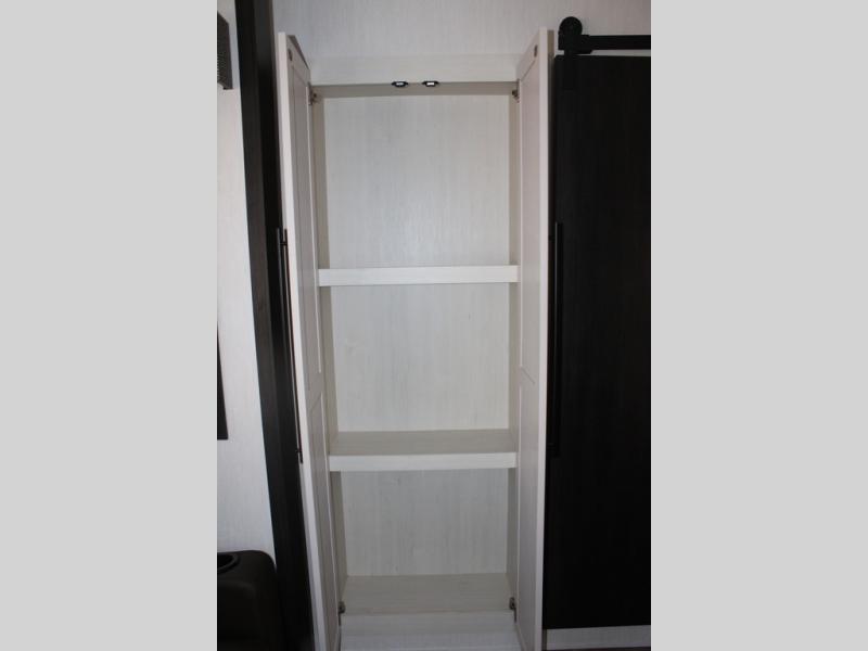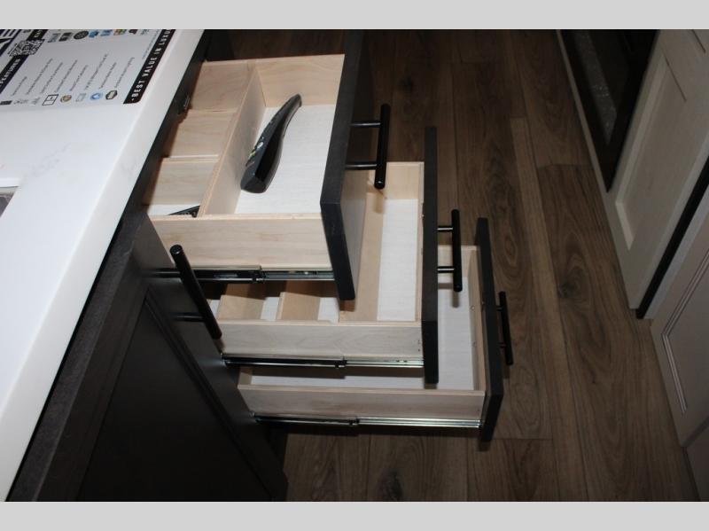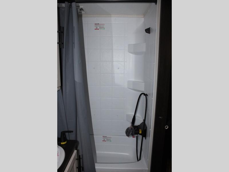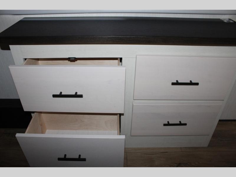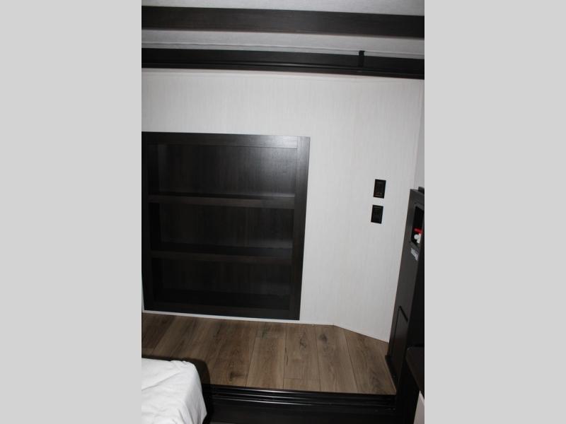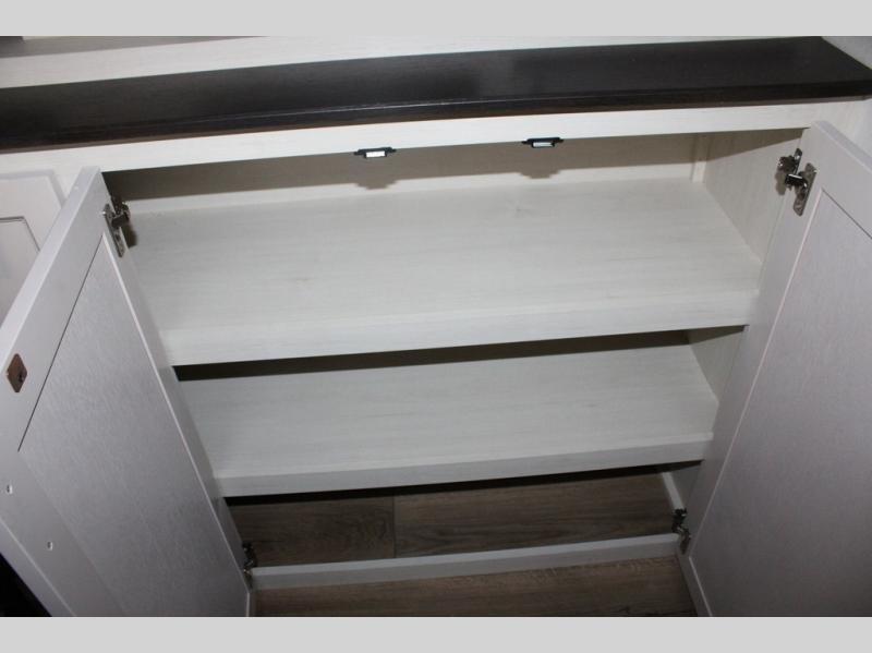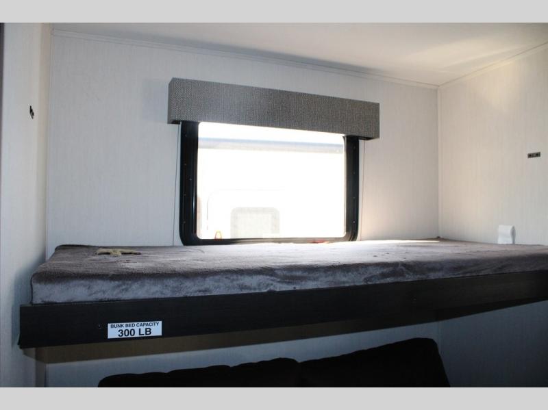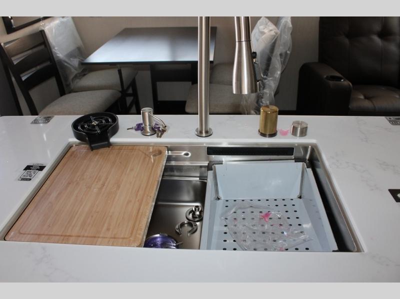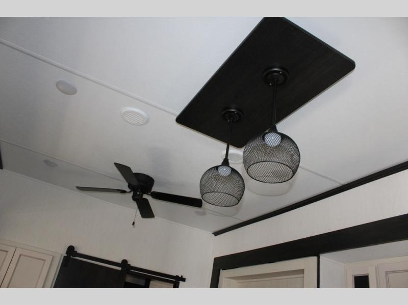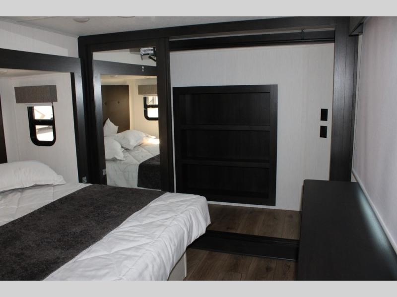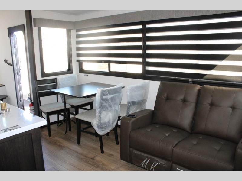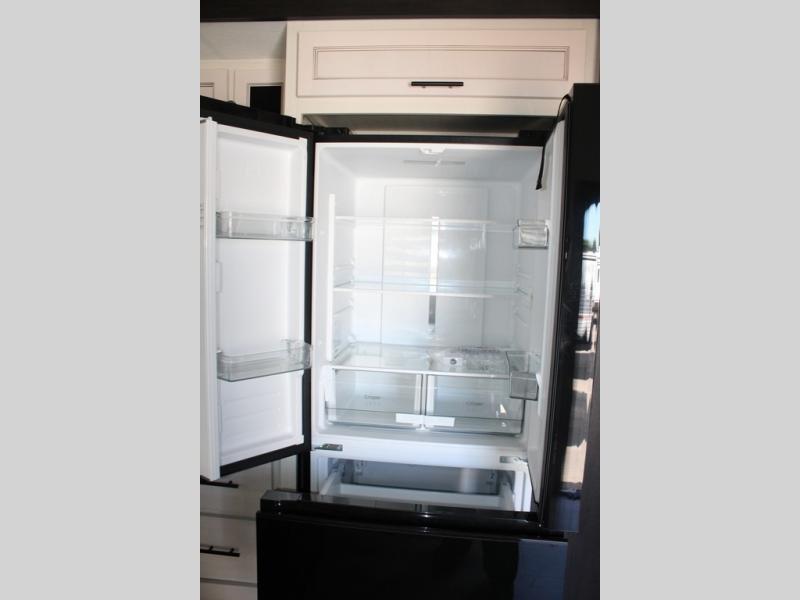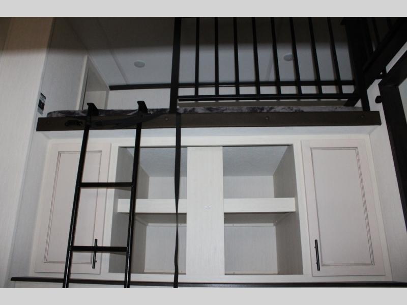 You won't believe all that this fifth wheel has to offer! Enjoy a good night's rest each night on the camper king bed slide in the front private bedroom which also has a front wardrobe with washer and dryer prep, and the rest of your group can sleep in the second bedroom. Inside this bedroom is a slide that houses a tri-fold sofa with a flip-up bunk above it, an entertainment center with storage, and a loft area above it all with two bunks and cabinets. The rear bedroom even has its very own rear full bathroom with a 36" x 24" shower to freshen up in each morning and one of the dual entry doors to the unit. The chef will enjoy using the kitchen island to prepare their best home cooked meals and everyone can gather together at the versatile dinette/desk conveniently across from the entertainment center with a fireplace.