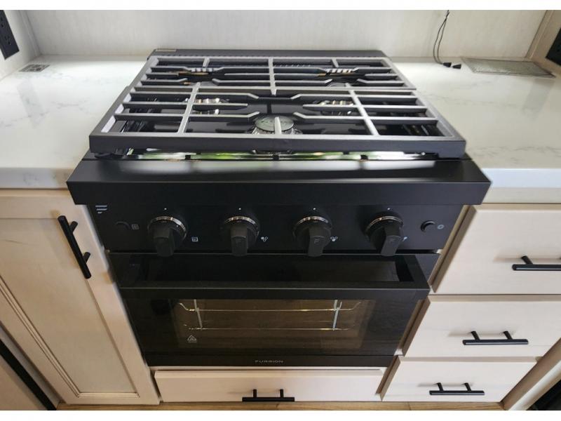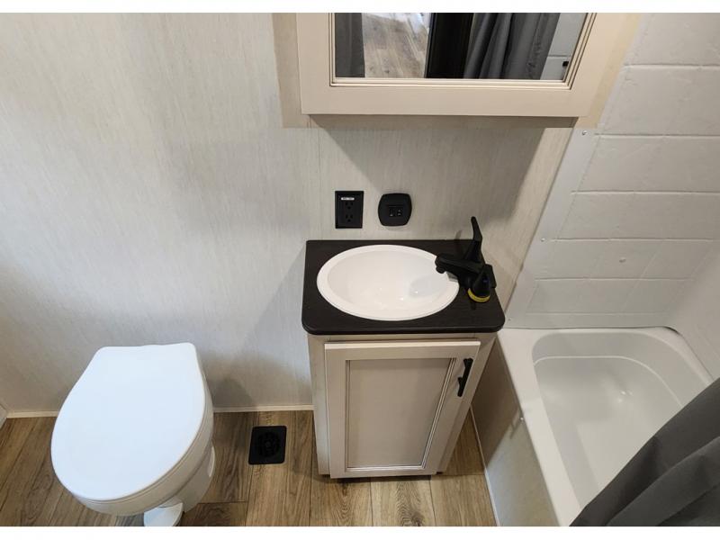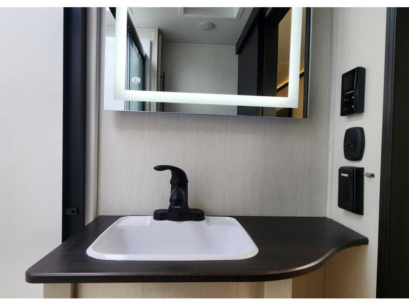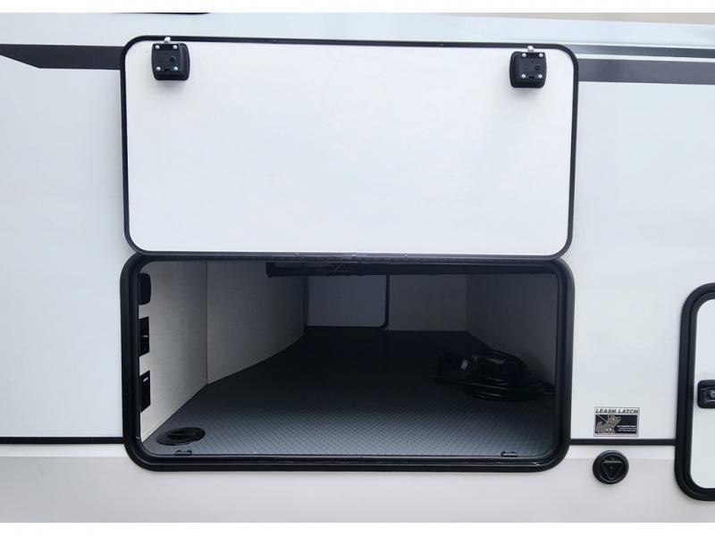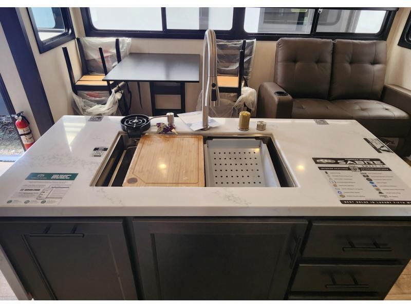 You will experience luxurious camping trips at an affordable price with any one of these Forest River Sabre fifth wheels! These models are durable and ready to travel anytime of the year thanks to features like the high-gloss gel-coat front cap with LED lighting, the PVC roof membrane, and the forced air underbelly with enclosed gate valves. The electric auto-leveling system makes setting up easy and safe, and the adjustable power awning with LED lighting will create an inviting outdoor living space. Each model includes a universal docking station which includes a black tank flush and an outside shower, and detachable and adjustable stable steps for you to enter and exit the unit safely. Inside, you will love the design of the ambient accent lighting in the living area, the real wood lumbercore cabinetry, and the linoleum flooring!