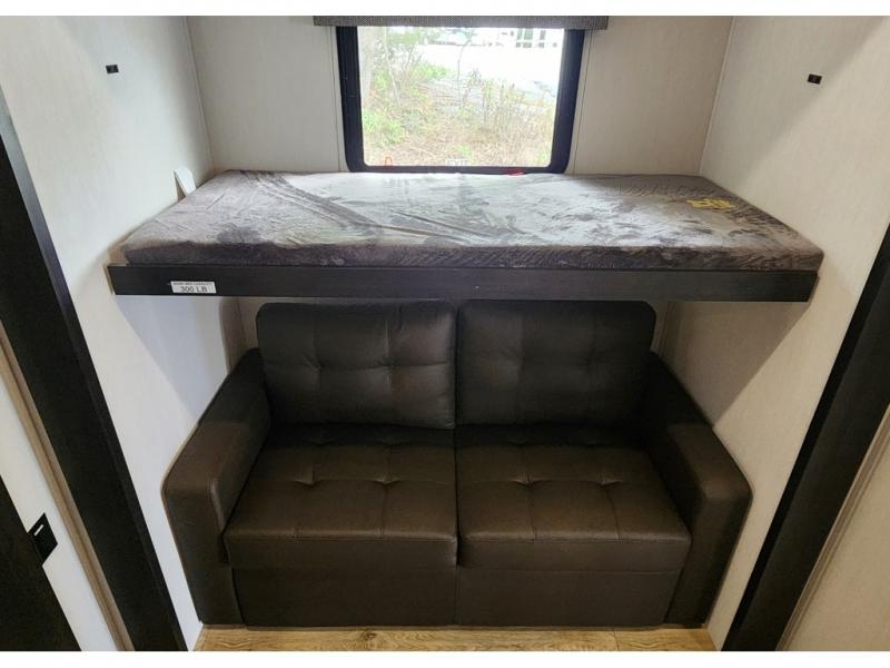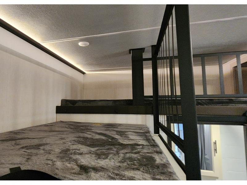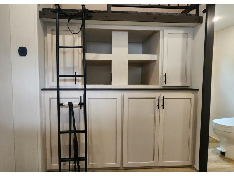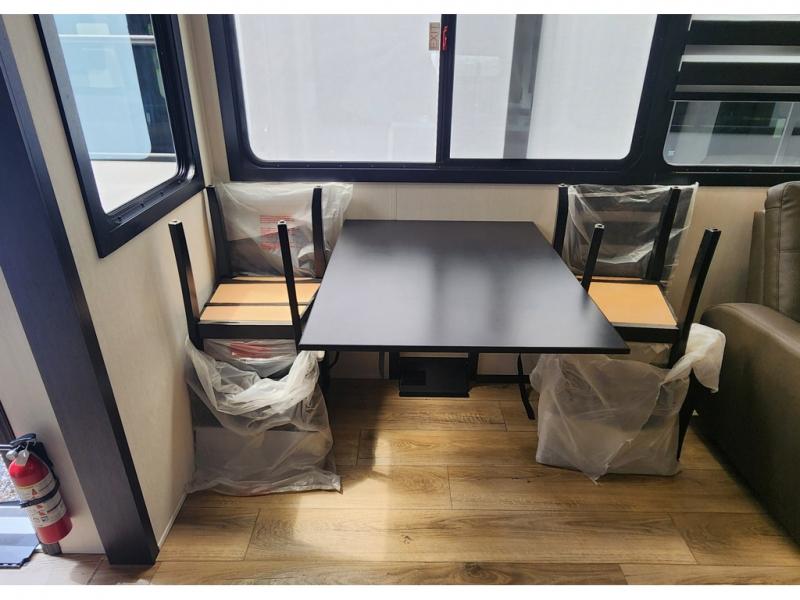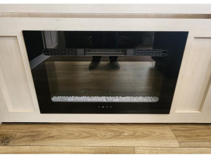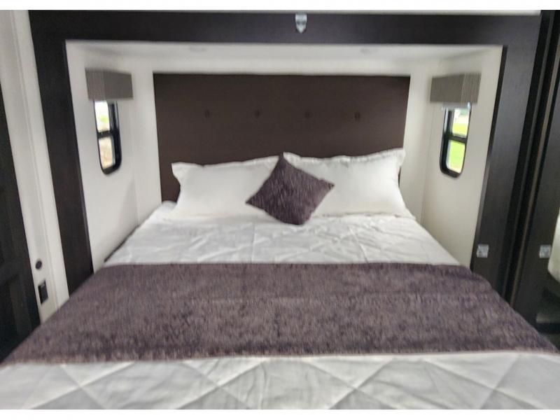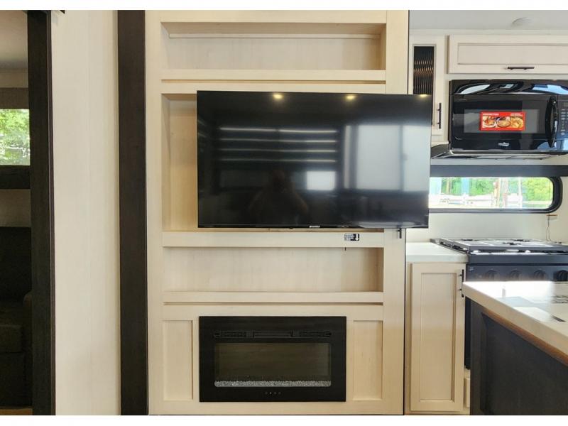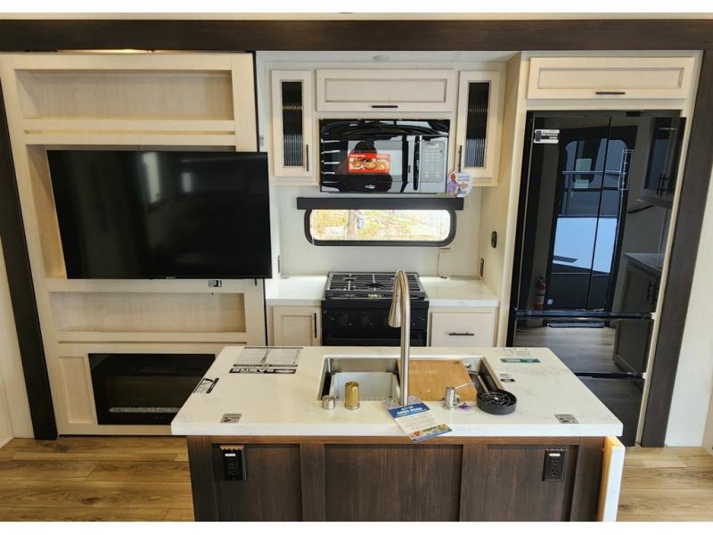 You won't believe all that this fifth wheel has to offer! Enjoy a good night's rest each night on the camper king bed slide in the front private bedroom which also has a front wardrobe with washer and dryer prep, and the rest of your group can sleep in the second bedroom. Inside this bedroom is a slide that houses a tri-fold sofa with a flip-up bunk above it, an entertainment center with storage, and a loft area above it all with two bunks and cabinets. The rear bedroom even has its very own rear full bathroom with a 36" x 24" shower to freshen up in each morning and one of the dual entry doors to the unit. The chef will enjoy using the kitchen island to prepare their best home cooked meals and everyone can gather together at the versatile dinette/desk conveniently across from the entertainment center with a fireplace.