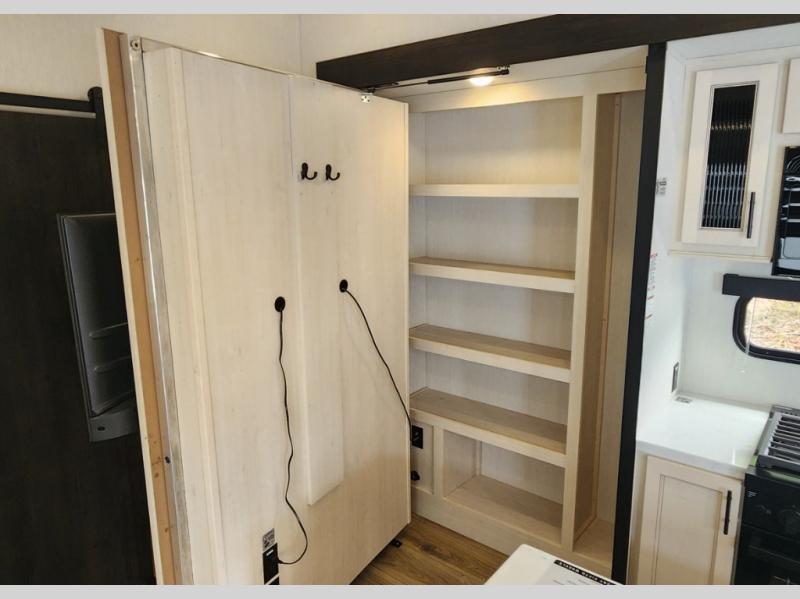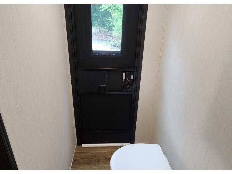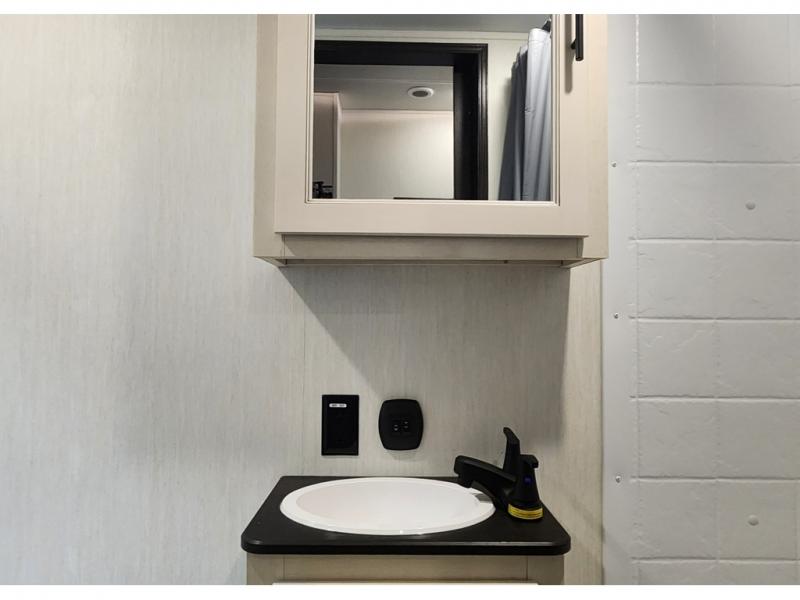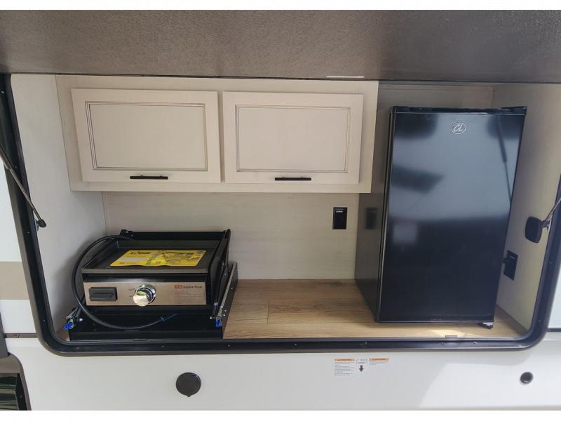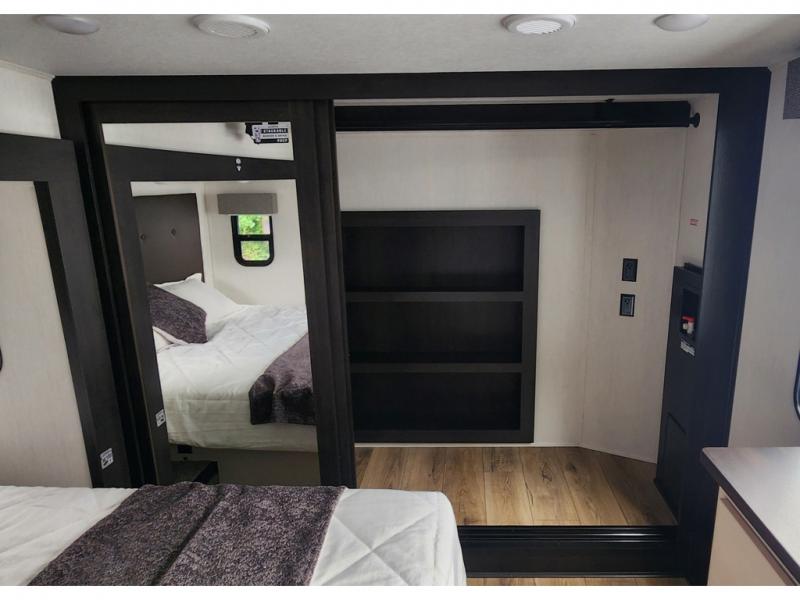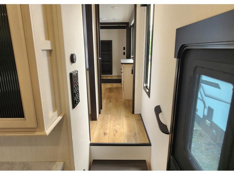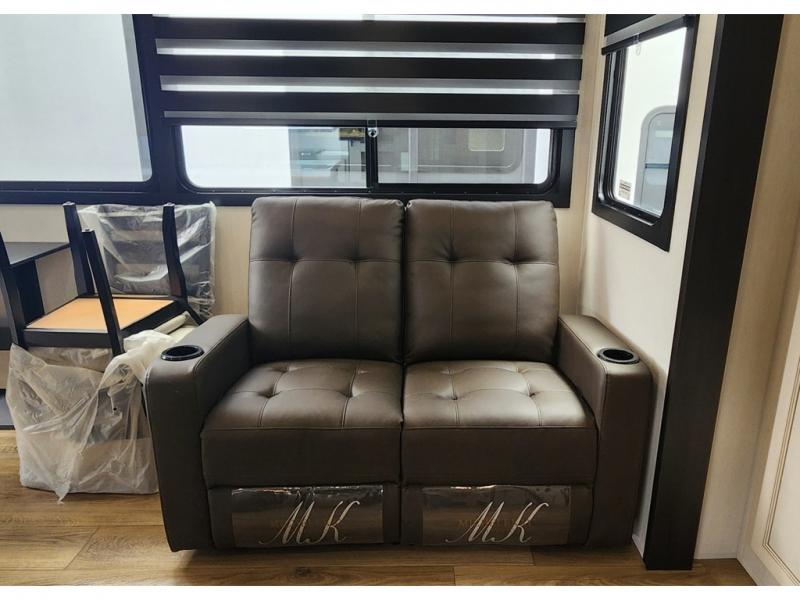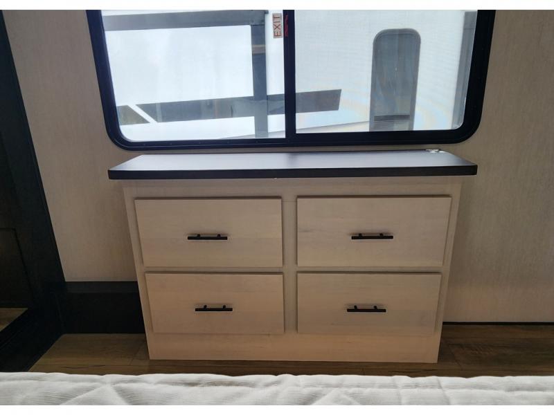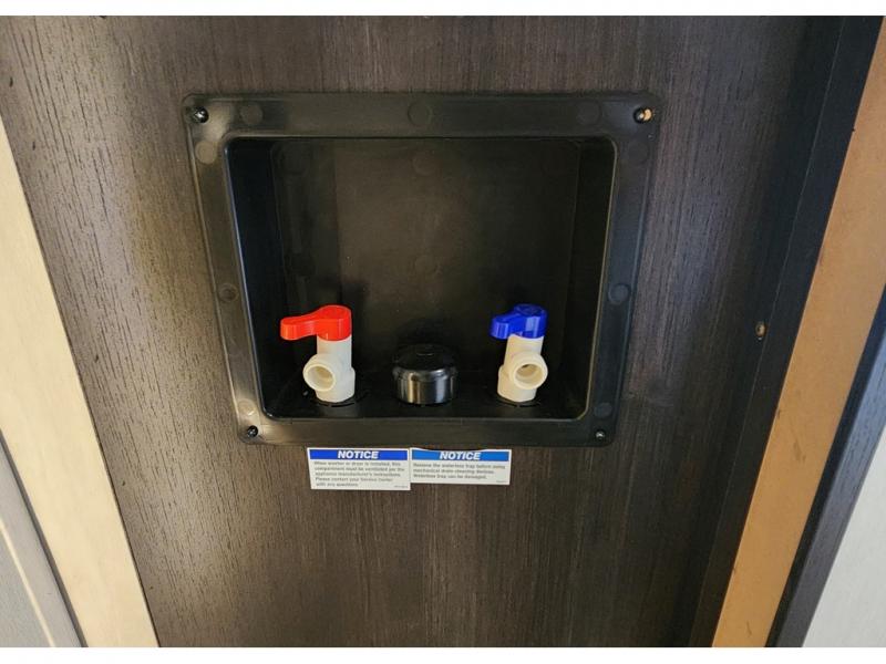 You won't believe all that this fifth wheel has to offer! Enjoy a good night's rest each night on the camper king bed slide in the front private bedroom which also has a front wardrobe with washer and dryer prep, and the rest of your group can sleep in the second bedroom. Inside this bedroom is a slide that houses a tri-fold sofa with a flip-up bunk above it, an entertainment center with storage, and a loft area above it all with two bunks and cabinets. The rear bedroom even has its very own rear full bathroom with a 36" x 24" shower to freshen up in each morning and one of the dual entry doors to the unit. The chef will enjoy using the kitchen island to prepare their best home cooked meals and everyone can gather together at the versatile dinette/desk conveniently across from the entertainment center with a fireplace.