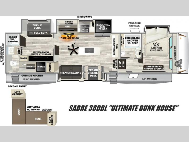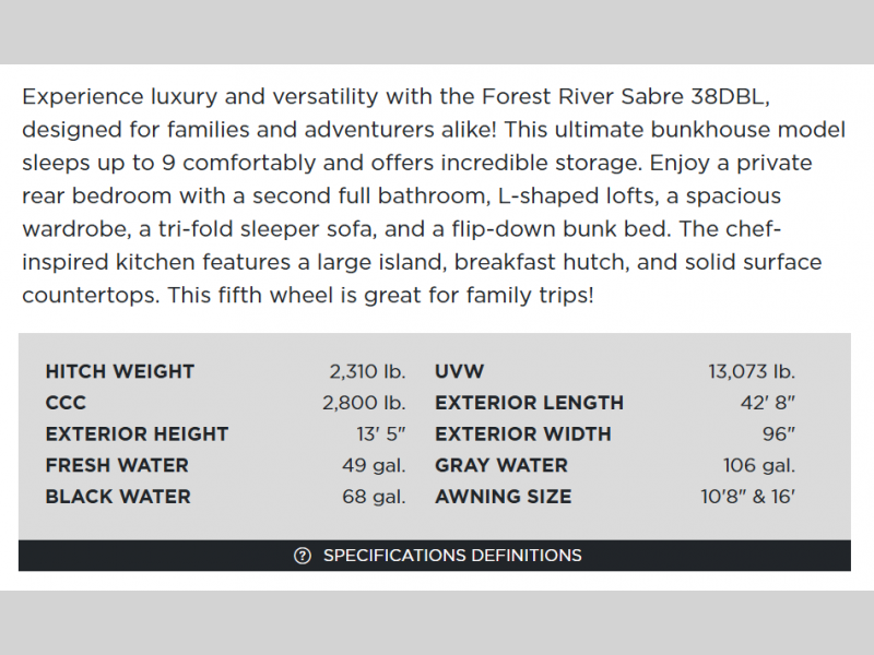 You will experience luxurious camping trips at an affordable price with any one of these Forest River Sabre fifth wheels! These models are durable and ready to travel anytime of the year thanks to features like the high-gloss gel-coat front cap with LED lighting, the PVC roof membrane, and the forced air underbelly with enclosed gate valves. The electric auto-leveling system makes setting up easy and safe, and the adjustable power awning with LED lighting will create an inviting outdoor living space. Each model includes a universal docking station which includes a black tank flush and an outside shower, and detachable and adjustable stable steps for you to enter and exit the unit safely. Inside, you will love the design of the ambient accent lighting in the living area, the real wood lumbercore cabinetry, and the linoleum flooring!