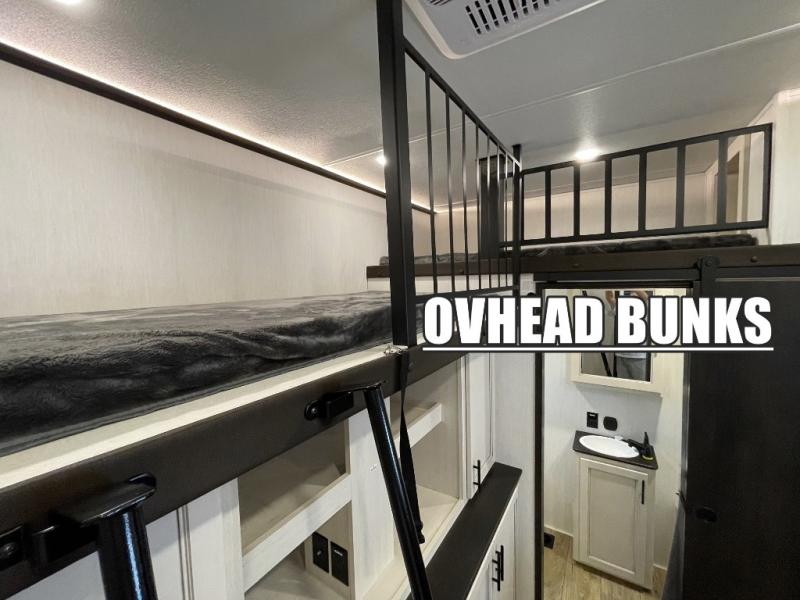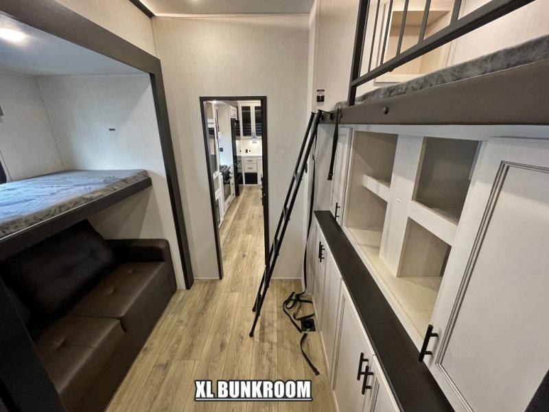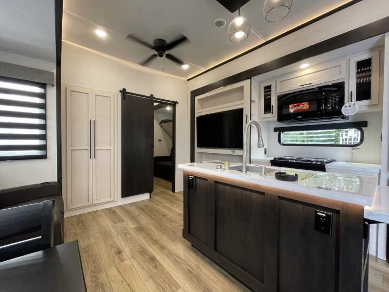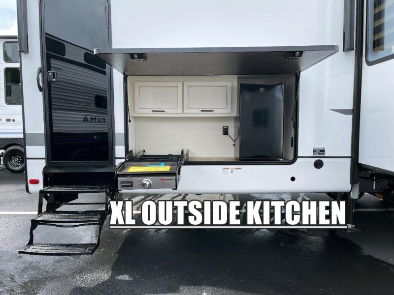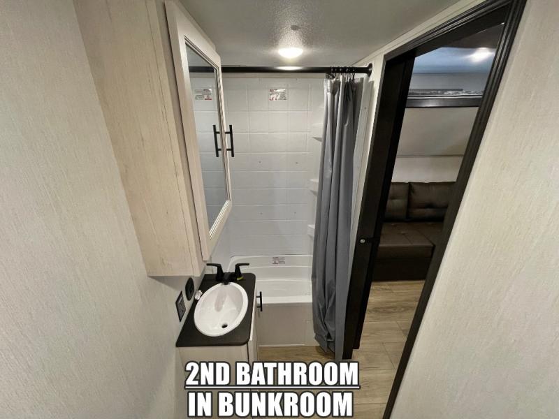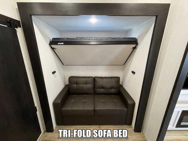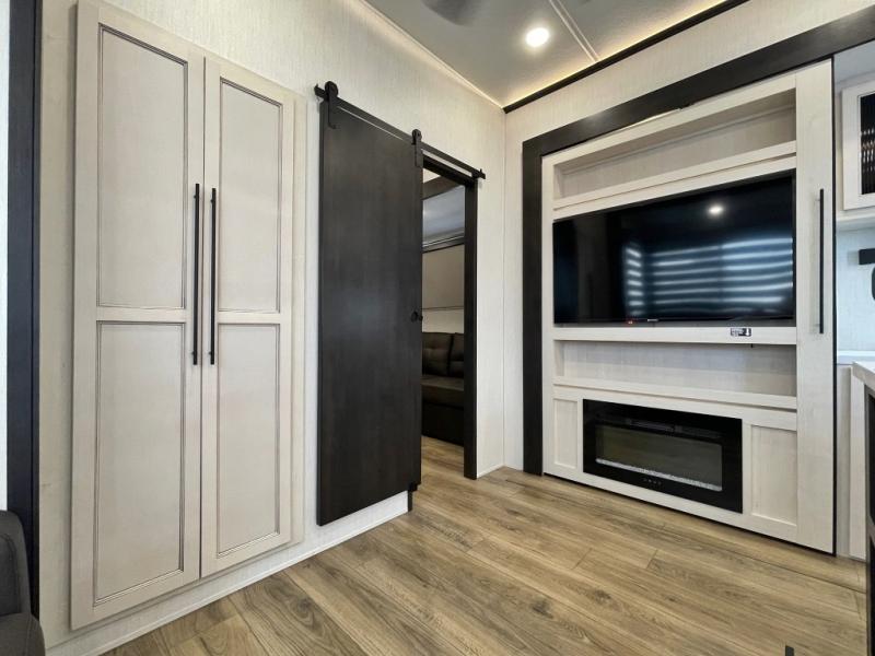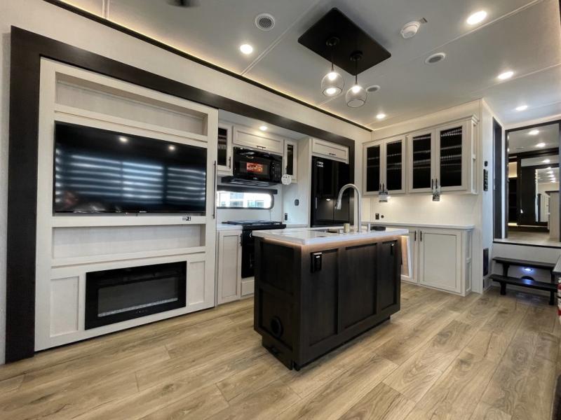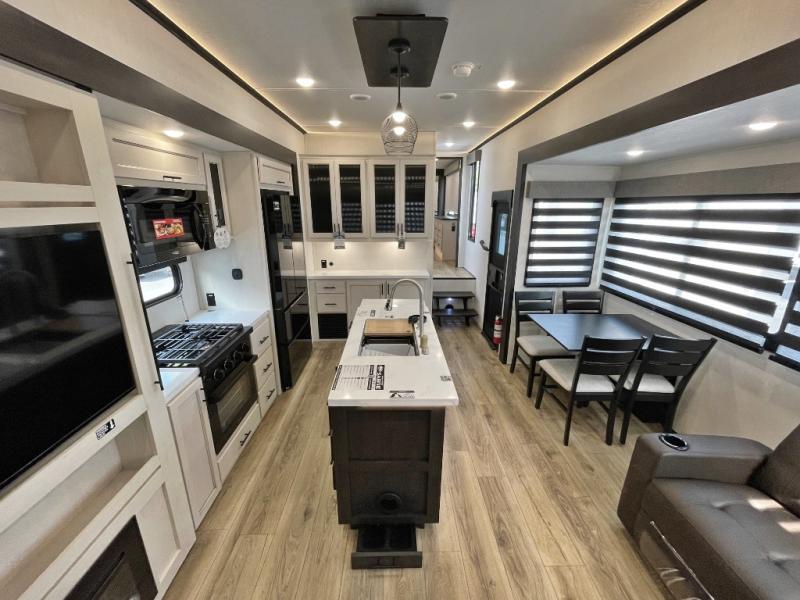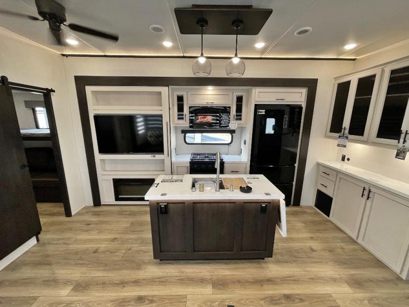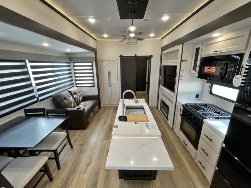 You won't believe all that this fifth wheel has to offer! Enjoy a good night's rest each night on the camper king bed slide in the front private bedroom which also has a front wardrobe with washer and dryer prep, and the rest of your group can sleep in the second bedroom. Inside this bedroom is a slide that houses a tri-fold sofa with a flip-up bunk above it, an entertainment center with storage, and a loft area above it all with two bunks and cabinets. The rear bedroom even has its very own rear full bathroom with a 36" x 24" shower to freshen up in each morning and one of the dual entry doors to the unit. The chef will enjoy using the kitchen island to prepare their best home cooked meals and everyone can gather together at the versatile dinette/desk conveniently across from the entertainment center with a fireplace.
